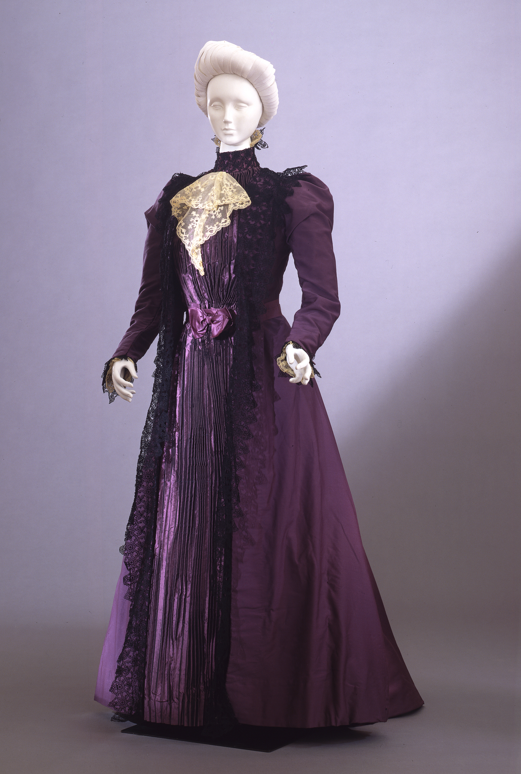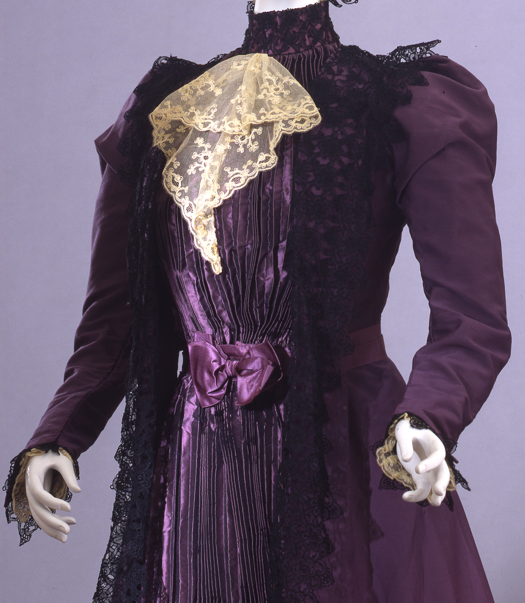 The domestic use of these dresses did not preclude their preciousness, as they were often fitted with a train and made with fine materials and careful details. In this case, the dress, which is made in purple wool-silk, opens up 'like a robe’ to show a pleated front panel in silk taffeta. Collar, lapels and cuffs are embellished with black and ivory machine-made lace, and the dress is tied at the waist by a satin belt. The volume of the sleeves, which is still concentrated on the shoulders despite abandoning the excesses of that period, allows to date the garment to the late 1890s.