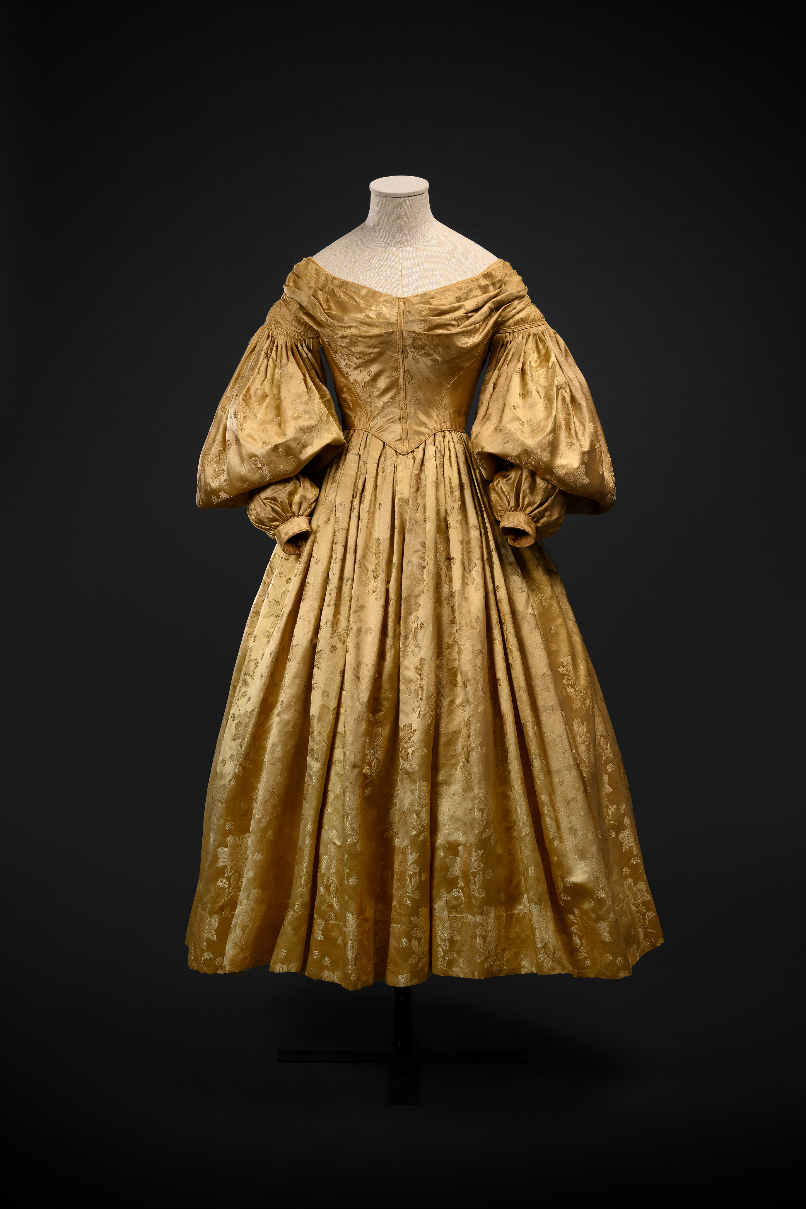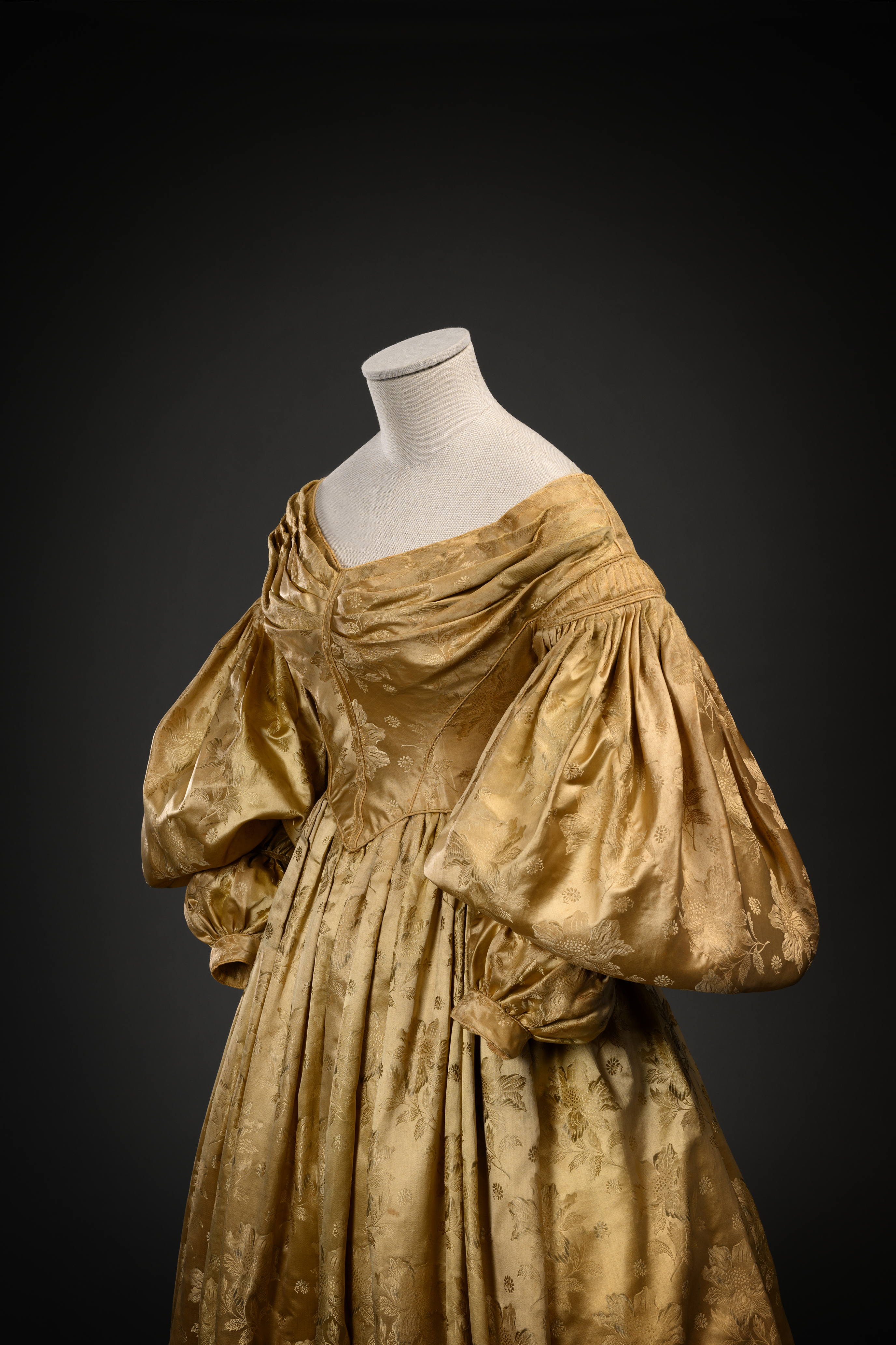Wedding gown in figured silk cloth on an old gold satin base with open peony and tiny daisy motifs. The bodice, trapezoid in shape with sides, a neckline and a pointed waistline, is gathered at the bust in soft, horizontal pleats with a vertical seam in the centre reaching down to the waist. The puffed gigot sleeves are fastened by straps of the same fabric with small buttons to fasten them. The skirt has soft folds reaching down to the ground. This gown belonged to Angiola Polese, who was born in Leghorn in 1808. It was made for her as a bridal gown when she wed Giuseppe Ascione in 1836.