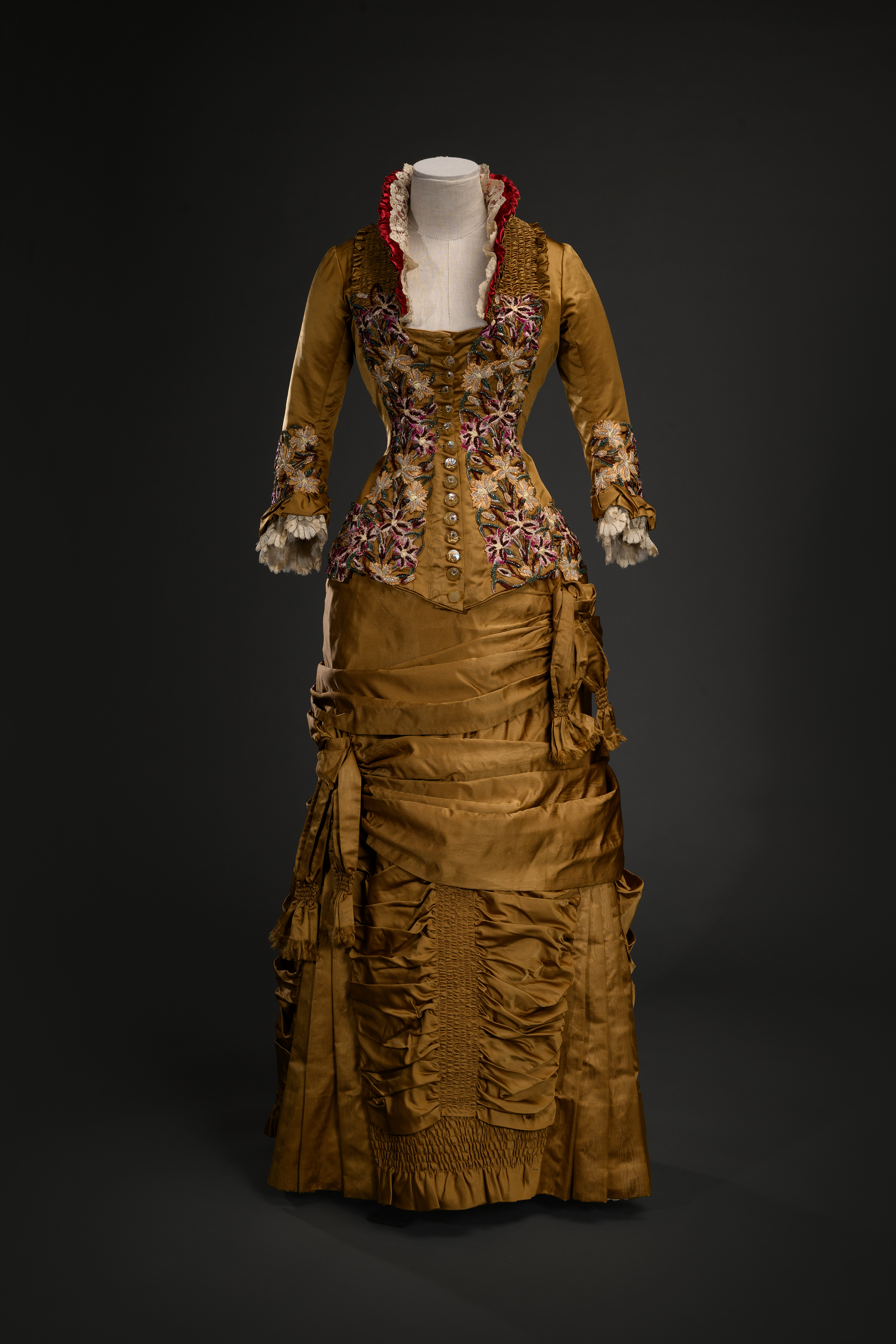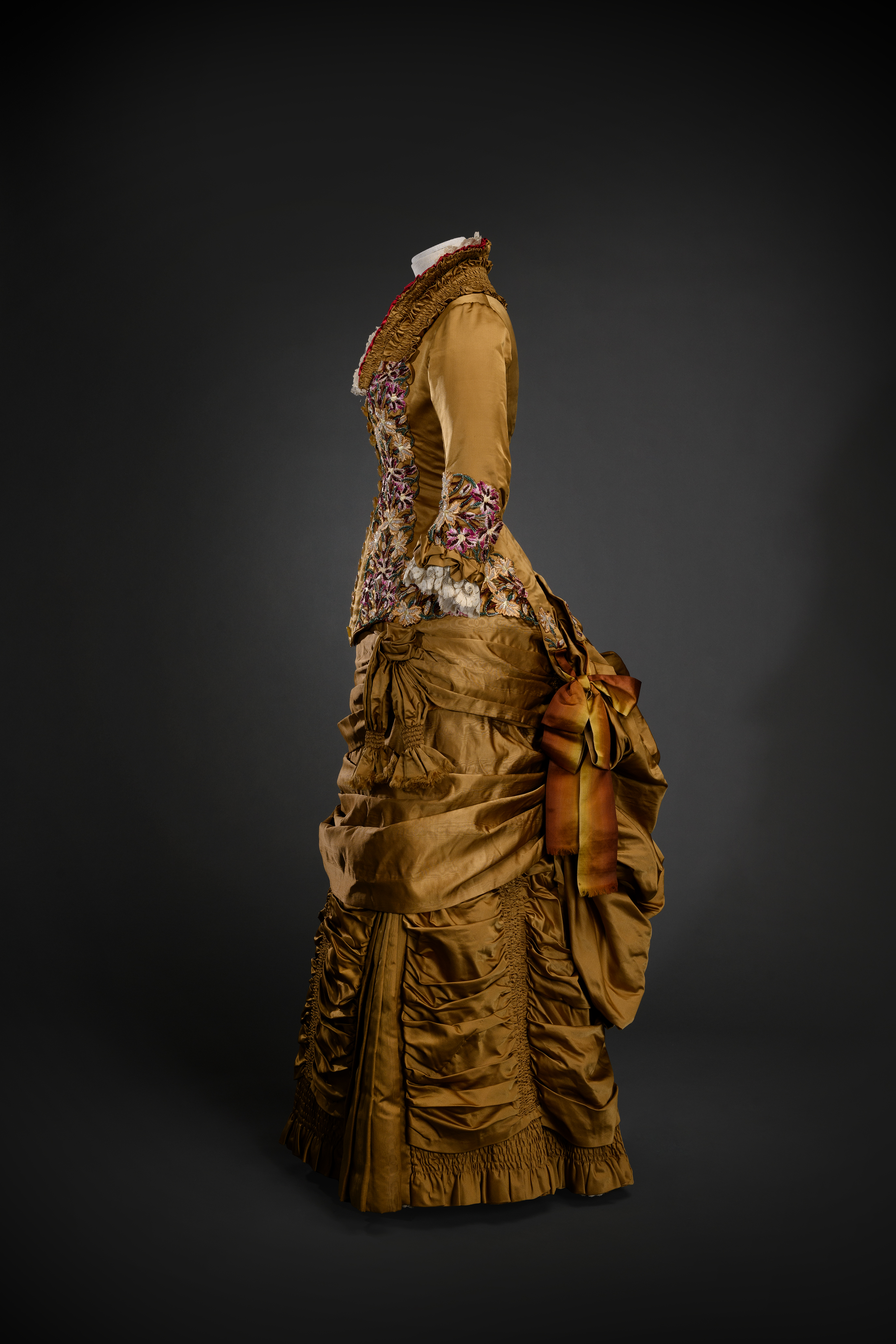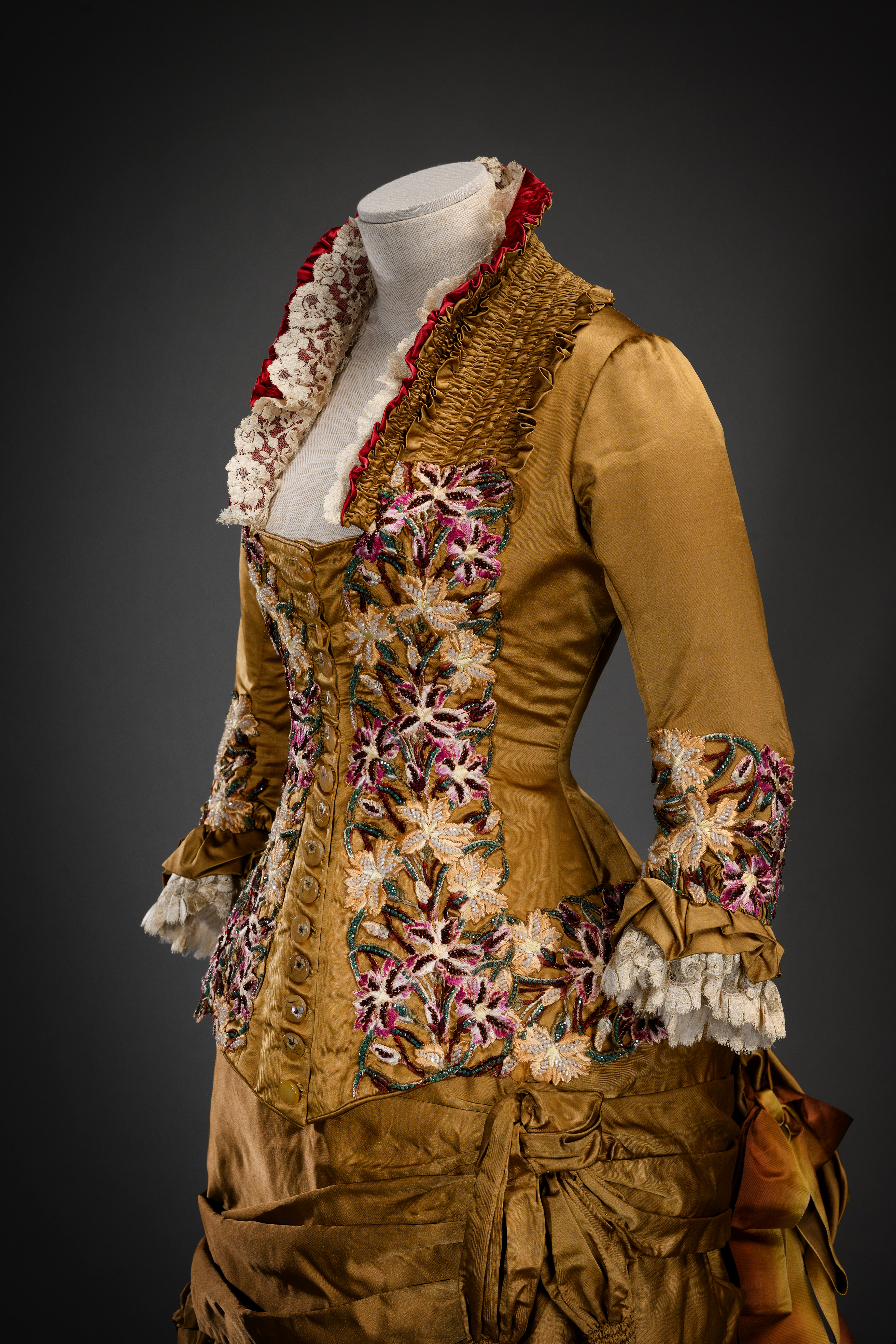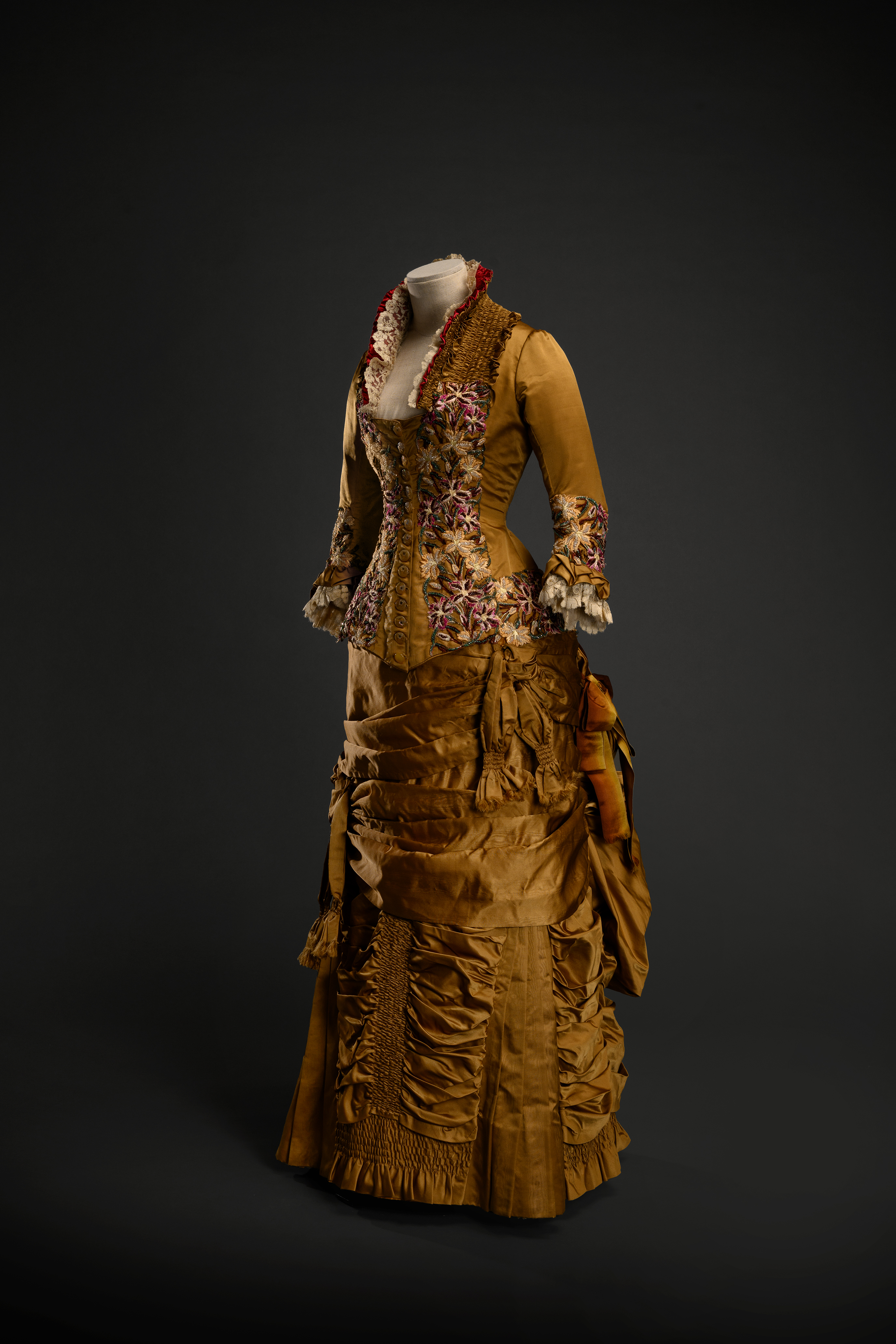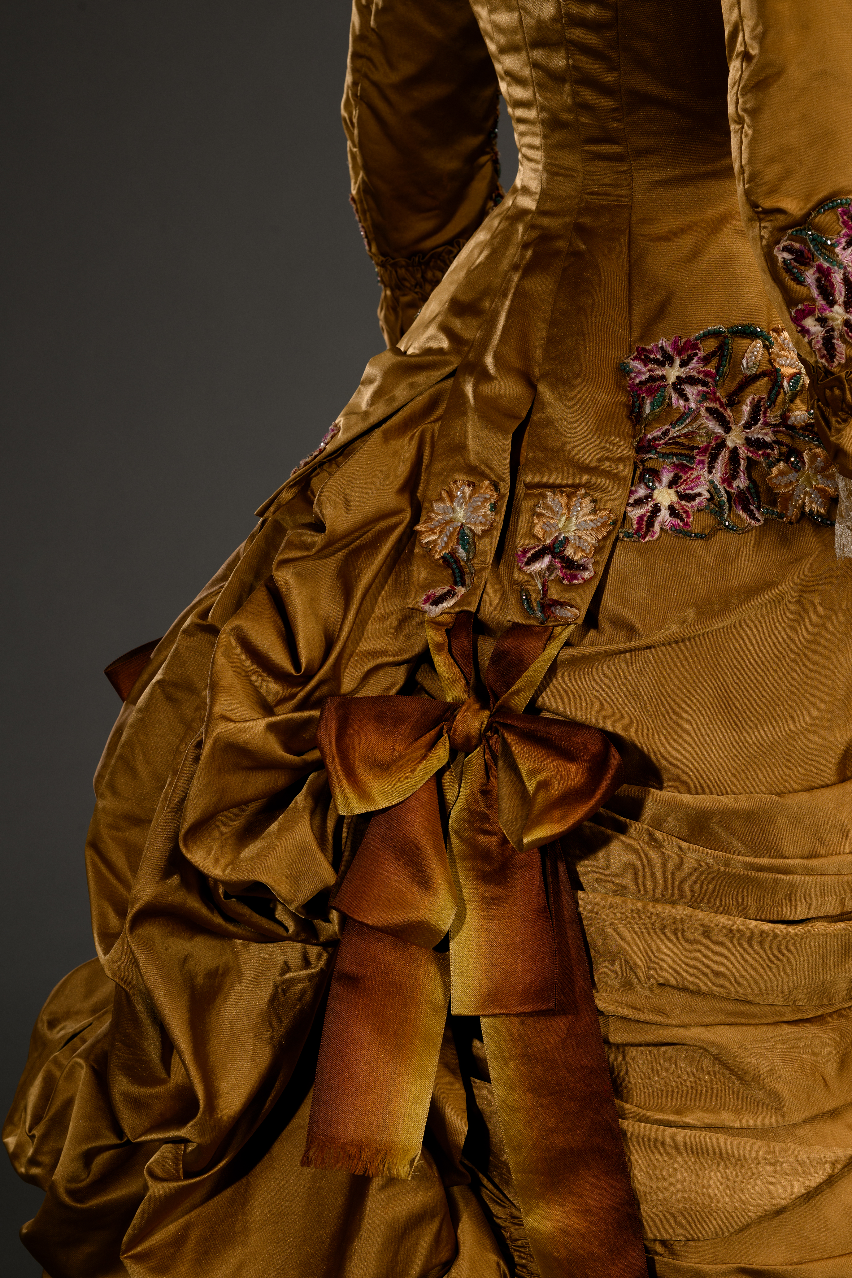 Two-piece yellow ochre moiré silk gown. The bodice, with nine whalebones, is close-fitting down to the hips and has a deep square neckline. It is fastened at the front by fifteen glass buttons painted with small violets. The sleeves, tight-fitting to below the elbows, end in a double organza and lace ruche. Two large bows emerging from the small panels of cloth on the back of the bodice are knotted on the back of the cloche skirt adorned with a horizontal band of drapery ending in falbalas and a fringe. The hems are dominated by tight polychrome silk embroidery with turquoise bead pearls in floral motifs. Smock-stitched inserts alternate with a combination of the various fabrics used in the skirt, in a juxtaposition typical of the exuberant ‘style tapissier’ that was so fashionable in the 1870s and ‘80s.