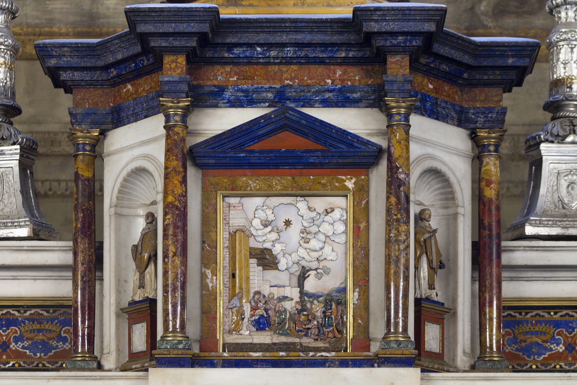 At the foot of an ancient ruined temple with Ionic columns are depicted the Madonna, seated with the Child on her knees and St. Joseph. In front of the Holy Family, the three dressed in splendid robes, present their gifts surrounded by other figures witnessing the event. The upper part of the scene is dominated by a glory of clouds and cherubs that frames the shining star that guided the Magi. The precious panel skilfully blends the two-dimensional stone inlay technique with that of the semi-precious stone relief technique used to render the architectural elements, the clouds and, above all, the figures in the foreground, composed of various elements in chalcedony, jasper, lapis lazuli, heliotrope, processed separately and then skilfully assembled to form the figures.