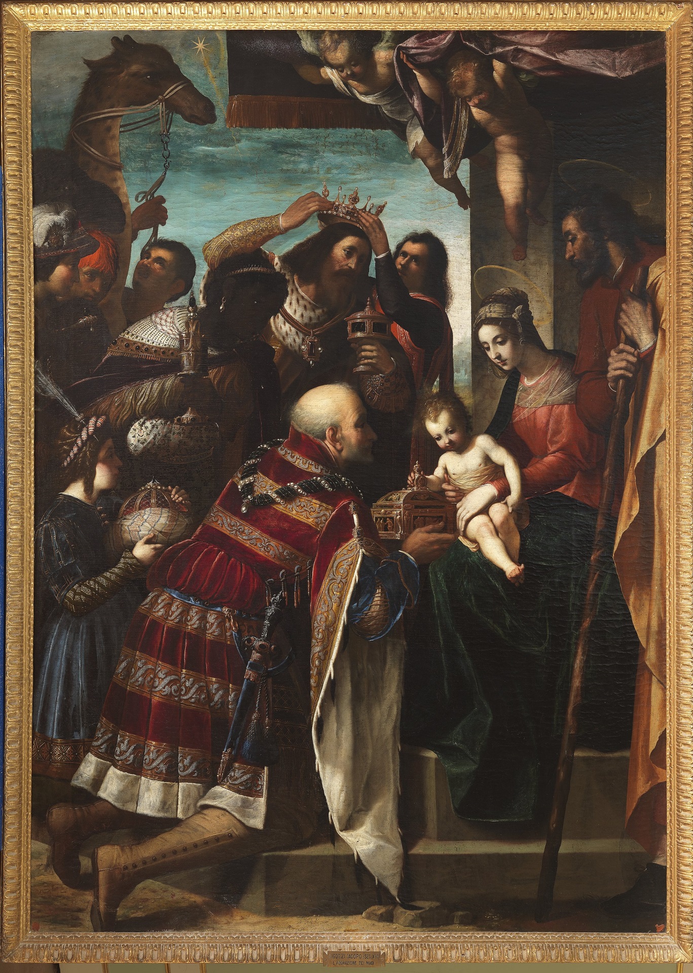 This is an en plein air scene, set against a background of sky with fading tones, dominated by a star that stands out like a jewel against the deep blue of the clouds. The Magi and their pages are arranged along two diagonal lines, meeting at the central group with the Virgin, Child, and St Joseph under an elegant canopy. The asymmetrical nature of the composition is based on a type that was widely used in the Veneto area, and also, in the last two decades of the century, by Carracci for the Bargellini altarpiece and the Madonna enthroned with Saints Matthew, Francis and John the Baptist (Dresda, Gemaeldegalerie). However, Jacopo Ligozzi did not share the same soft naturalism and the warm atmosphere of the Emilian artists: his is more of a static painting, with a bold mannerist impact, where the protagonists are substantially blocked in their pose, taking part in the sumptuous exhibition of fabrics, wall coverings and jewels that the painter studied carefully in his book of sketches for costumes and fabrics.