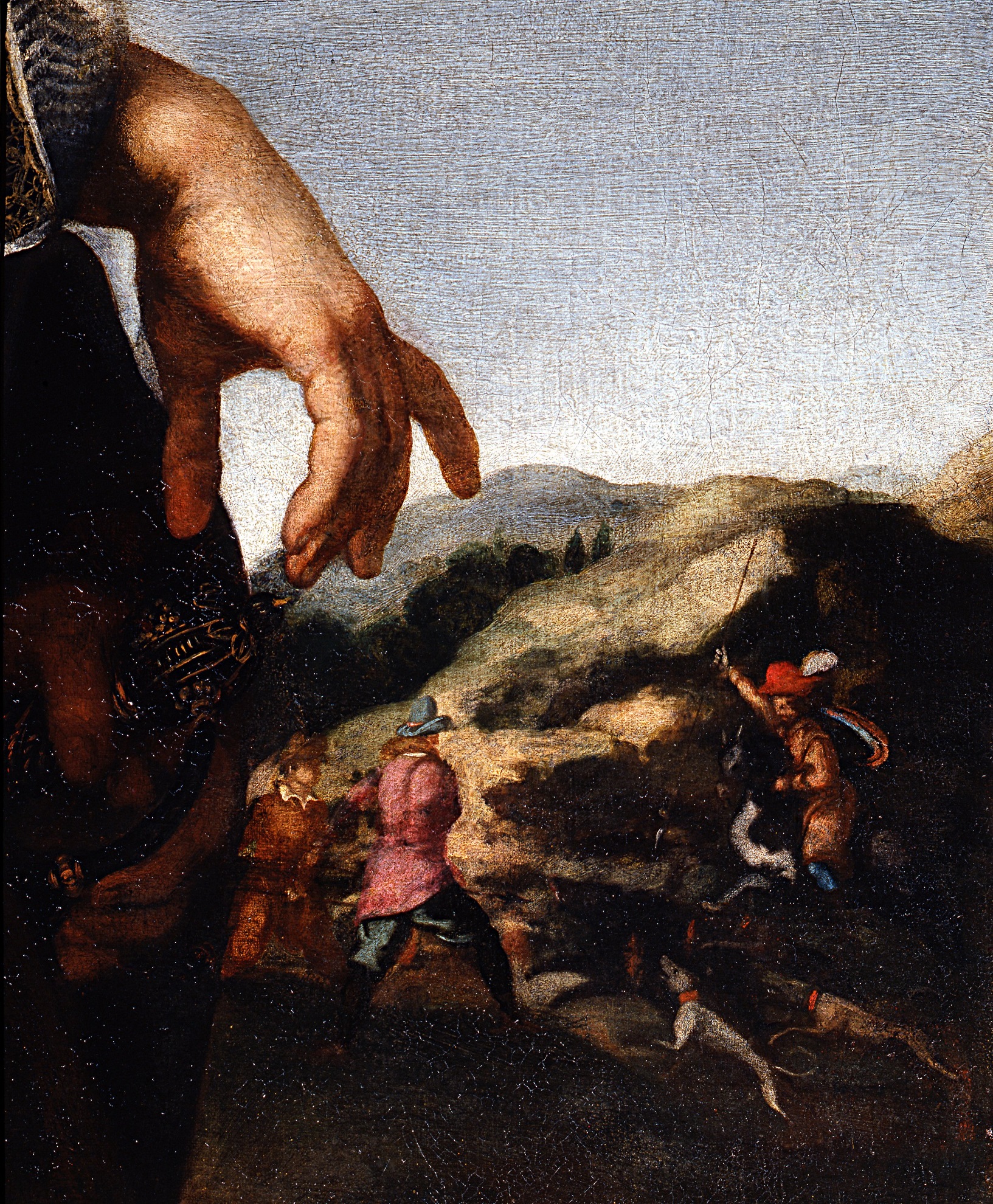 He is shown in this painting with a three-quarter pose, looking at the onlooker, while showing off his elegant official clothes and the cross on his chest to indicate his ranking as a knight of Malta. He is shown against a countryside backdrop and with his right hand, he seems to be pointing to the group of men in the back, intent on their hunt.