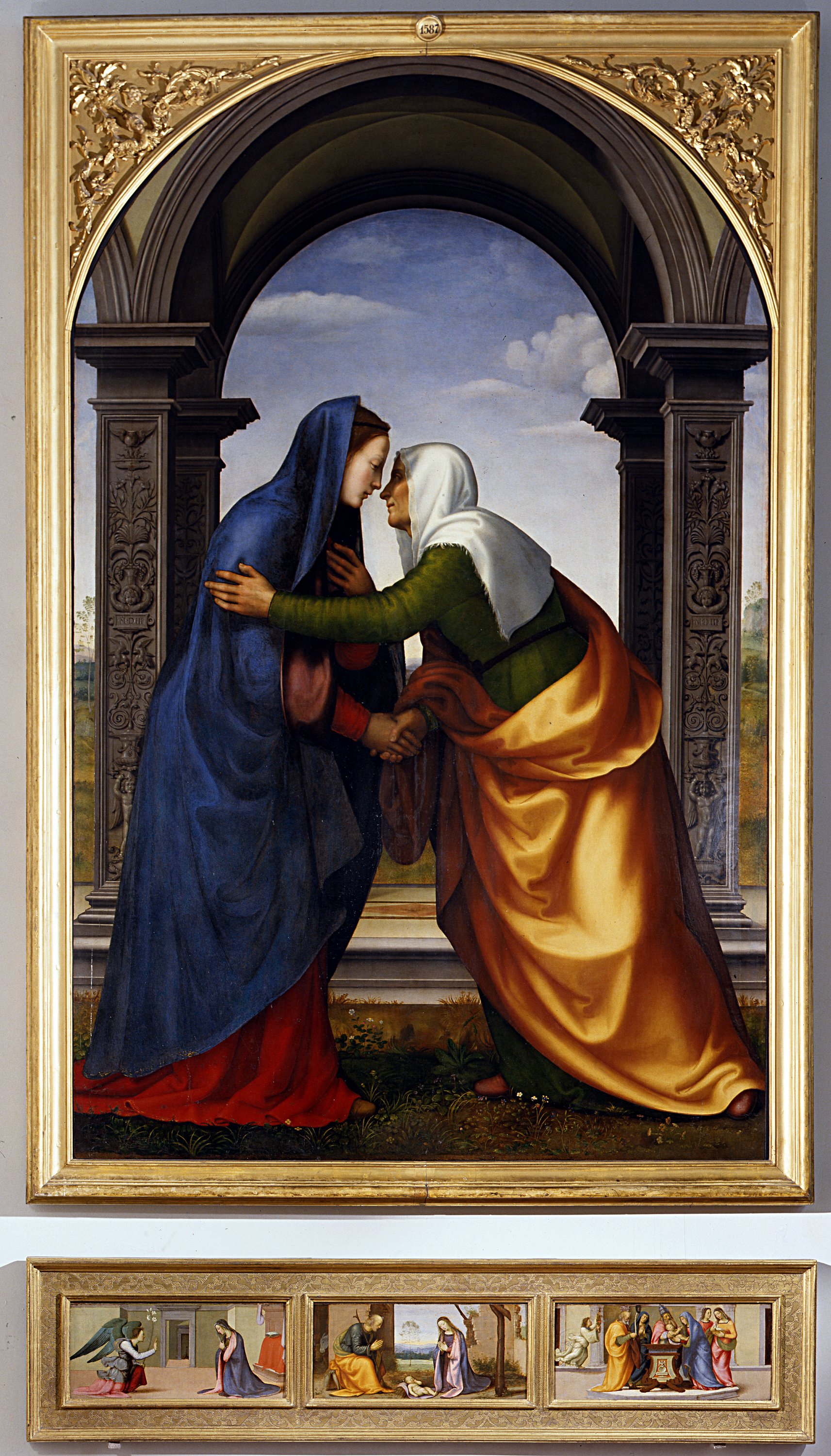 The meeting between Mary and her relative Elizabeth, future mother of John the Baptist, is taking place in the still, ultra-clear atmosphere of a sunny morning. The two women are embracing on a flowery lawn against the backdrop of a wide pietra serena arcade which follows the profile of the panel and rests on pilasters decorated with elegant panoplies amongst which the date 1503 is visible, the year the work was painted.