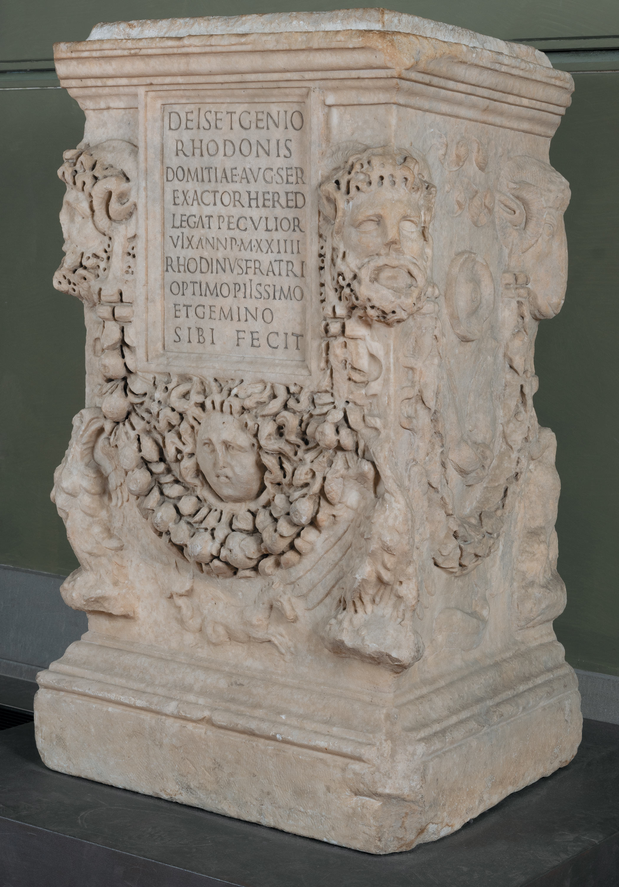 The altar is characterized by a very elaborate bas-relief decoration, with festoons marking out the space on the short sides, anchored respectively to protomes of a ram and heads of Jupiter Ammon. These lead towards the main facade of the monument, where the festoon sits above a seahorse. On top, a splendid Gorgon's head appears to support the inscribed panel, with the dedication in honor of the young deceased man, Rhodon, slave of Domitia Augusta, commemorated by his brother Rhodinus (CIL VI 8434).