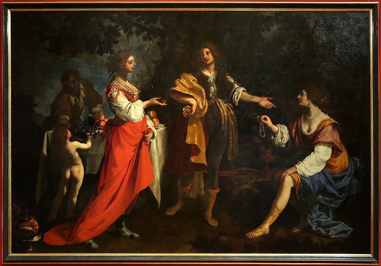 The en plein air settings give the scene its pretty rural tone so dear to Florentine painters in the 1630s, impressed by the new themes from Rome that arrived in Florence via the city's artists and by means of works added to the Medici and other noble collections. Also typical of Florentine traditions and of this painter in particular, is the taste for sophisticated formal solutions in the choreography and theatrical pose of the figures, as if imagined on a stage, in elegant costumes with carefully studied colours.