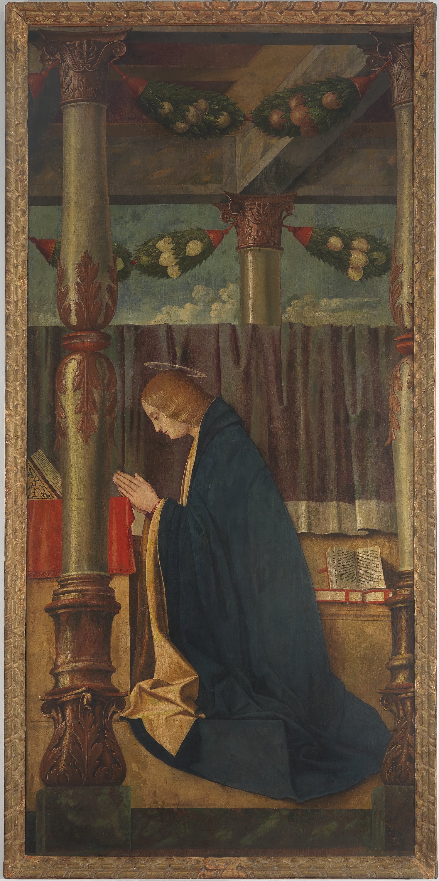 This canvas is the right-hand panel of a group depicting the Virgin Annunciate. Here she is kneeling before a sort of altar on which a book rests. She has her head humbly bowed and her hands are clasped as she expresses her acceptance of divine will. Other books in the background, exclusive precious items belonging to the wealthier classes and the clergy, indicate that Mary is an educated woman.