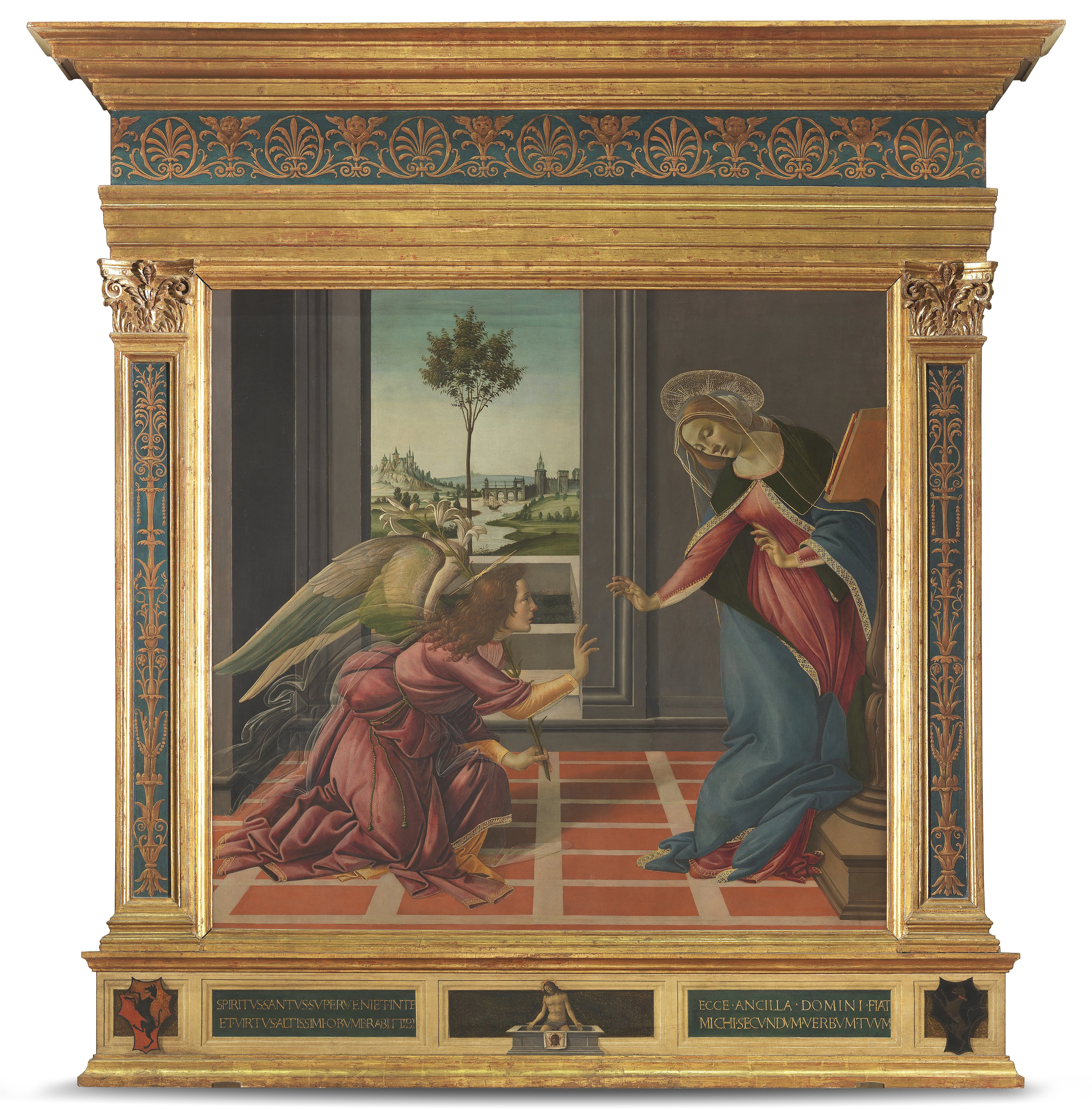 This panel was commissioned from Sandro Botticelli in 1489 by Florentine moneychanger, Benedetto di ser Francesco Guardi for the family chapel in the church of Santa Maria Maddalena, in borgo Pinti, Florence. The essential nature of the scene, almost bare of furnishings, the sober clothing of the archangel Gabriel and Mary, featuring a limited use of colour tones and decorations, the accentuated, almost theatrical gestures of the subjects, reflect the search for simplicity and the religious fervor that had become established in the sermons of Dominican monk, Girolamo Savonarola. There are some of the usual elements of Marian symbolism, such as the opening in the wall that suggests a door of heaven to Mary, and the walled garden visible in the background, an emblem of Mary’s virginity. The painting has its original frame, painted at the bottom with the emblems of the customer and the figure of Christ in pietà. There are also two inscriptions in Latin, taken from the Gospel of St Luke, alluding to the incarnation of God’s son in Mary’s womb.