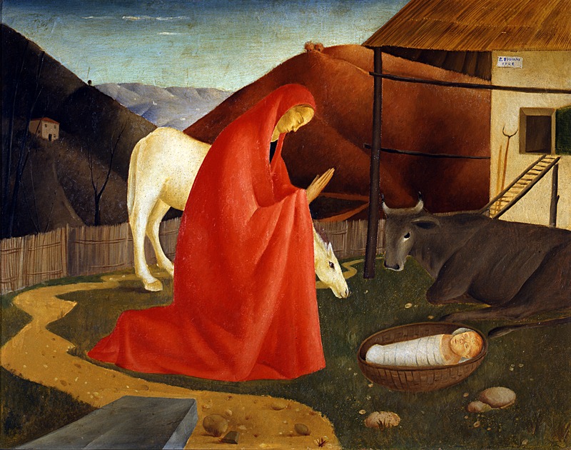 In the 1920s, Pistoia experienced an intense artistic season thanks to a group of talented young people, who formed the group of the "Cenacolo". Having rejected the decorative stylistic elements of the local school of painting, they found in the architect Giovanni Michelucci a mentor who trained them in the exercise of drawing. One of these young people was Pietro Bugiani who, following Michelucci’s advice, began drawing on his frequentation of the Florentine art scene and the knowledge gained during fruitful stays in Turin, where he met Felice Casorati, and in Rome. Returning to Pistoia in 1927, the artist soon painted a group of crucial landscapes immersed in an enchanted atmosphere. His “Natività” is a holy version of this theme. The little hut and the farmhouse on the hill are in fact the same protagonists as those of the contemporary views of the Pistoian countryside, as well as the clear light which fades here in the twilight, underlining the emotion aroused by of the miracle of birth, both human and divine. The sparseness of the overall effect, which is contrasted by some meticulous attention to detail, shows Bugiani's compliance with the lesson of the ancients and in particular Giotto and Beato Angelico, within a vaster movement that aimed to recover the so-called primitives, headed by the magazine "Valori plastici", which had a particularly strong following in Tuscany. Indeed, from the very beginning, Natività was extremely popular: Giò Ponti reproduced it in "Domus" in 1929, praising the formal qualities and the clarity of the drawing in conjunction with Michelucci's ideas, and philosopher Lanza del Vasto and his friend, painter Giovanni Costetti, saw in it a close consonance with the values of spiritualism, of which they were the bearers. In fact, it was no coincidence that Natività became one of the leading works of the exhibition organised in 1931 at the Porza Gallery in Berlin by Lanza del Vasto, which exhibited works by a series of artists who shared the same pursuit of an interior art that aspired to higher values. "They acclaimed it as a revelation, as the new Beato Angelico", wrote Lanza del Vasto on that occasion, reporting the comments of the critics to the owner of the work, Camilla Roatta, whose father had bought it directly from Bugiani in 1929. Roatta herself sold it in 1986 to the Gallery of Modern Art in a moment of critical rediscovery of the so-called school of Pistoia, whose most prominent researchers were undoubtedly the artist and Marino Marini.