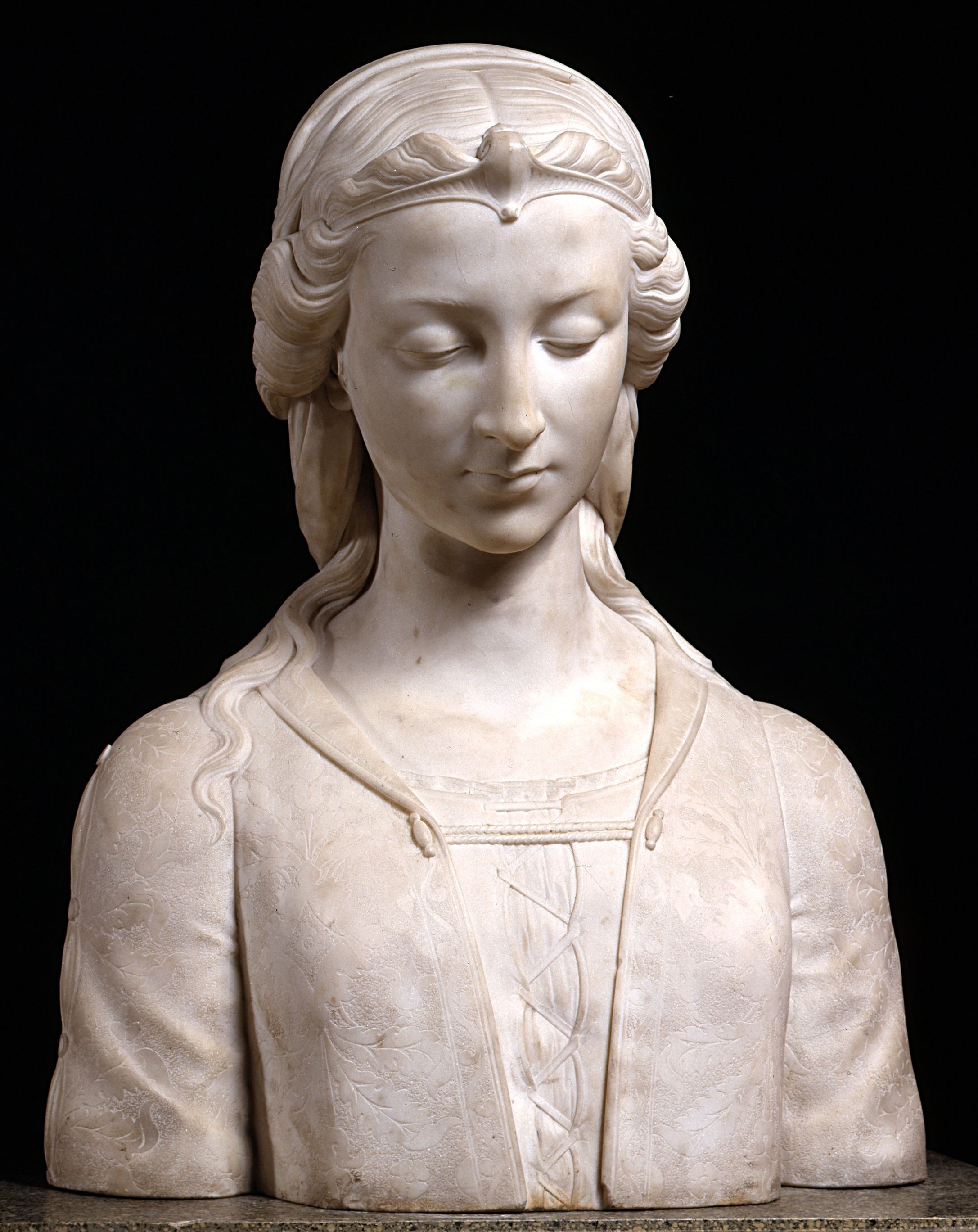 The sculptor, who passed away before his time just like the gentle Piccarda, was originally from Fiesole and worked as an apprentice in the workshop of Pio Fedi. He taps into the repertory of the famous masters of the Renaissance, such as his countryman Mino, explicitly referenced in this very delicate bust. A very gifted, precocious sculptor, he began working at an early age for an art trader who commissioned him to reproduce ancient sculptures. Through this exercise, which he performed with meticulous precision, he became familiar with the work of the masters of the 15th century which he reinterpreted in sculptures like this one, adding that explicit grace and antiquated interest in the details of the costumes typical of 19th century style, such as the stylish hairstyle and the splendid textured fabric of the gown.