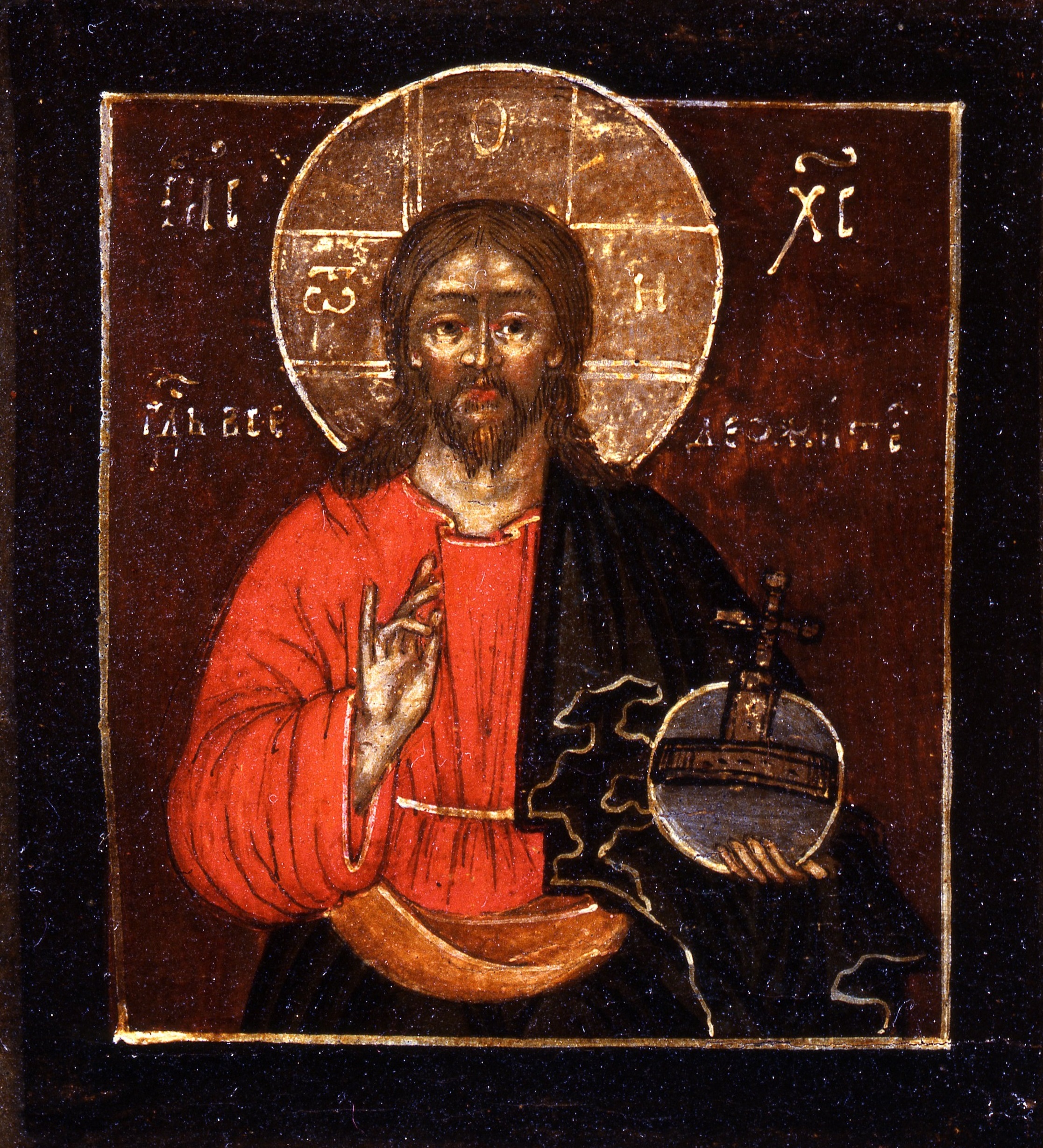 Jesus Christ is shown here in accordance with the Pantocrator iconography (omnipotent, creator and lord of the world) in the act of blessing, with his right hand, and holding an orb and cross as an emblem of his power over the creation in his left hand. An inscription identifying the subject as Christ Pantocrator is visible in the background with the spelling of the name Jesus (IИС Iisus) reflecting the style brought in by Russian church patriarch Nikon (1605-1681), promoter of ecclesiastical reforms, which were met with hostility by certain factions of believers. The position of the blessing hand is in Byzantine style with the fingers forming the letters IC XC (Jesus Christ).
