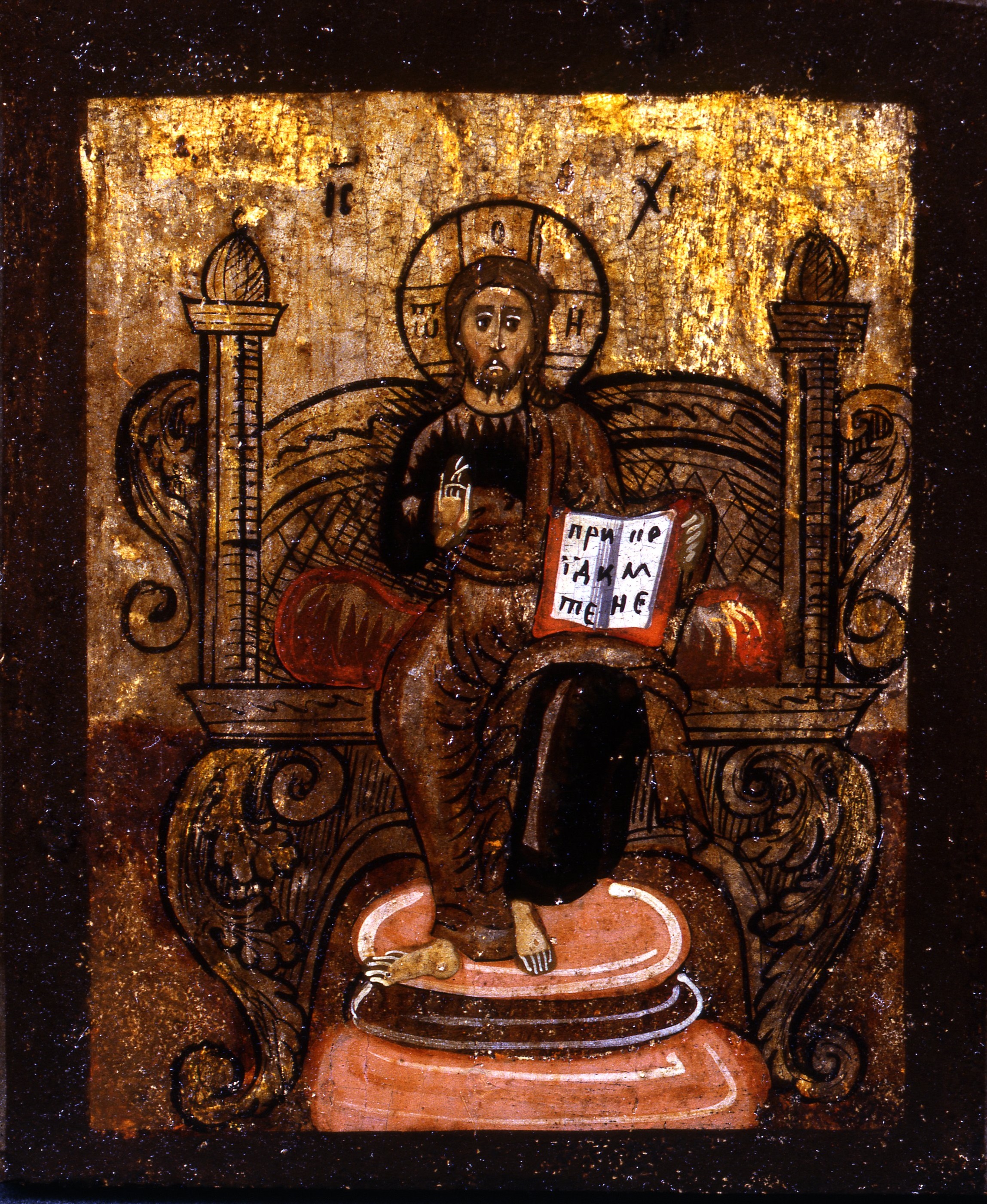Jesus Christ sitting on a magnificent throne with an oval-shaped pedestal before him on which he is resting his bare feet. Christ is in the act of blessing while, in his left hand, he holds an open book showing a passage from the Gospel of Matthew (ПРИ//IДИ//ТЕ // КО // М//НЕ; Come to me, Mt. XI (28).