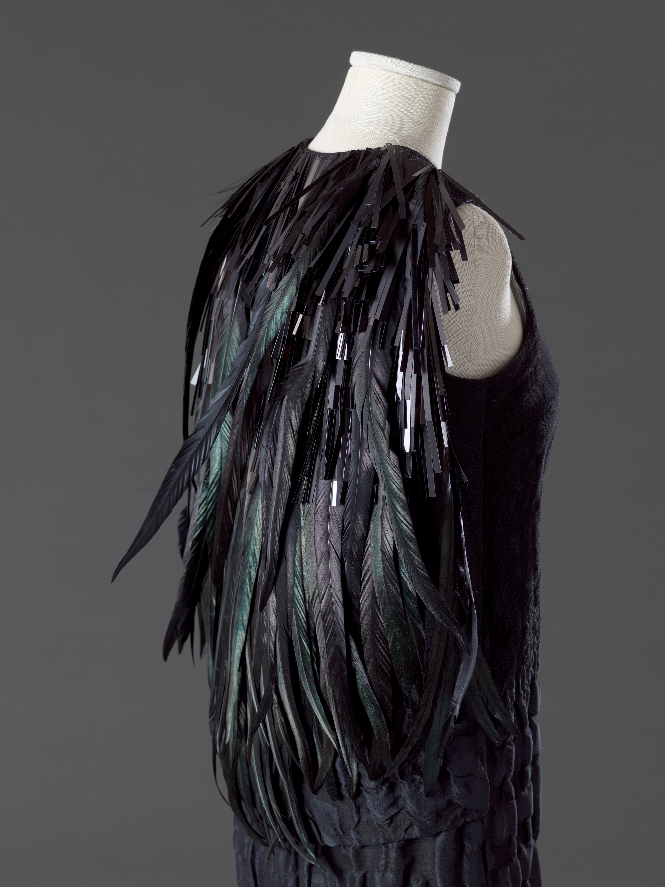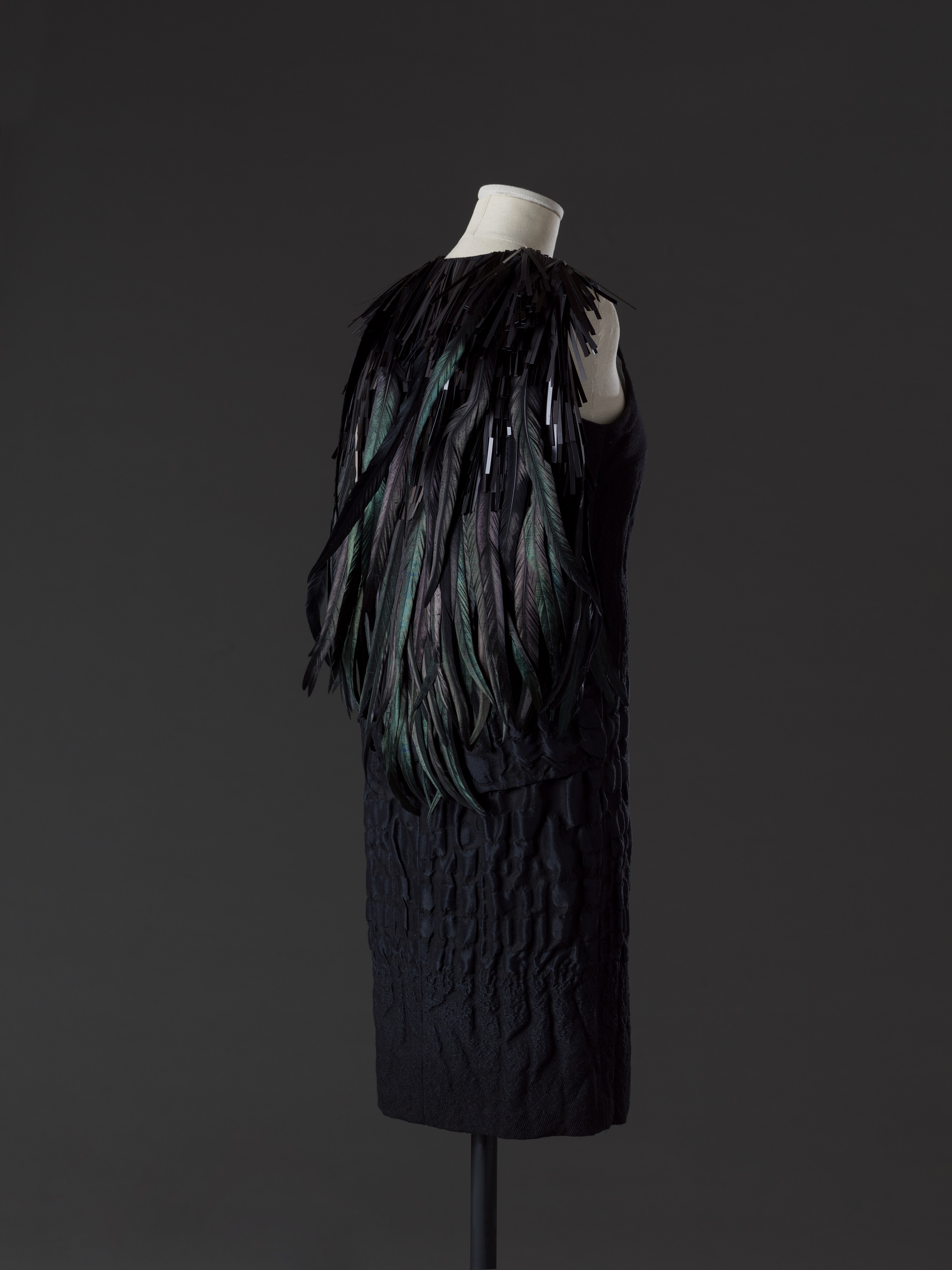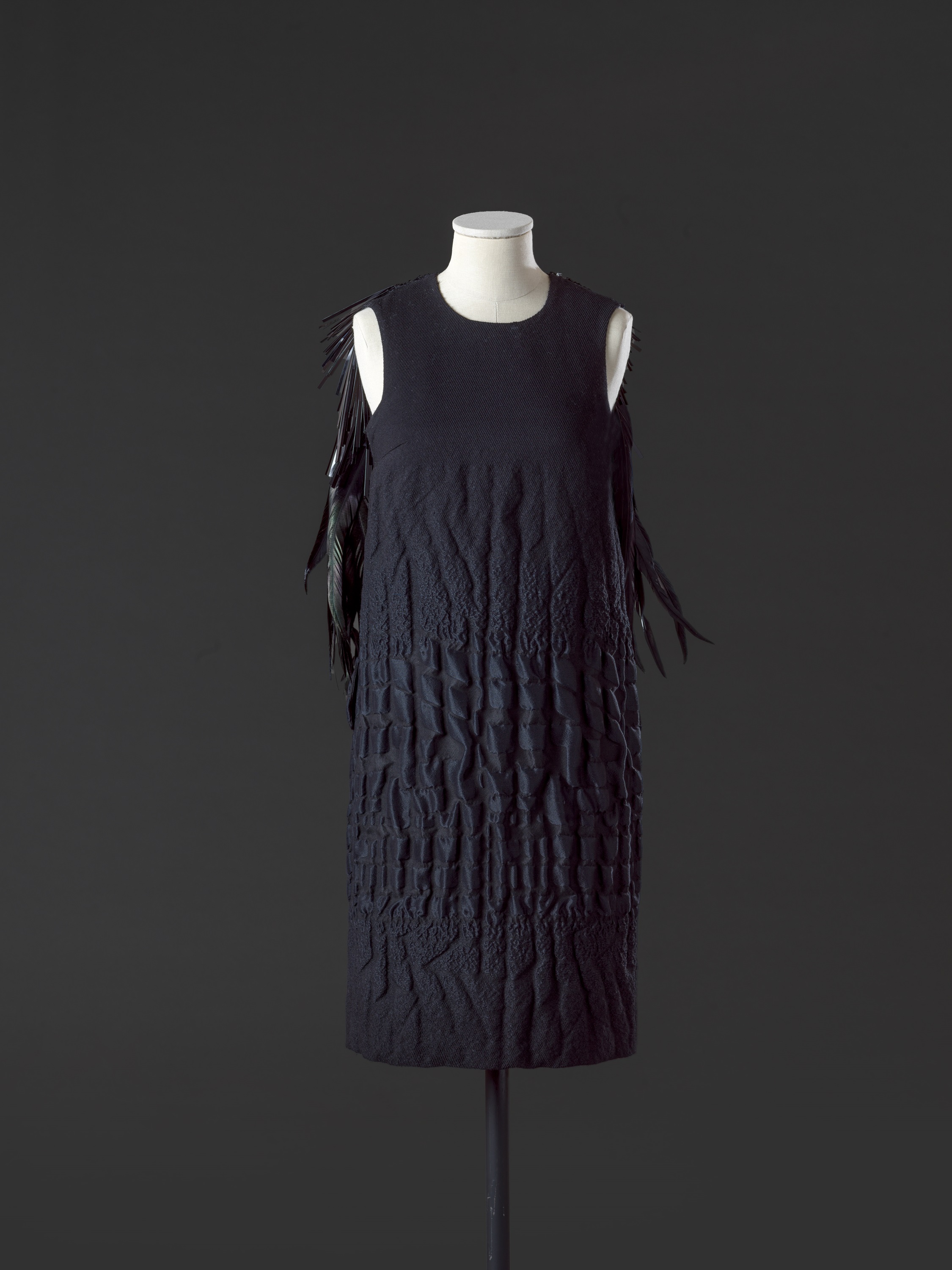 Cocktail dress, short, slightly tight-fitting, in the form of a black wool twill with embossed of embossing. Back decoration of rooster feathers. Black satin lining. Exhibited in 2012 at the Metropolitan Museum in New York, on the occasion of the exhibition "Schiaparelli & Prada Impossible Conversations". The dress, poised between simplicity of line and heterogeneity of materials, refers to the minimalist character of the early 1990s collections and the suggestions of the 1920s revisited by Miuccia Prada (Milan 1949) in perfect perfect postmodern style.