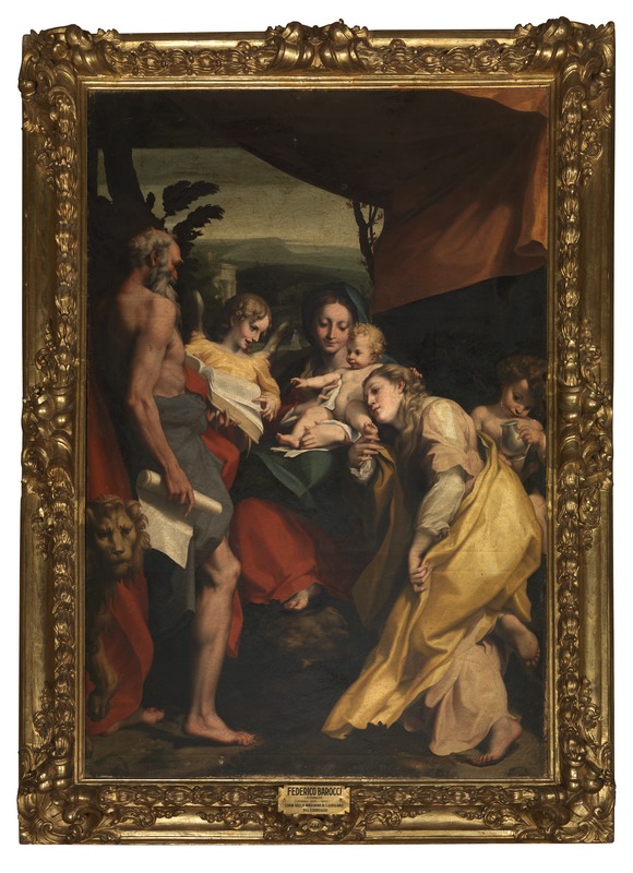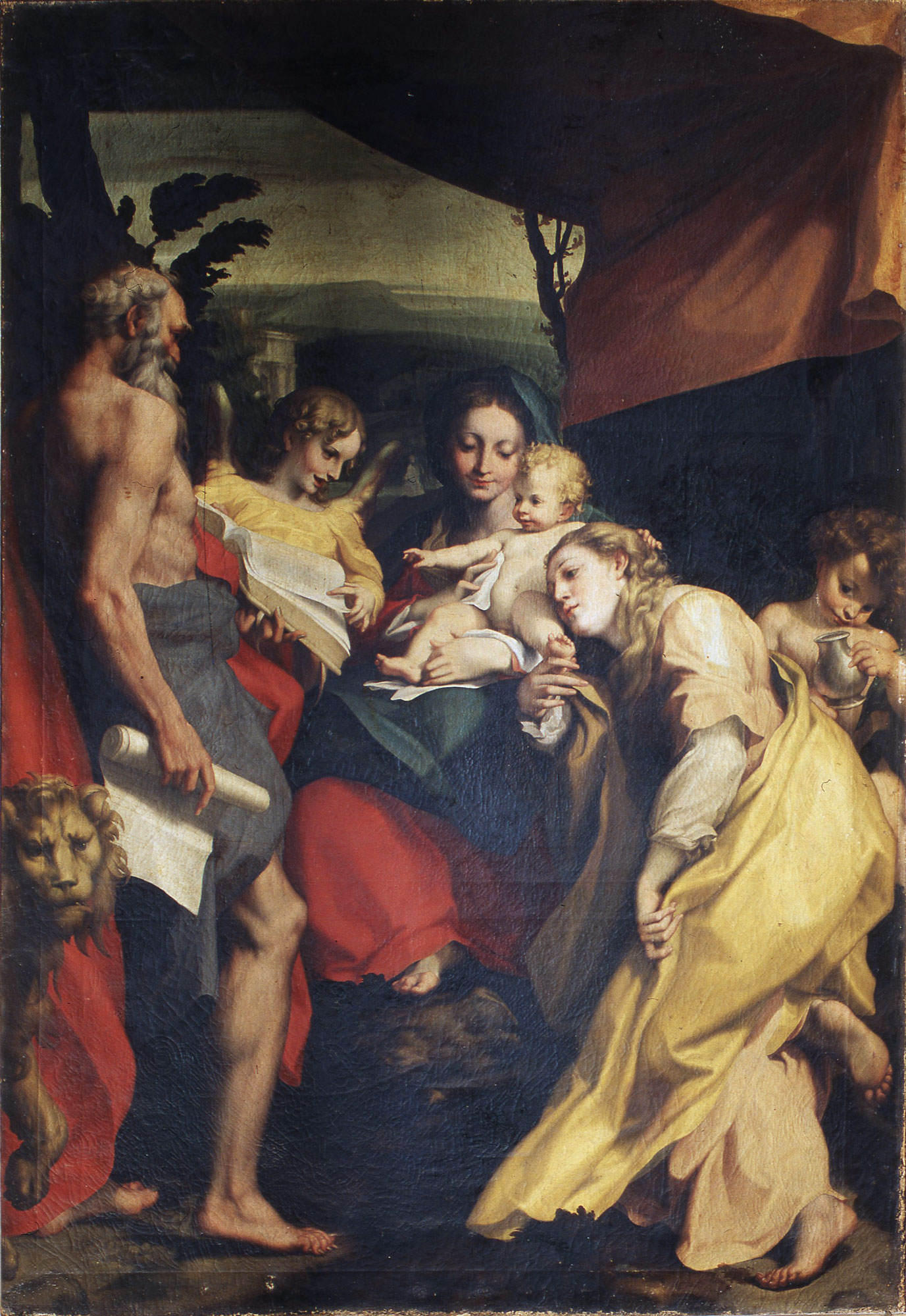 The painting is a faithful reproduction of the Madonna and Child with Saints John and Jerome, Mary Magdalene, and an angel, painted by Correggio for the Bergonzi Chapel in the church of Sant'Antonio Abate in Parma. The painting is a highly celebrated masterpiece and undoubtedly the most replicated of Allegri's works. It has been the subject of passionate disputes between princes and collectors throughout Europe. Even Grand Duke Ferdinand de Medici – who had studied and admired the painting during a trip to Parma – tried in vain to buy it by putting pressure on the Bergonzi heirs. The heirs’ were unwilling to part ways with the painting, and so de Medici instead focused his attention on a reproduction that must have been pointed out to him by one of his many brokers. Said reproduction was easier to acquire as it was located on the high altar of Santa Maria dei Servi Church in Montepulciano, patronage of the Nobili family. The negotiation – documented in detailed correspondence between Ferdinando, the Prior of the Servite Order and the Marquis de' Nobili – was successful, and by 1699 the painting had entered the Apartments in Pitti Palace. Ferdinando was so enthusiastic about the painting that he wrote to Niccolò Cassana, his painter and trusted advisor, to say: "I have the reproduction of the Correggio painting I told you about, which is not by Vanni, but by Baroccio. It is very beautiful and Ugolino, who is familiar with the original, says that it is a very good reproduction and even improves on the original in some ways. Some of the brushstrokes on St. Jerome’s leg – which were removed by a French monk while cleaning the painting – appear in this reproduction. Every single brushstroke. It is essentially another original". This letter adds weight to the belief that the painting is by Barocci, the name under which it is listed in all inventories and in the Gallery’s earliest guidebooks. Specialists have, however, expressed some concerns. The firm, steady painting techniques and the bright strokes of yellow, red and blue are not entirely in keeping with the Urbino painter's painting style. In fact, the techniques bear more similarities to Raffaello Vanni’s style, who was the son of Francesco and whose workshop also specialised in producing and selling reproductions.