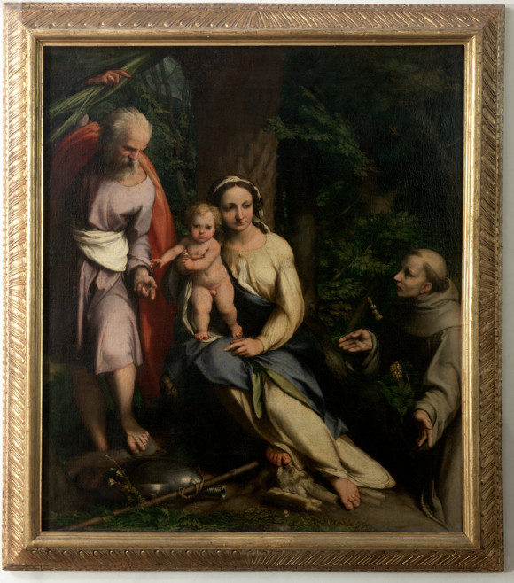 Rest on the Flight into Egypt with St. Francis was commissioned in 1520 ca. by jurist Francesco Munari – affluent jurist and a man of great culture – for the family chapel of the Immaculate Conception in the Church of St. Francis in Correggio. For this small altarpiece, Correggio – the most important Renaissance painter of the school of Parma – draws inspiration from a miraculous episode narrated in the apocryphal gospel of pseudo-Matthew: Mary stopped to rest under a date palm and, seeing it full of fruits, she asked Joseph to pick some. However, considering the fruits were too high to reach, Joseph replied they should rather think about finding some water. Jesus then asked the palm to bend its branches so they could refresh themselves with its fruits, and at its roots there appeared a spring of clear water. Correggio paints the moment when Joseph, still holding a branch, offers Jesus some fruits. The intimate dimension of the event is rendered in the serenity of affections within the family group in everyday life, amidst luxuriant natural surroundings (in this case the welcoming shade of the palm tree and of the oak grove). Correggio’s style merges Leonardo’s expression of the variety of affections with Raphael’s classical harmony. The Child, standing on Mary’s knees, holds out his hand to take the fruits, but his intense gaze is turned towards the observer. The Virgin, universal mediatrix, is seated under the palm tree and looks to her left towards Saint Francis including him in the life of the group, though chronologically extraneous to the narrative. Its presence is justified both as the namesake saint of the patron, Francesco Munari, and for the church designation, belonging to the Franciscan Order. The iconographic choice of this narrative theme for an altarpiece is infrequent, and it can seem unrelated to the Immaculate Conception to whom the chapel is dedicated. In reality, through the symbolism of the palm that has a central position in the painting (at least until the Seicento it was in fact known as “Madonna of the Palm Tree”) the Rest on the Flight into Egypt is strictly related to this theme. The palm was considered a symbol associated with the Virgin Mary by virtue of a verse in the Song of Songs (7, 8): “your stature is like that of a palm tree, and your breasts like its clusters of fruit”. It is also emblematic of martyrdom and glory, referable to Jesus. The palm buries its roots in the purest water, it never dries up and it provides shelter: it represents perennial life, virginity, maternity, and therefore the Immaculate Conception of Mary. The work, sold by the Franciscan friars to duke Francesco d’Este in 1638, was acquired soon afterwards by grand duke Ferdinando II de’ Medici in exchange for the Sacrifice of Isaac by Andrea del Sarto (now in Dresden). The small altarpiece immediately hung in the Tribuna of the Uffizi, among the masterpieces of the Medici collections.