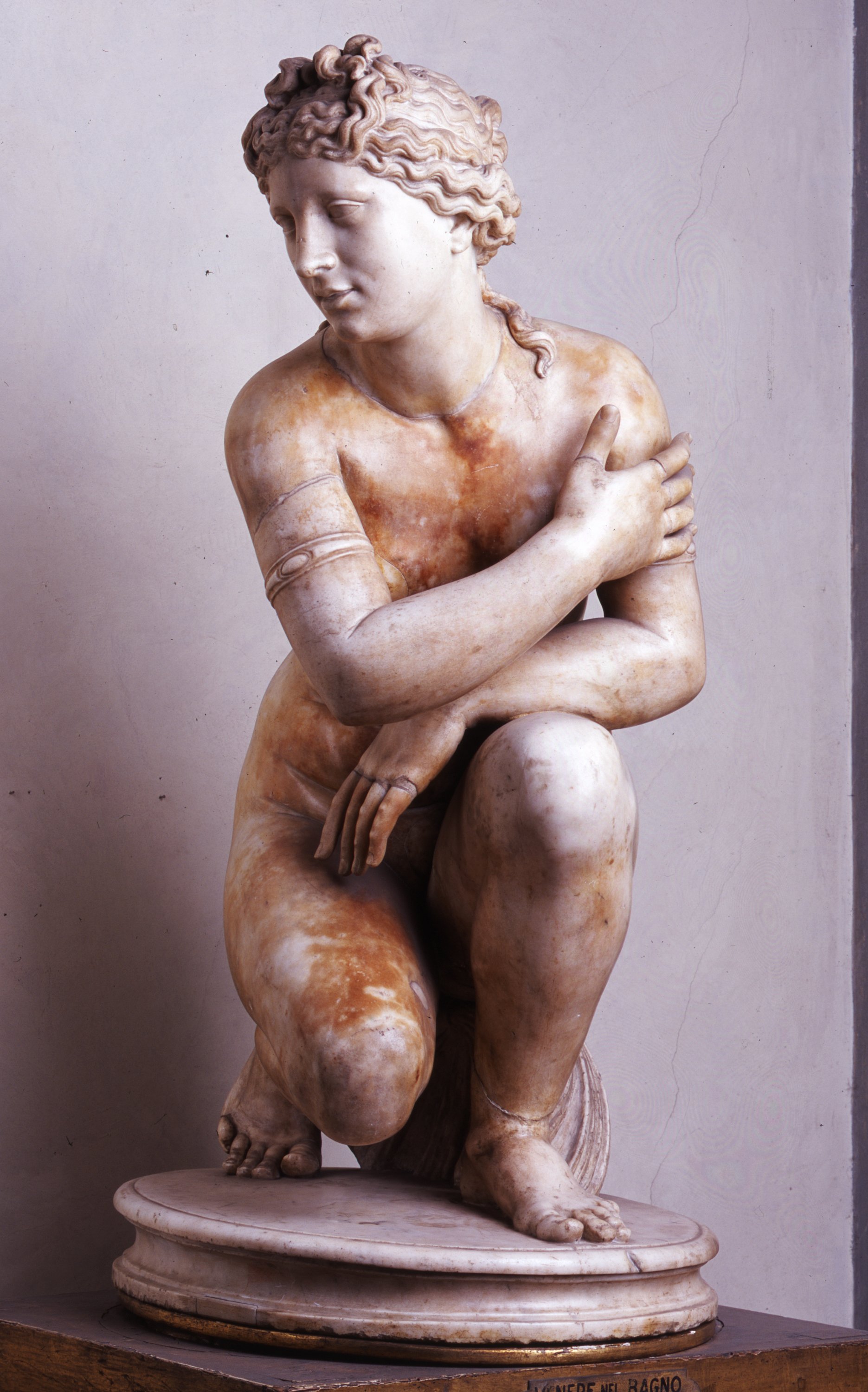 The statue represents an elegant Venus, crouching as she takes her bath, turned towards her observer and seeking to cover her breasts and pubis with her hand. Celebrated in antiquity and a model for artists of the Renaissance, this iconographic type has been copied many times and is identified as the Venus attributed by Pliny the Elder to sculptor Daedalsas. There are different variations and copies, but scholars agree that the archetype - the first example ever - could have been created around the middle of the 3rd century B.C., probably for Nicomedes I, King of Bithynia.