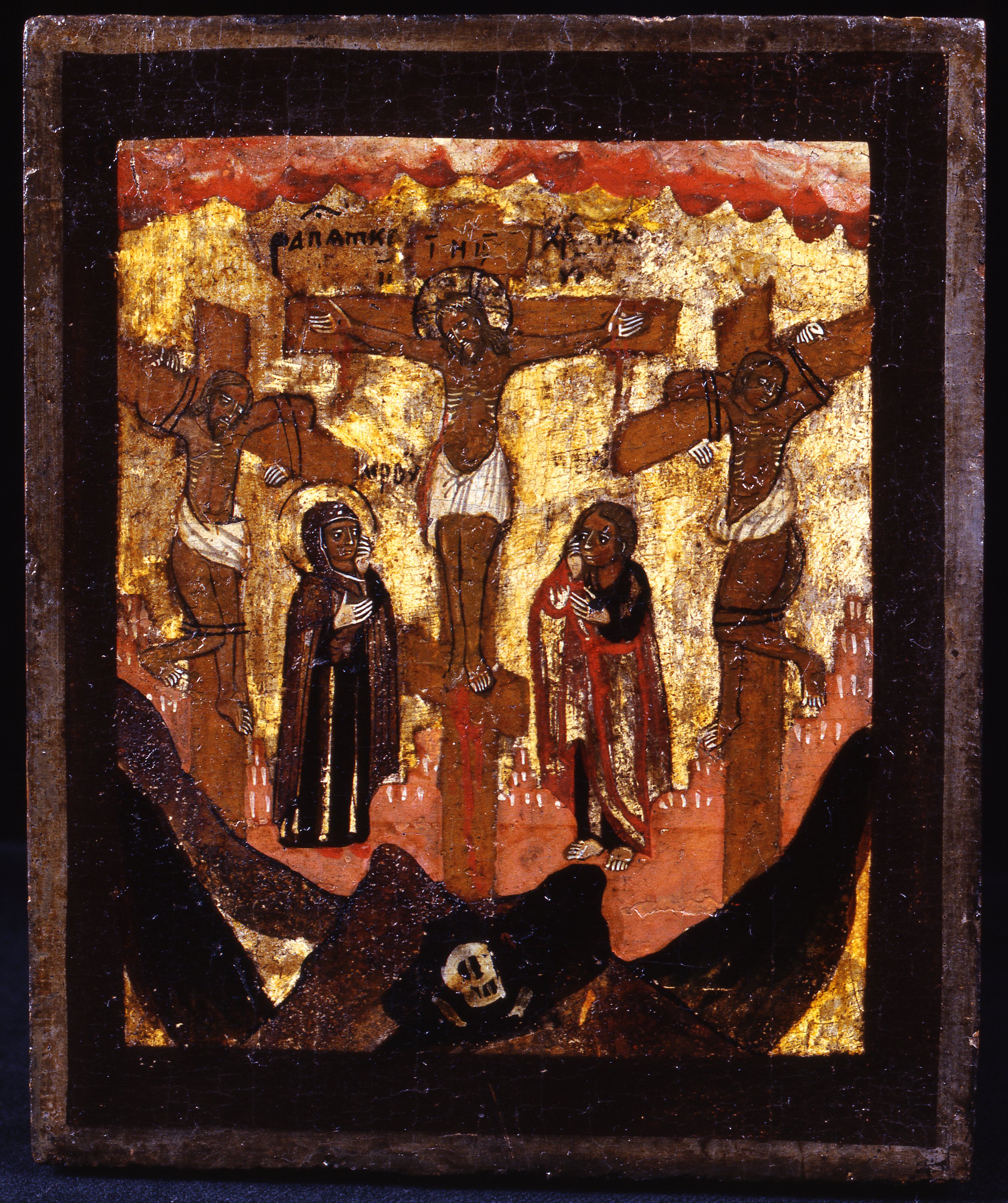The iconography type of the crucifixion of Christ between the two thieves originated around the 6th century, but in Russia it mainly became popularised from the late 16th century. The Uffizi icon sees the two crosses depicted diagonally, a device employed to simulate the depth of space, which likely implies the influence of Western European styles.