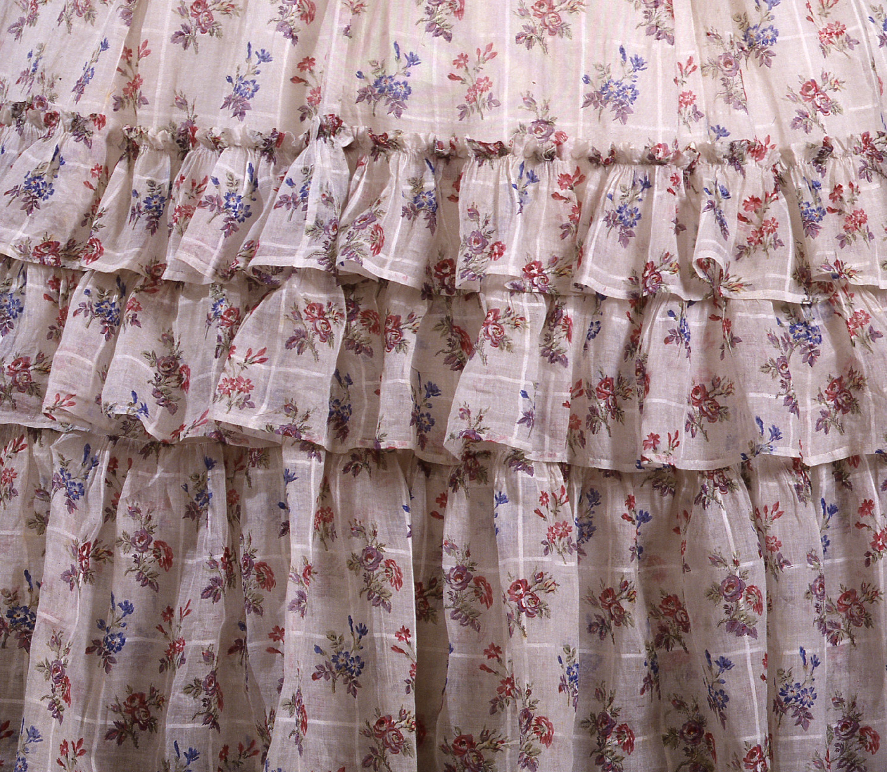 The dark red taffeta of the belt creates a significant contrast between the tightness of the bust and the volume of the skirt, which is embellished by three rows of ruffled flounces recalling those of the sleeves. The surface of the fabric is enlivened with dandyish bouquets of flowers on a plaid background.