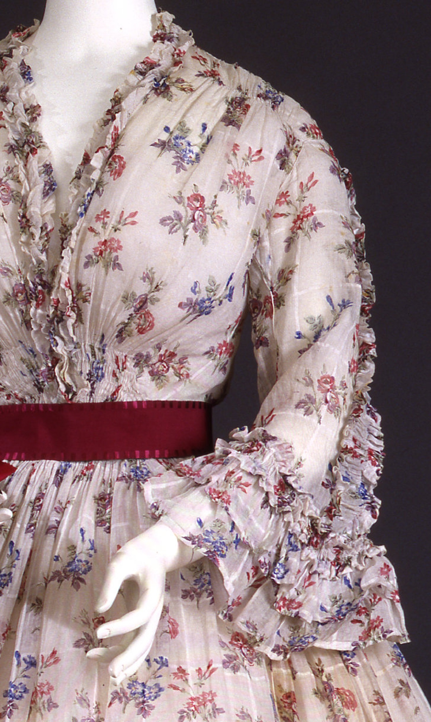The commercial success of textiles such as cotton and linen, together with the development of industrial cloth-printing techniques, favoured the introduction of lighter and cooler clothes for the summer season, while also providing cheaper alternatives to valuable textiles such as silk. Light fabrics and light colours were generally considered more suitable for young people. Relatively simple and light dresses like the one on display formed part of a woman's wardrobe required for specific occasions of the day and the year, such as walks and trips to the favourite destinations of the 19th century bourgeoisie: holiday homes in the countryside, in the mountains, as well as spa and seaside resorts.