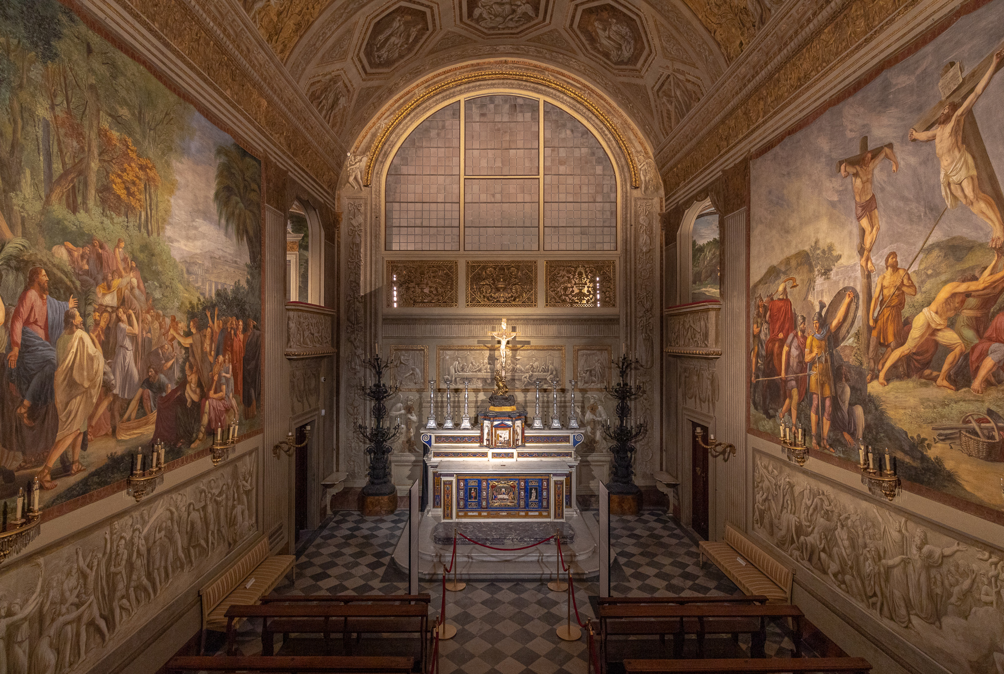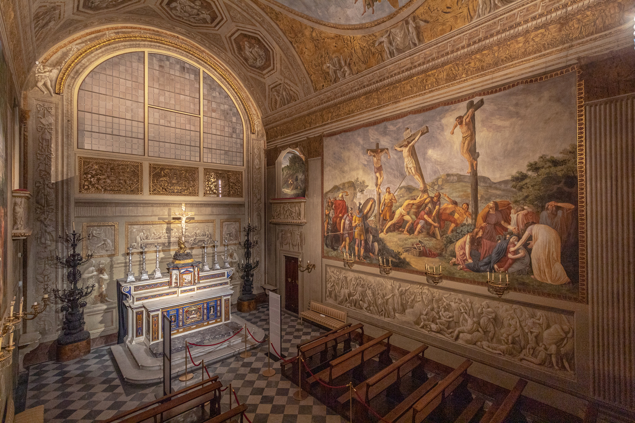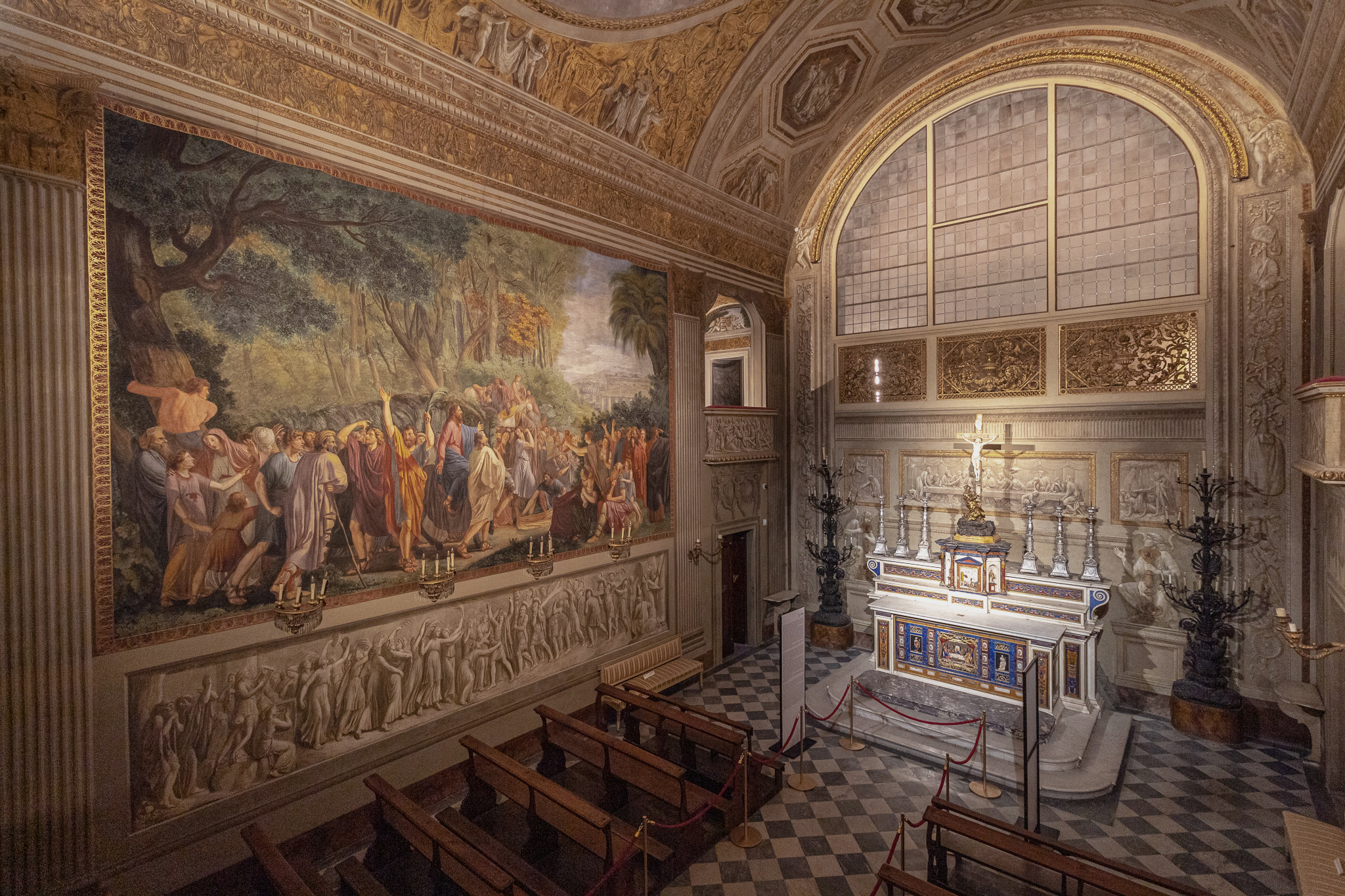 The second decorative phase of the Palatine Chapel was not completed until the end of the Napoleonic reign and the restoration of the Habsburg-Lorraine sovereignty, when Luigi Ademollo, already engaged in the pictorial cycles of the main floor of the Pitti Palace, was called again to realize the paintings for the left choir loft between 1822 and 1823. He was again appointed by Ferdinand III himself who, having returned after 15 years of exile in Florence, still had great faith in his court painter, holding him in the same high esteem. In this second decorative tranche, the rigorous and severe classicism, reminiscent of the painting by Frenchman Jacques-Louis David, gives way to a sacred painting updated to reflect the work of the 15th century Florentine painters, in line with the results of the contemporary purist currents.
