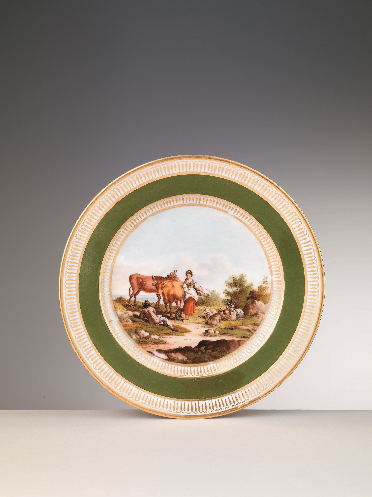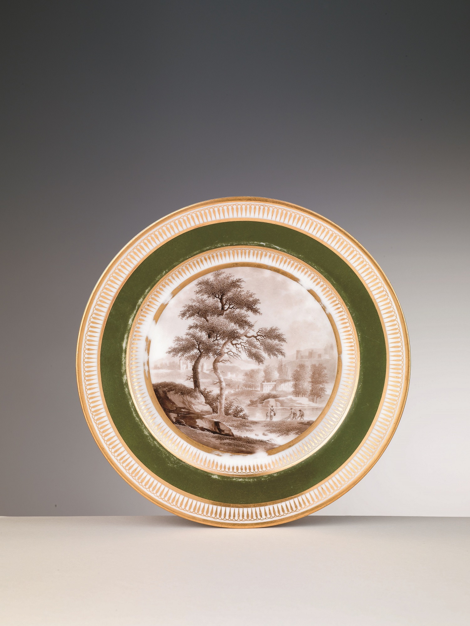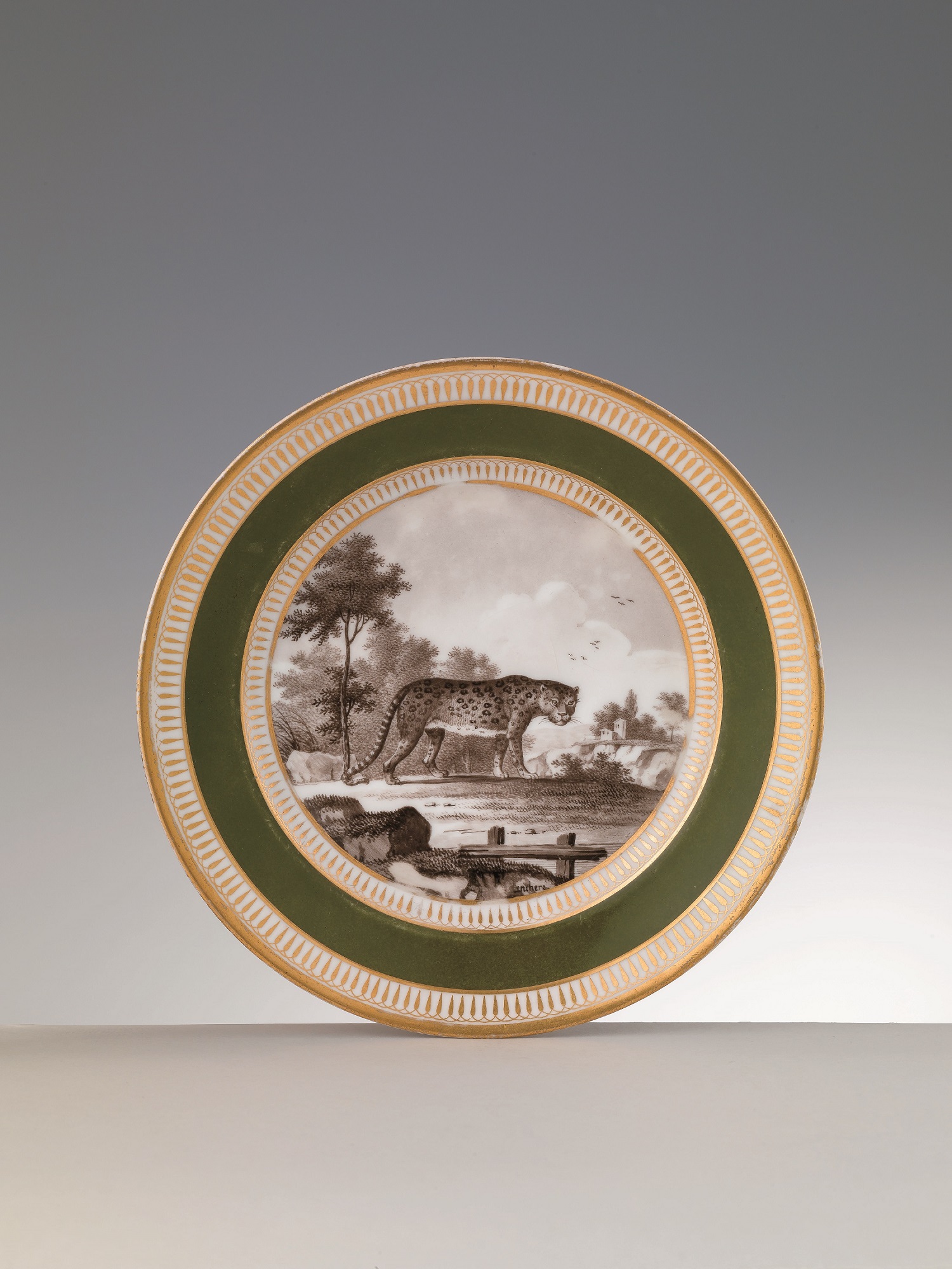The “porcelain set decorated in the colours of Paris”, as described in the inventory of the Villa Reale di Marlia in Lucca, introduces us to a rich variety of decorations and is characterised by a common motif consisting of two green bands interspersed with threads and geometric elements executed in gold. At the centre of the dishes preserved in the Porcelain Museum there are various types of representations, two of which are of an antiquarian taste with figures in one monochrome ochre and the other green, in a shade close to that used for the band. It is a decoration in line with the taste of travellers on the Grand Tour and very common in the Dagoty Factory, where it was defined as "Etruscan" in reference to the derivation from the paintings of the Attic vases of Magna Graecia made known through the printed repertoires, such as the Antiquités Etrusques Grecques et Romaines tirés du Cabinet de Monsieur by Pierre d'Hancarville from 1766. Also in line with the decorative style of the French factory are the Dutch-inspired representations with forest landscapes in monochrome sepia animated by animals or men. These representations alternate with those in polychrome both with scenes of pastoral life, and with the reproduction of rare animals such as exotic birds taken from printed repertoires such as, for example, the Histoire naturelle, générale et particulière, avec la description du Cabinet du Roi by Georges-Louis Leclerc de Buffon from 1749-1789, from which the jaguar reproduced in sepia monochrome by the Doccia Factory on one of these plates was copied.