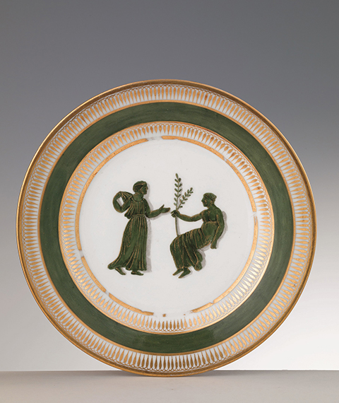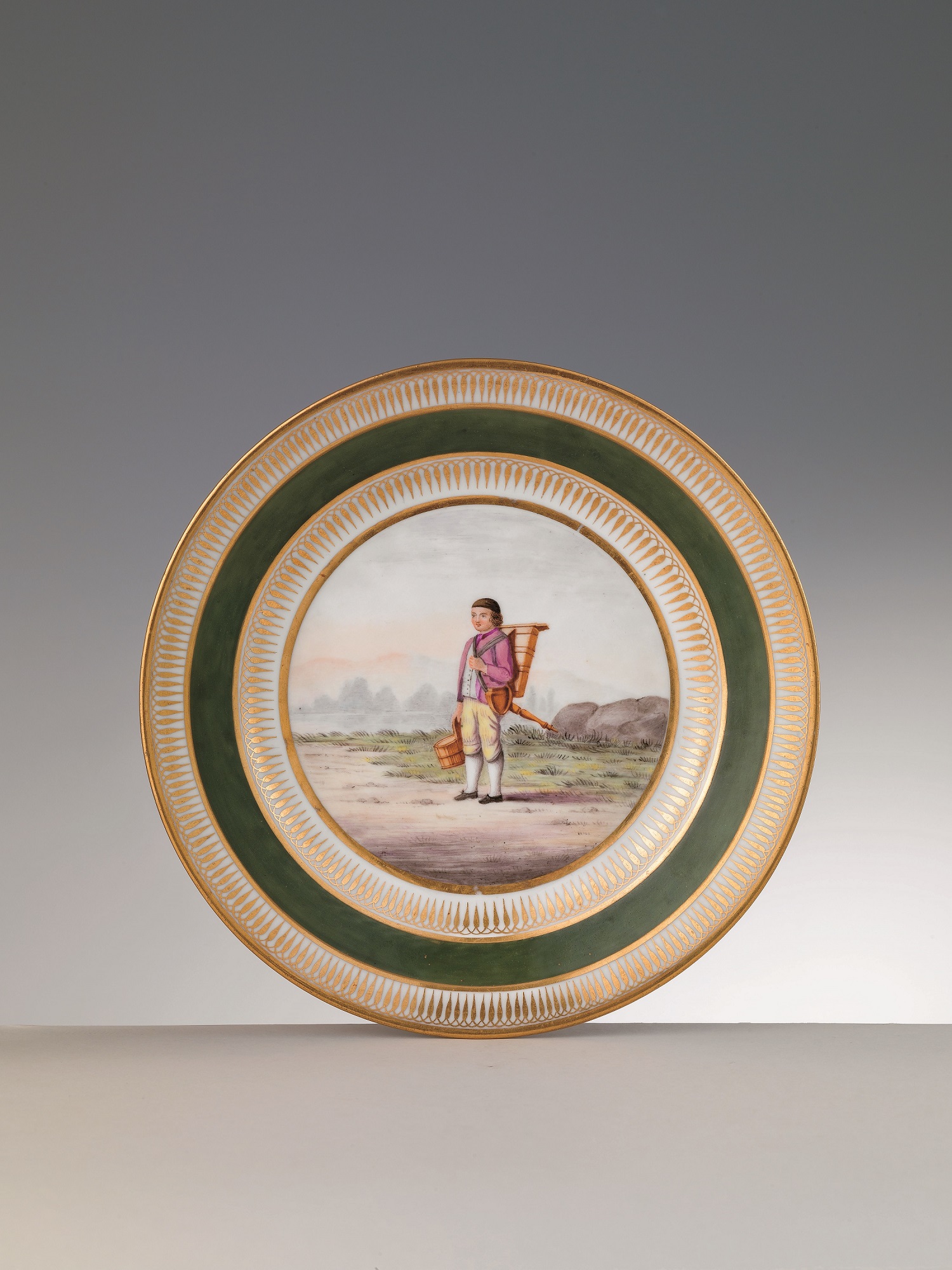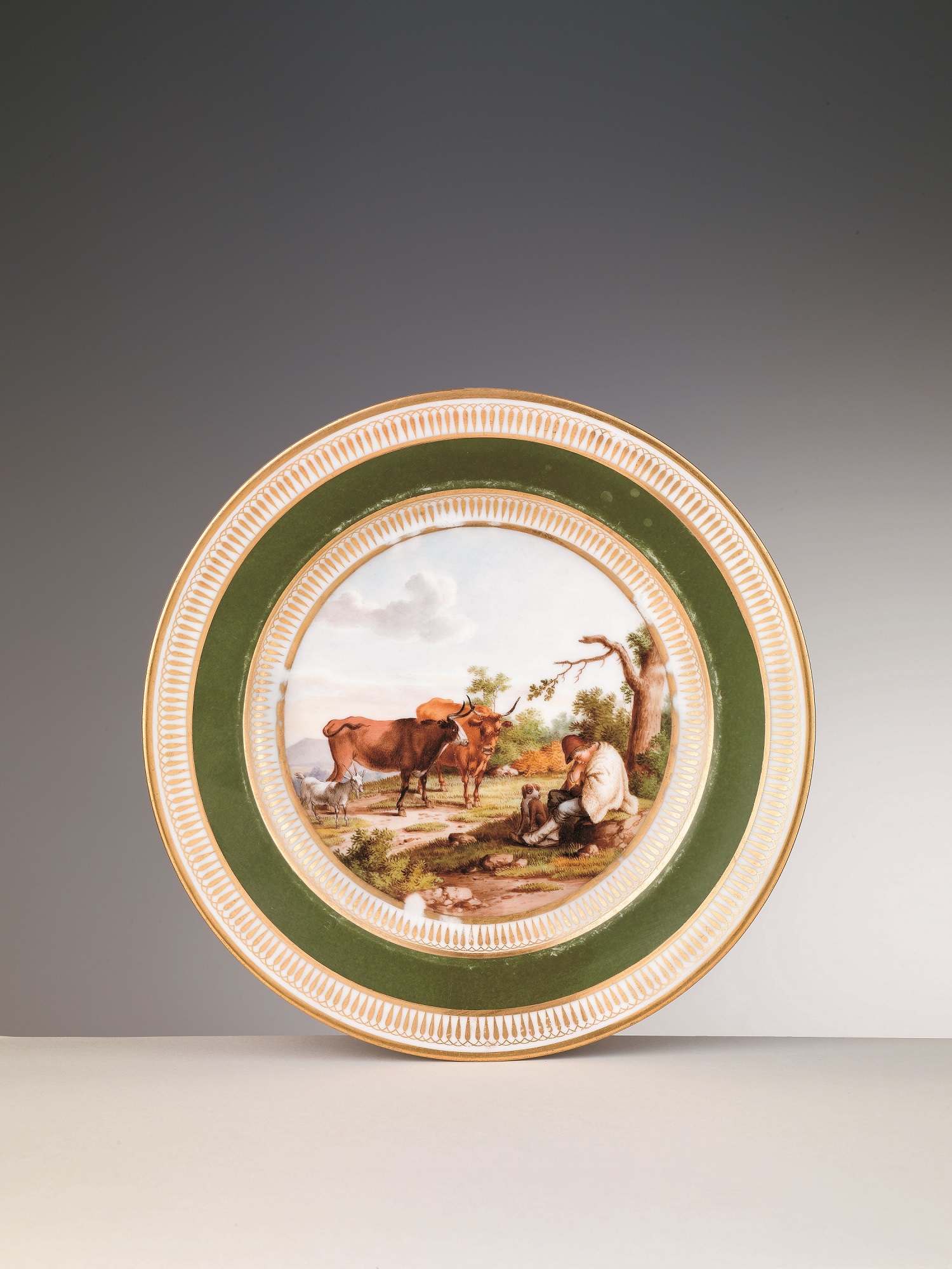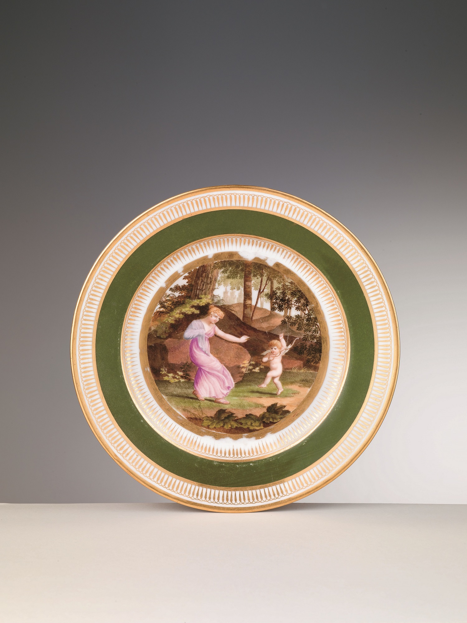 The “porcelain set decorated in the colours of Paris”, as described in the inventory of the Villa Reale di Marlia in Lucca, introduces us to a rich variety of decorations and is characterised by a common motif consisting of two green bands interspersed with threads and geometric elements executed in gold. At the centre of the dishes preserved in the Porcelain Museum there are various types of representations, two of which are of an antiquarian taste with figures in one monochrome ochre and the other green, in a shade close to that used for the band. It is a decoration in line with the taste of travellers on the Grand Tour and very common in the Dagoty Factory, where it was defined as "Etruscan" in reference to the derivation from the paintings of the Attic vases of Magna Graecia made known through the printed repertoires, such as the Antiquités Etrusques Grecques et Romaines tirés du Cabinet de Monsieur by Pierre d'Hancarville from 1766. Also in line with the decorative style of the French factory are the Dutch-inspired representations with forest landscapes in monochrome sepia animated by animals or men. These representations alternate with those in polychrome both with scenes of pastoral life, and with the reproduction of rare animals such as exotic birds taken from printed repertoires such as, for example, the Histoire naturelle, générale et particulière, avec la description du Cabinet du Roi by Georges-Louis Leclerc de Buffon from 1749-1789, from which the jaguar reproduced in sepia monochrome by the Doccia Factory on one of these plates was copied.