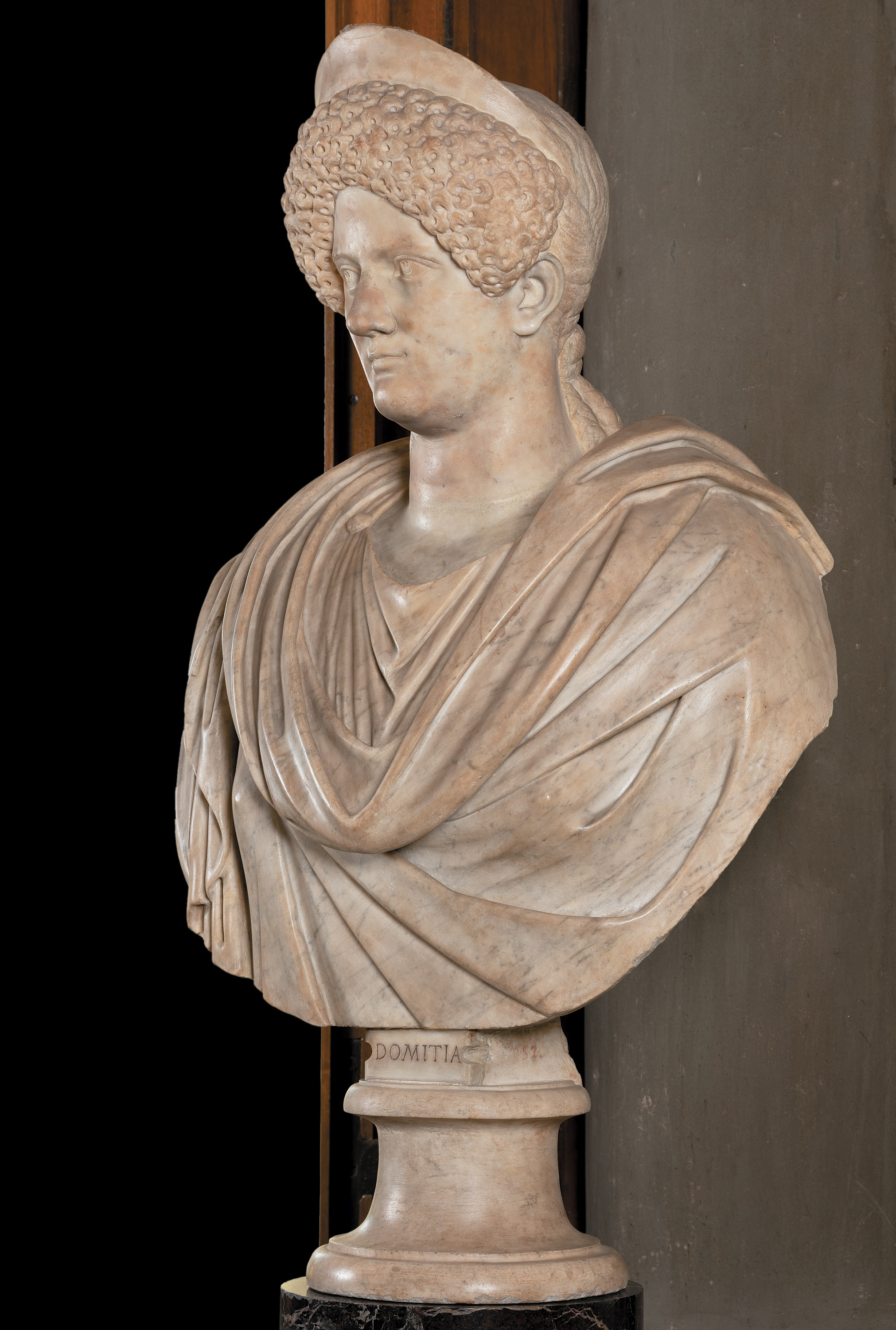 The face of empress Domitia Longina (51/55-post 126 AD), set on a modern draped bust in Italian marble, is recognizable for its particular physiognomic characteristics, such as the elongated, almond-shaped eyes, aquiline nose, and plump lips. The elegant honeycomb pattern hairstyle, arranged higher up on the forehead than in the portraits of the subject as a young woman, and the presence of the diadem allow us to relate the effigy to the type of portraiture created in the years when her husband, Prince Domitian (81-96 AD), rose to power and Domitia was appointed Augusta.