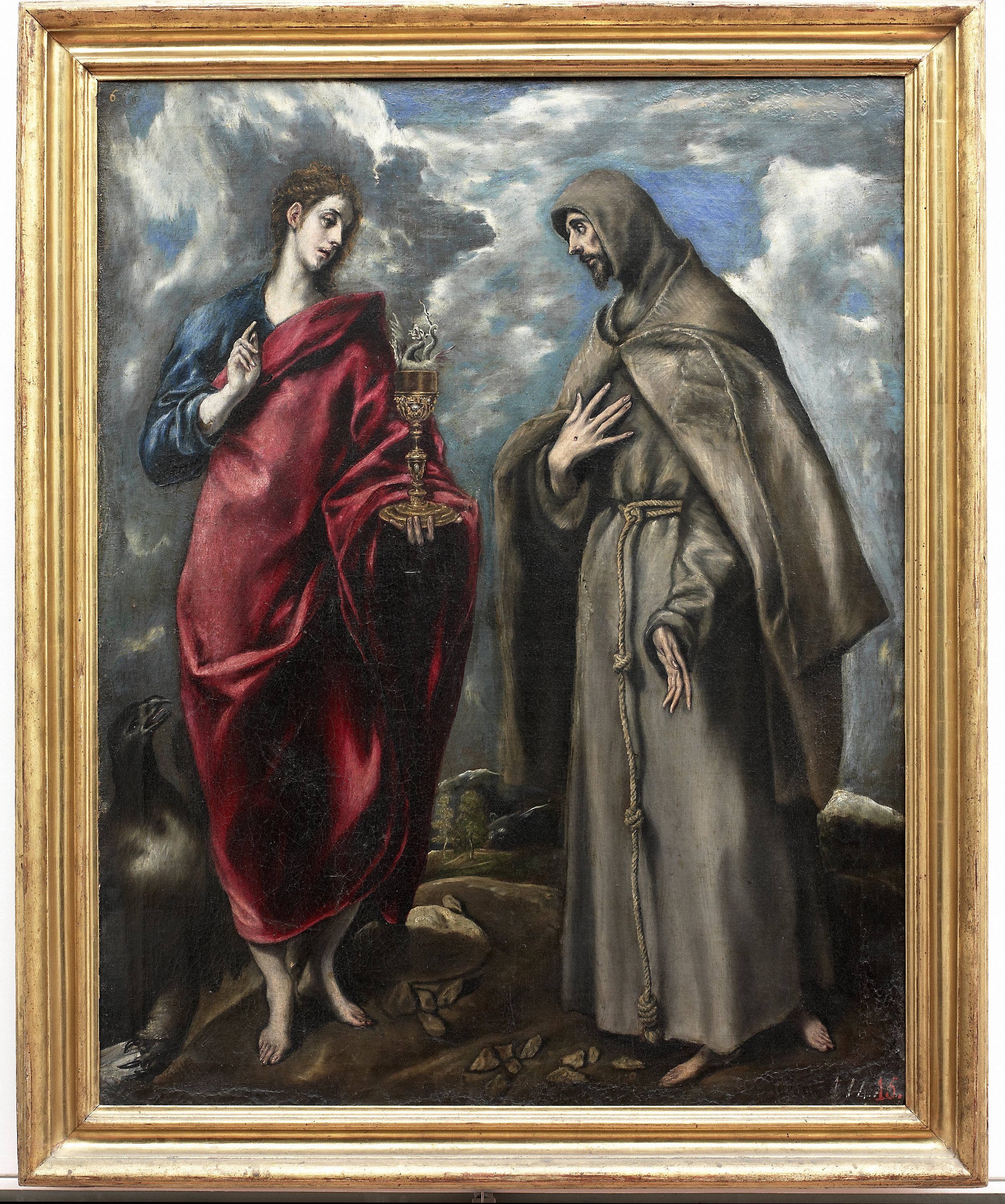 The two saints, with their elongated bodies and suffering faces, loom large in the foreground, set against a sky full of lead grey clouds. St John is holding a golden chalice from which a winged dragon is emerging. This detail is a rare iconography referring to an episode in the saint’s life related in Jacopo Varagine’s Golden Legend. It relates that the priest of the temple of Diana in Ephesus asked John to show the power of his Christian faith by drinking from a cup of poison. To demonstrate its effects, the priest had two prisoners drink from the chalice first, both of whom died on the spot. Not only was John immune to the effects of the poison but, after drinking it, he also resuscitated the two dead prisoners. The depiction of the chalice and the dragon became the symbol of the contraposition between the Church and Satan, a theme particularly dear to the Catholic Counter-reformation, which was intent on fighting protestant heresy in those years. Indeed, the paintings of El Greco’s mature production, including this one, show his growing tendency to be influenced by the intensely religious climate in Spain at that time. The work is charged with a dramatic, visionary mood designed to arouse a strong spiritual turmoil in the beholder.