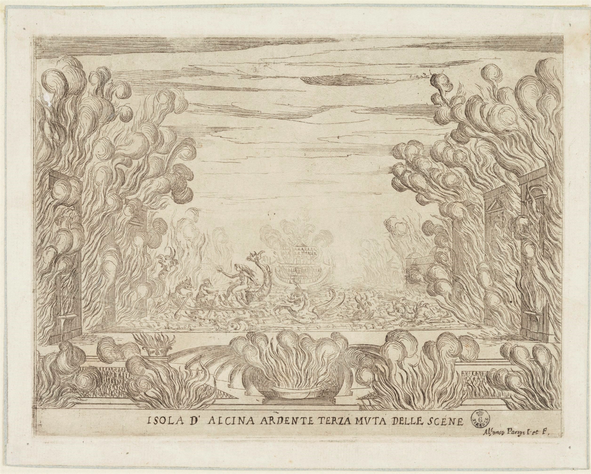 The “Liberation of Ruggiero from the island of Alcina” is an opera by Francesca Caccini, extremely successful performer and composer at the Medici court, from a libretto by Ferdinando Saracinelli. It was printed in Florence in 1625, the year in which the opera made its debut. The libretto contains five illustrations corresponding to the four scenes of the performance and the final ballet, as well as a frontispiece with dedication to Grand Duchess of Tuscany, Maria Maddalena of Austria, a great patron of the musical arts. The plates were etched by Alfonso Parigi, who printed the stage designs by his father Giulio, official architect to the Medici court. In this scene in particular, the witch, Alcina reveals her monstrous appearance and flees from her island, which is in flames after the enchantress Melissa had woken the paladin Ruggiero from the evil love spell that kept him away from his intended bride, Bradamante. The story was inspired by Ludovico Ariosto’s Orlando Furioso and, in keeping with the tastes of the court, its aim, in showing the defeat of love outside marriage, was moralistic.