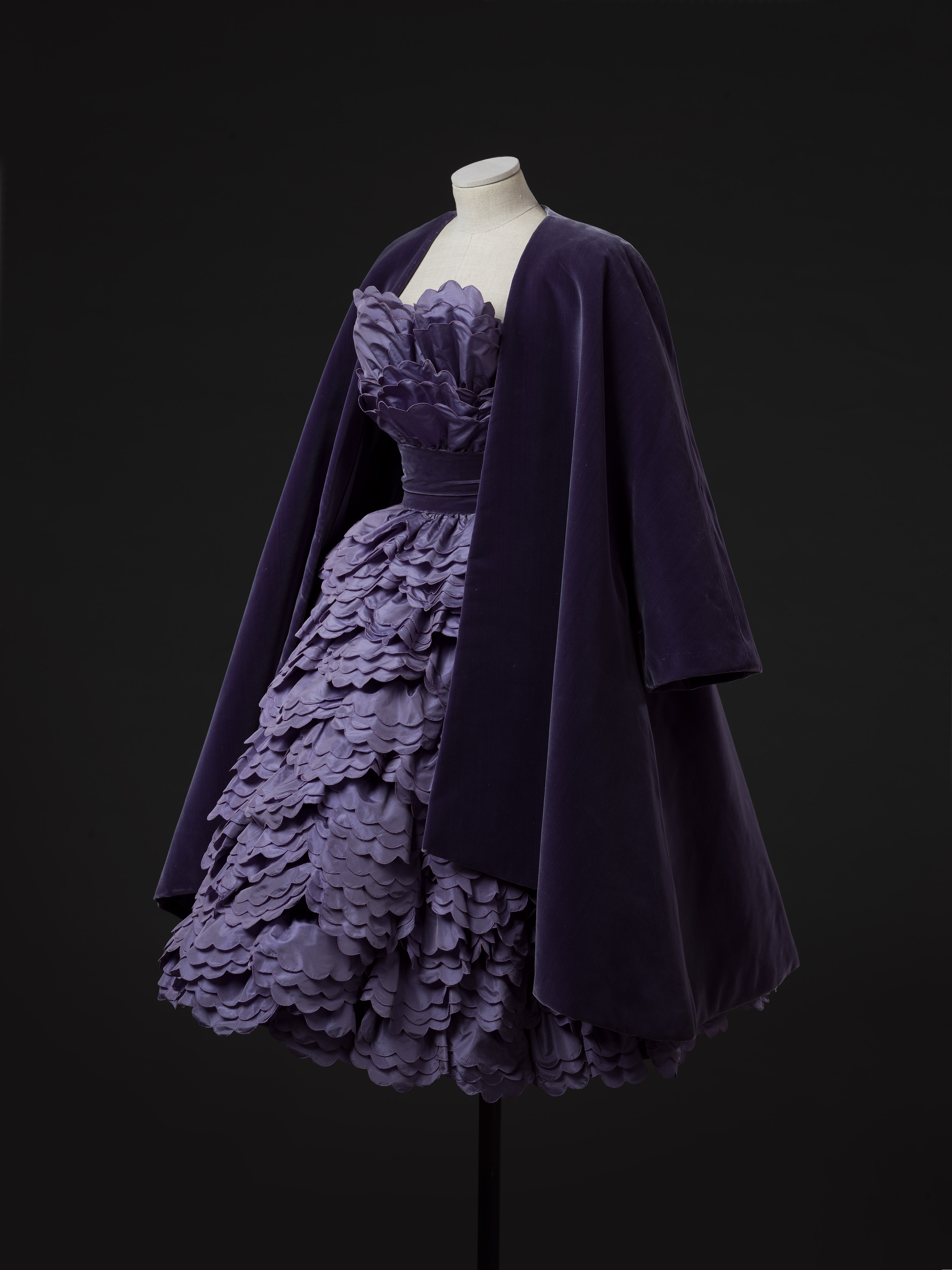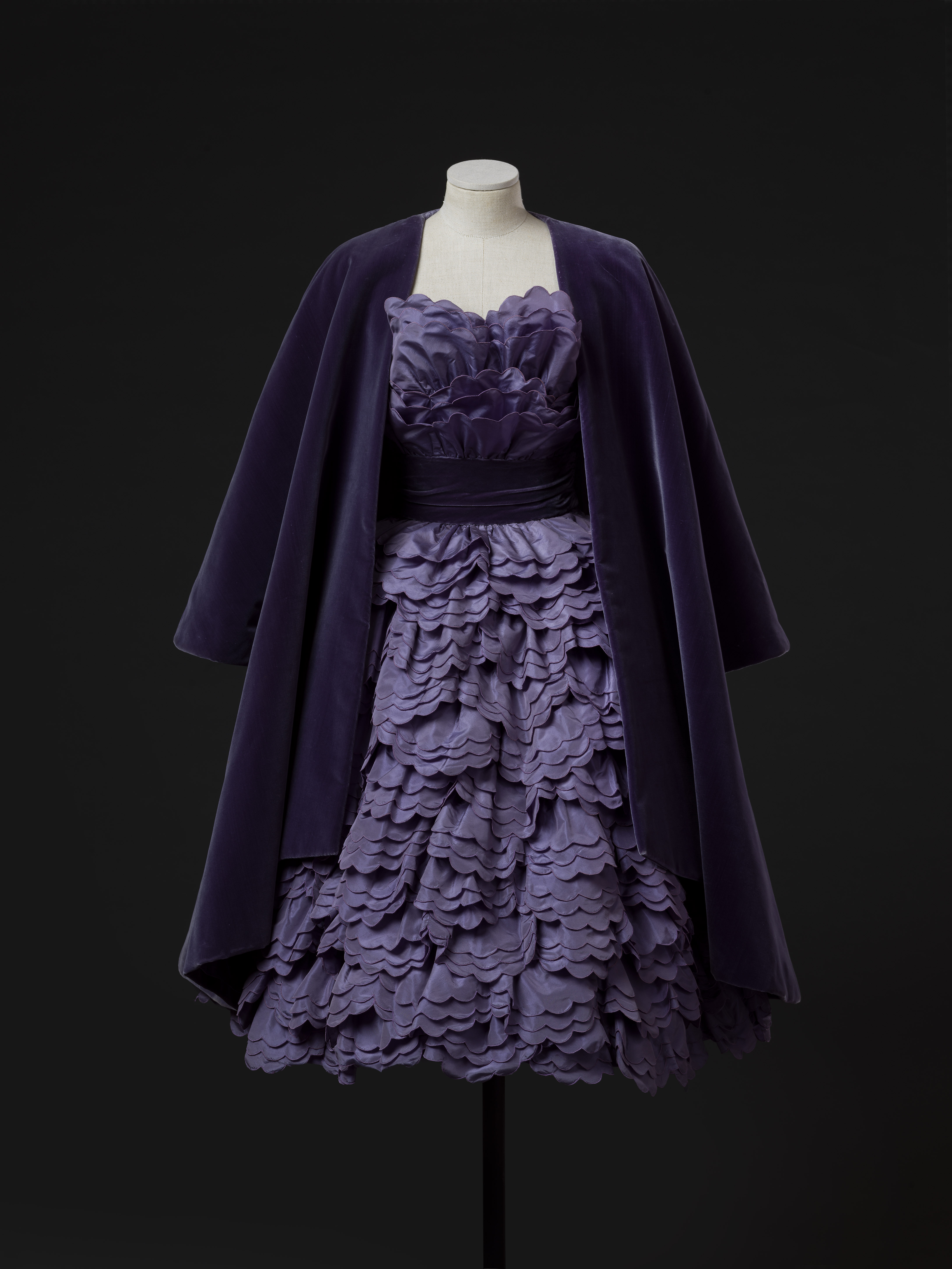 Short lilac silk taffeta dress with a bodice whose corolla neck- line consists of a series of lightly gathered scalloped decorations. The same petal motif is repeated on the inverted corolla skirt. The waist is marked by a strip belt in matching velvet. The broad lilac velvet cape has an asymmetrical hem that is longer at the back.
