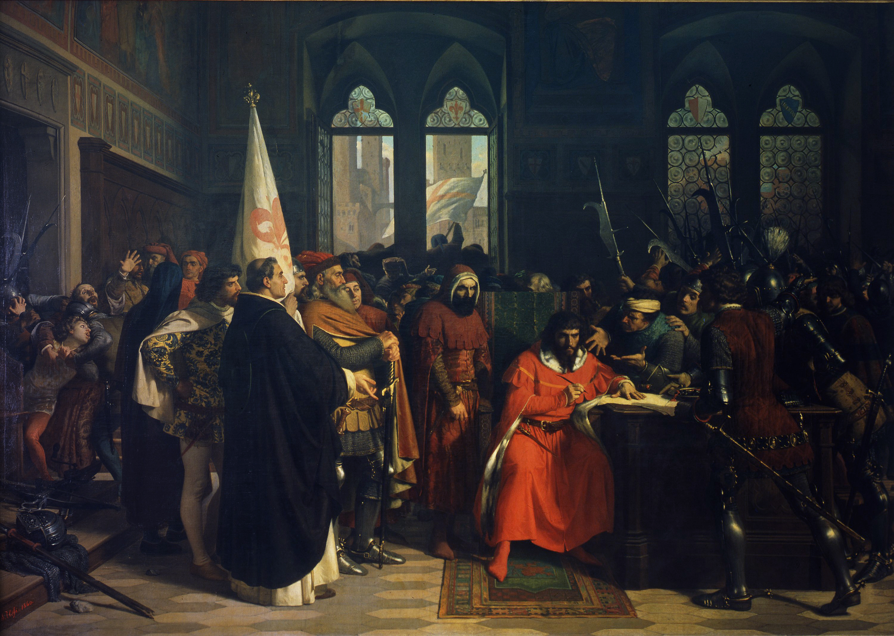 The subject of the painting takes its inspiration from an episode mentioned by Niccolò Machiavelli in his second book of Florentine Histories, about the expulsion of Walter of Brienne, Duke of Athens, in July 1343. The scene is set in a room in of the Bargello Palace, where the Duke, who had ruled despotically over Florence, is about to sign his resignation from government over the city. His expression matches the grim face of the perfidious councillor, Cerretieri Visdomini standing behind him, and also provides a contrast to the stationary attitudes of the characters on the left, identified as the figures behind the plot: Archbishop Acciaioli and representatives of the aristocracy and of the people. The ferment in the background culminates with the figure of the soldier on the right who, with his gestures, seems to urge the Duke to make this difficult choice, while through the window, it is possible to notice the celebrations already taking place in the city.