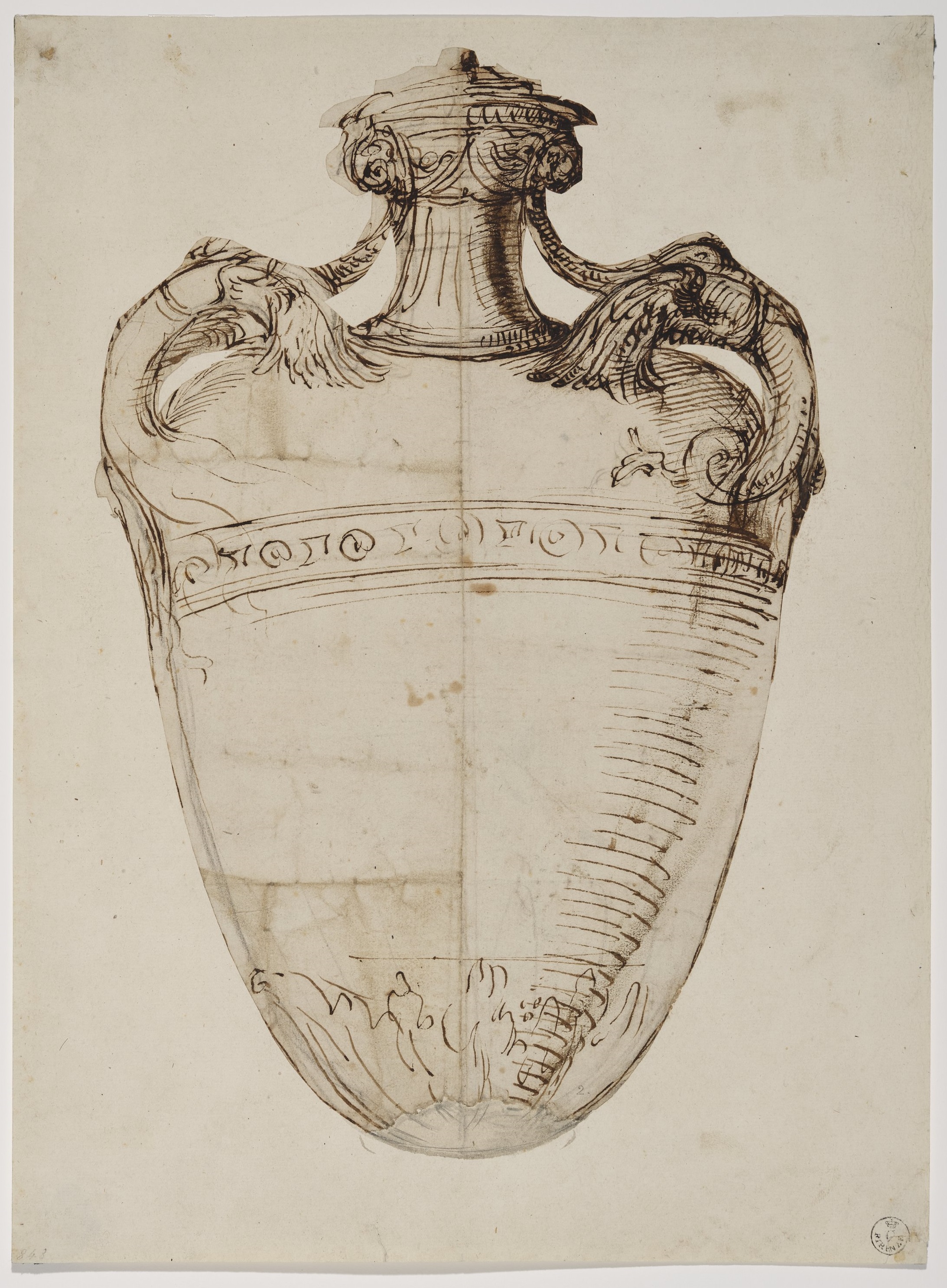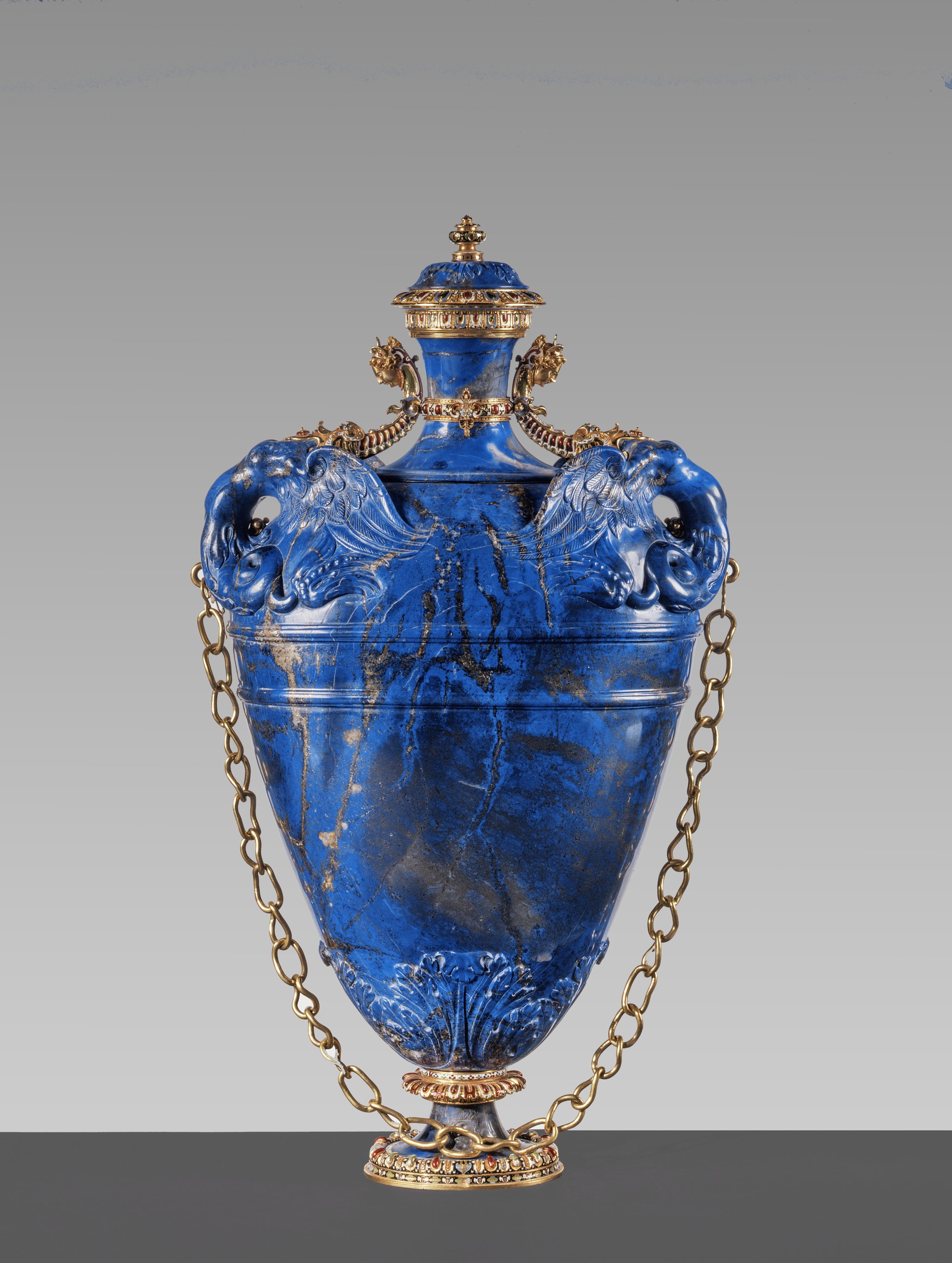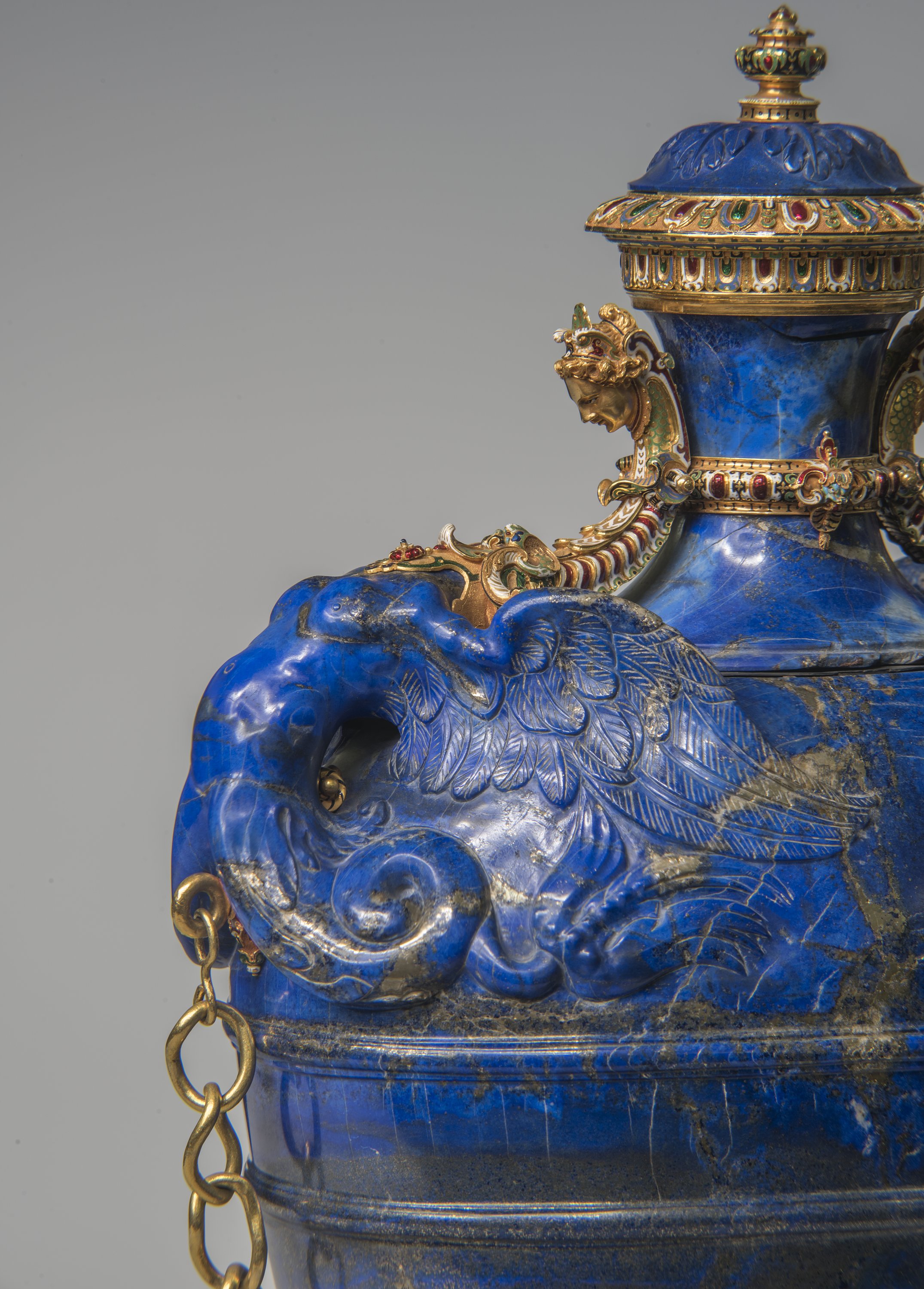 The vase, a masterpiece from the workshops of Casino di San Marco, established by Francesco I de’ Medici in the latter part of the 16th century, consists of five pieces of lapis lazuli of exceptional quality that form the foot, body, neck (divided into two) and lid. On the base, the vase is dated “1583”, engraved beside Francesco’s initials, “FM”, and the Medici coat of arms, indicating completion of the stone section – likely the work of skilled Milanese carvers, Gian Ambrogio and Gian Stefano Caroni, called to Florence in 1572. The carvers worked from designs by Bernardo Buontalenti, as can be seen from the drawing in the Collection of Prints and Drawings in the Uffizi (inv. no. 694 Orn), which contains the main idea behind the item, i.e. two handles formed by two sphinxes with wings and fishtails to be made in relief, however, deciding to make a few changes, the carvers created leaves from which the body of the vase emerges in relief, while the decoration drawn by Buontalenti and intended for the band of the body is absent.