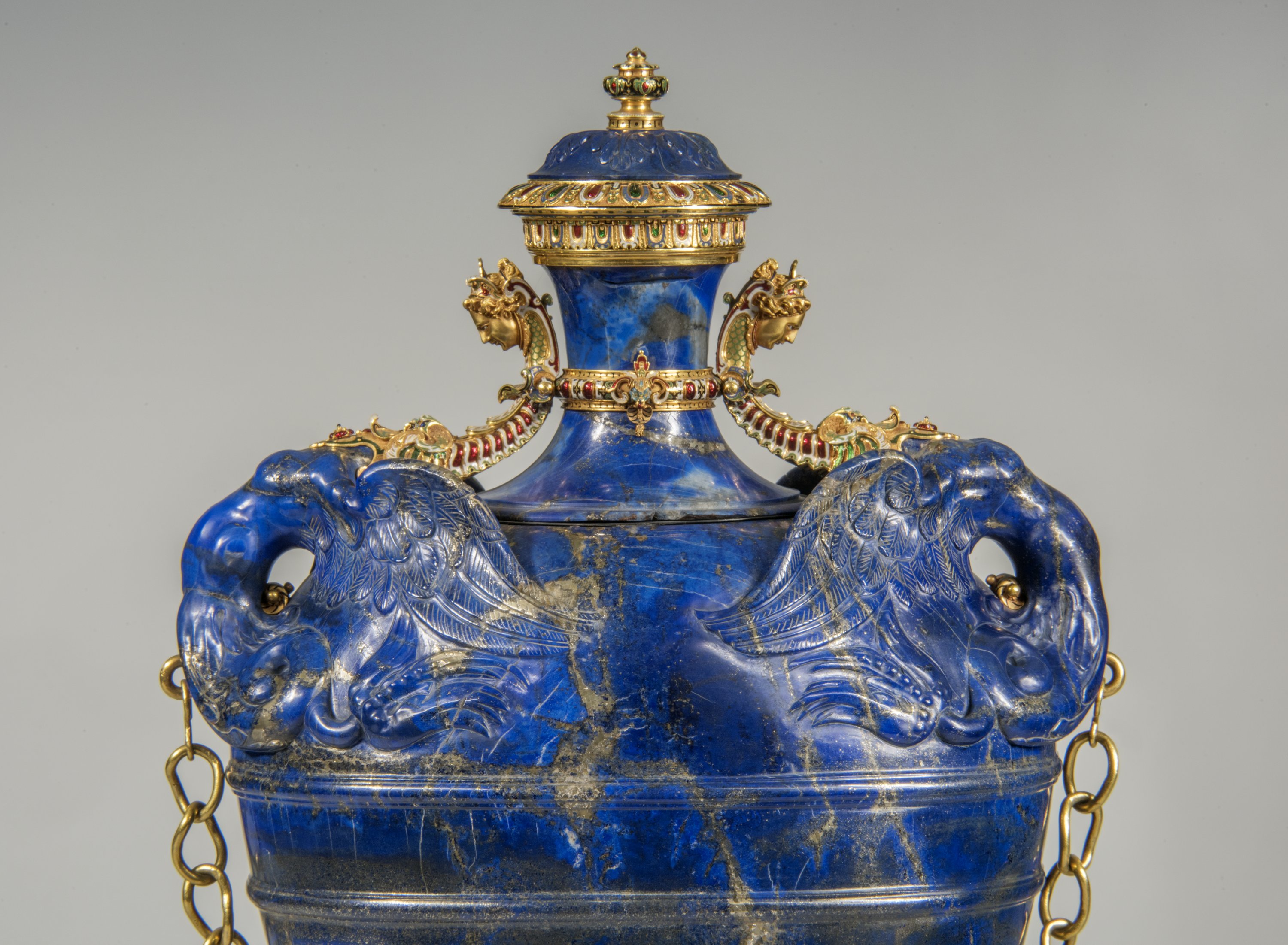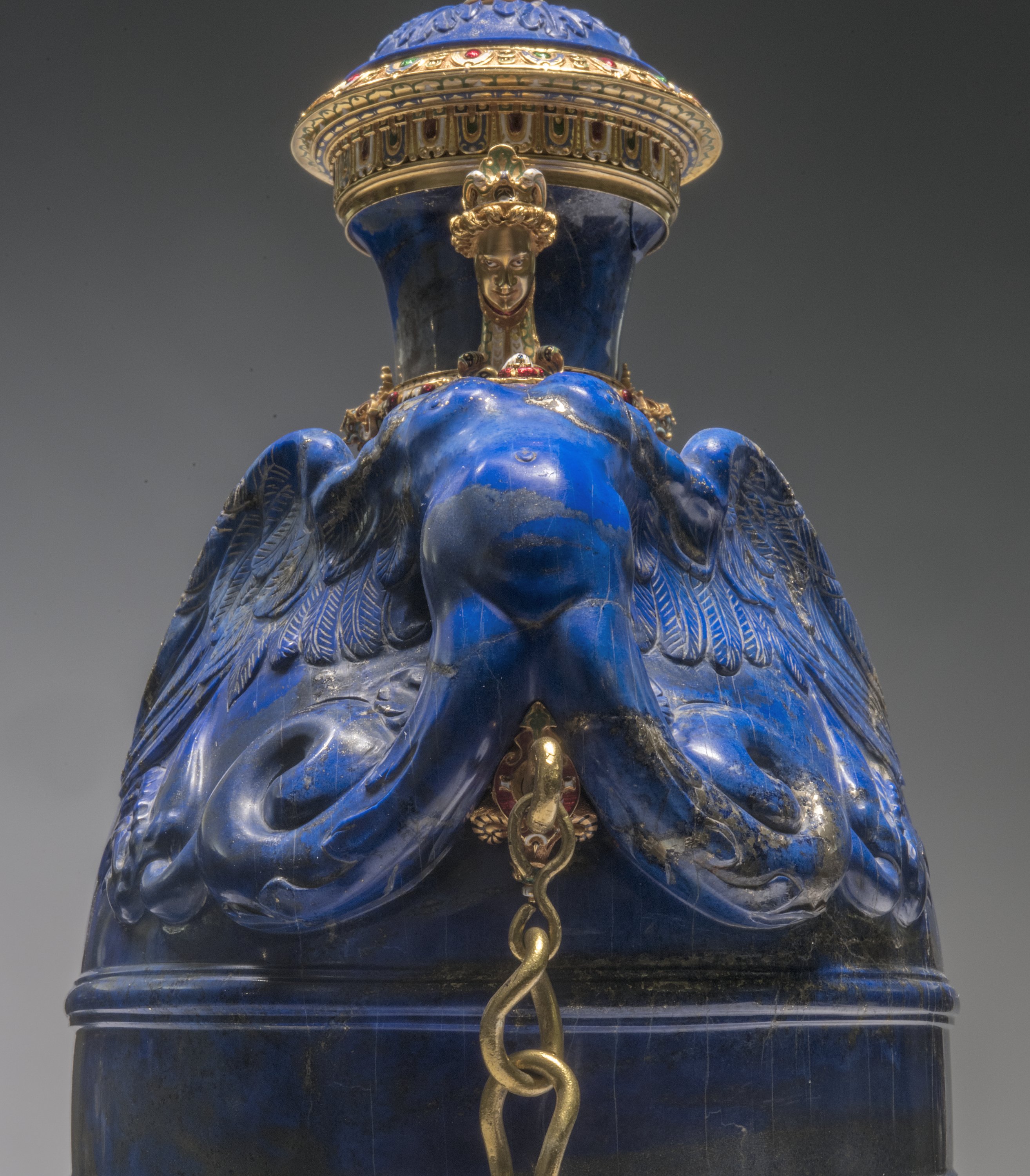 The golden reflections of the lapis lazuli, created using pyrite engravings, may have inspired the elaborate mount in enameled gold that completes the figures of the two winged sphinxes, with long necks and heads in enameled gold which, like the bands on the foot and lid, are the work of the Dutch goldsmith Jacques Bylivelt, creator of the grand ducal crown, who delivered the finished item on 16 March 1584.