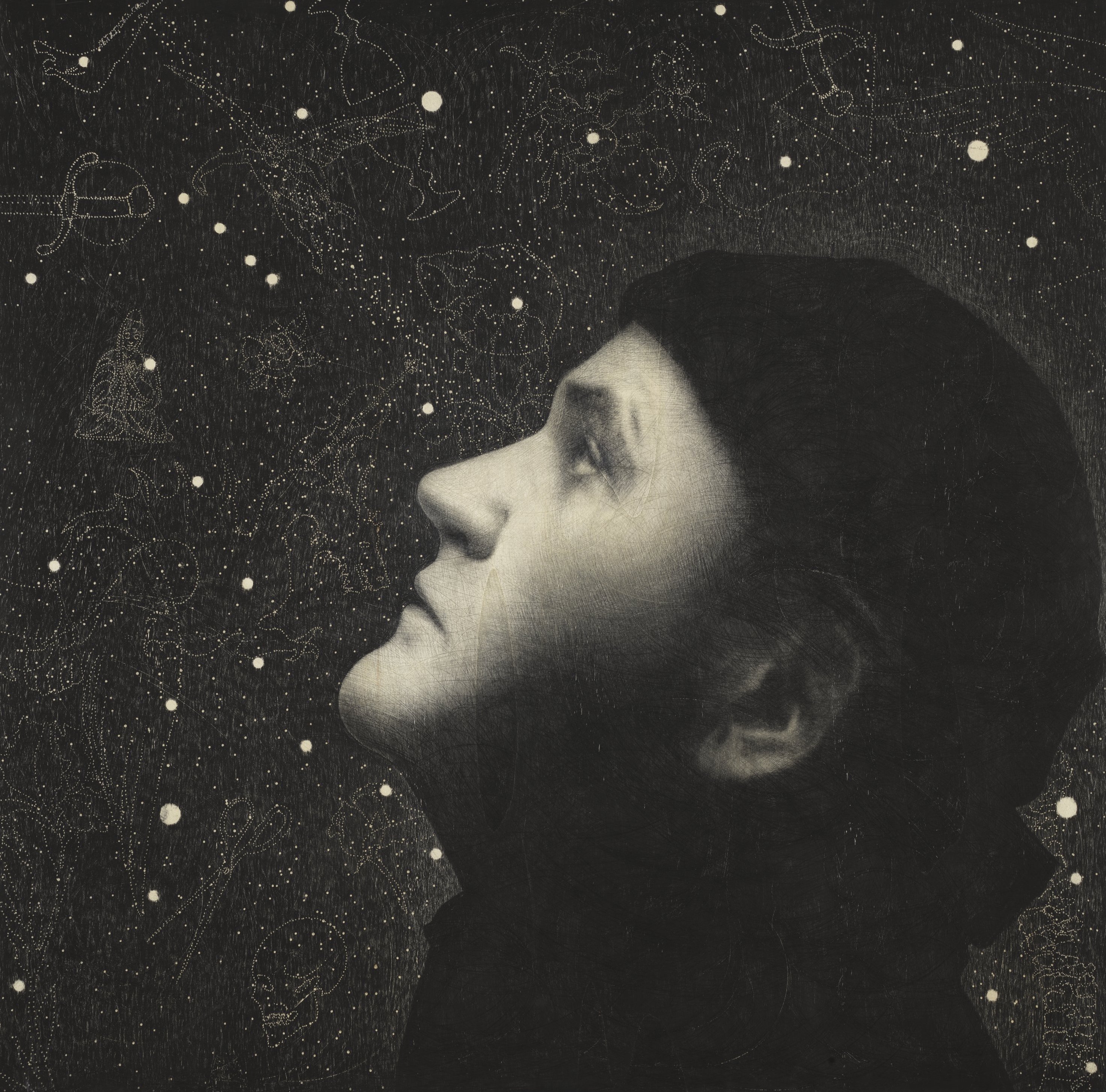 In this monumental self-portrait, Omar Galliani reproduces his own profile for the first time, depicting himself in contemplation of an immense and very deep sky, dense with luminous constellations formed by figures that have recurred several times in his artistic career. These include, for example, roses and skulls, presented here as two faces of the same thought, time passing by (the roses are indifferent to the transience of beauty, the skulls to the inevitability of death). The same elements were already present in the equally monumental triptych Nocturne acquired for the Collection of Prints and Drawings of the Uffizi in 2008.