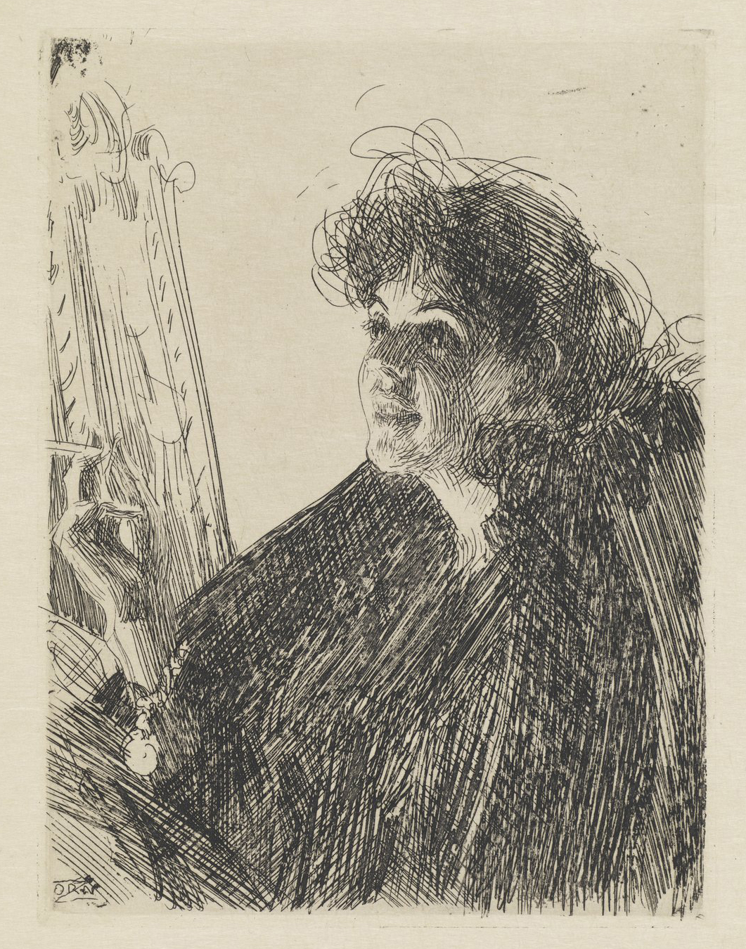 Images such as this, in their instant-like immediacy, record Zorn’s deep interest in a cosmopolitan gallery of female subjects that he presents in a host of different poses and with a wide variety of expressions. The anti-conformism - rare for the period - of a woman in the act of smoking in public, does not detract from the serene fineness expressed on the model’s face, confirmed by the painting of which the print is an engraved version. Like many etchings by the artist, this is an extraordinary interpretation, in the smaller size of a sheet, of one of his painted portraits. Thanks to the vitality of an extremely mobile engraved stroke, leaving wide areas filled with light, following an “unfinished” effect, the image has a “photographic” immediacy in its composition, which finds its roots in the brilliant works of Rembrandt.