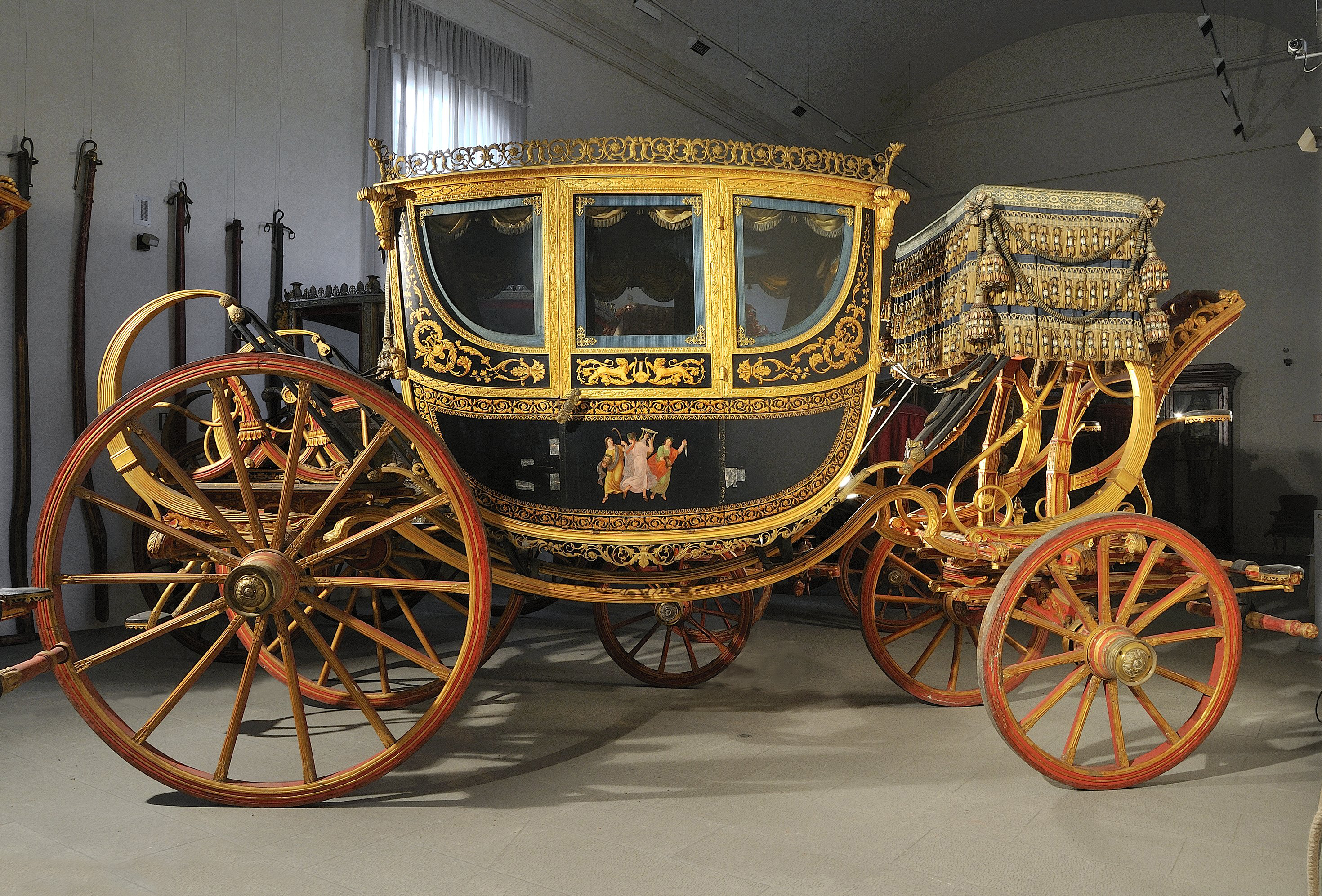 This Grand Gala Berlin was the first in a series of five Berlin carriages made for Ferdinand III and dates back to 1817. The doors, back and front of the coach are decorated with portraits of members of the Medici and Lorraine families. Depicted in carriages, Lorenzo the Magnificent, Cosimo I and Cosimo II de’ Medici appear alongside personages from their periods: Agnolo Poliziano, Giorgio Vasari and Galileo Galilei, while the allegories of Abundance and Trade are associated with Grand Duke of Tuscany Peter Leopold. After the Congress of Vienna (1814-1815), which restored the European monarchs deposed by Napoleon, this choice of iconography was intended to stress the cultural, political and historic continuity of the two grand ducal dynasties, wiping away the memory of the Kingdom of Etruria, founded under Bonaparte.