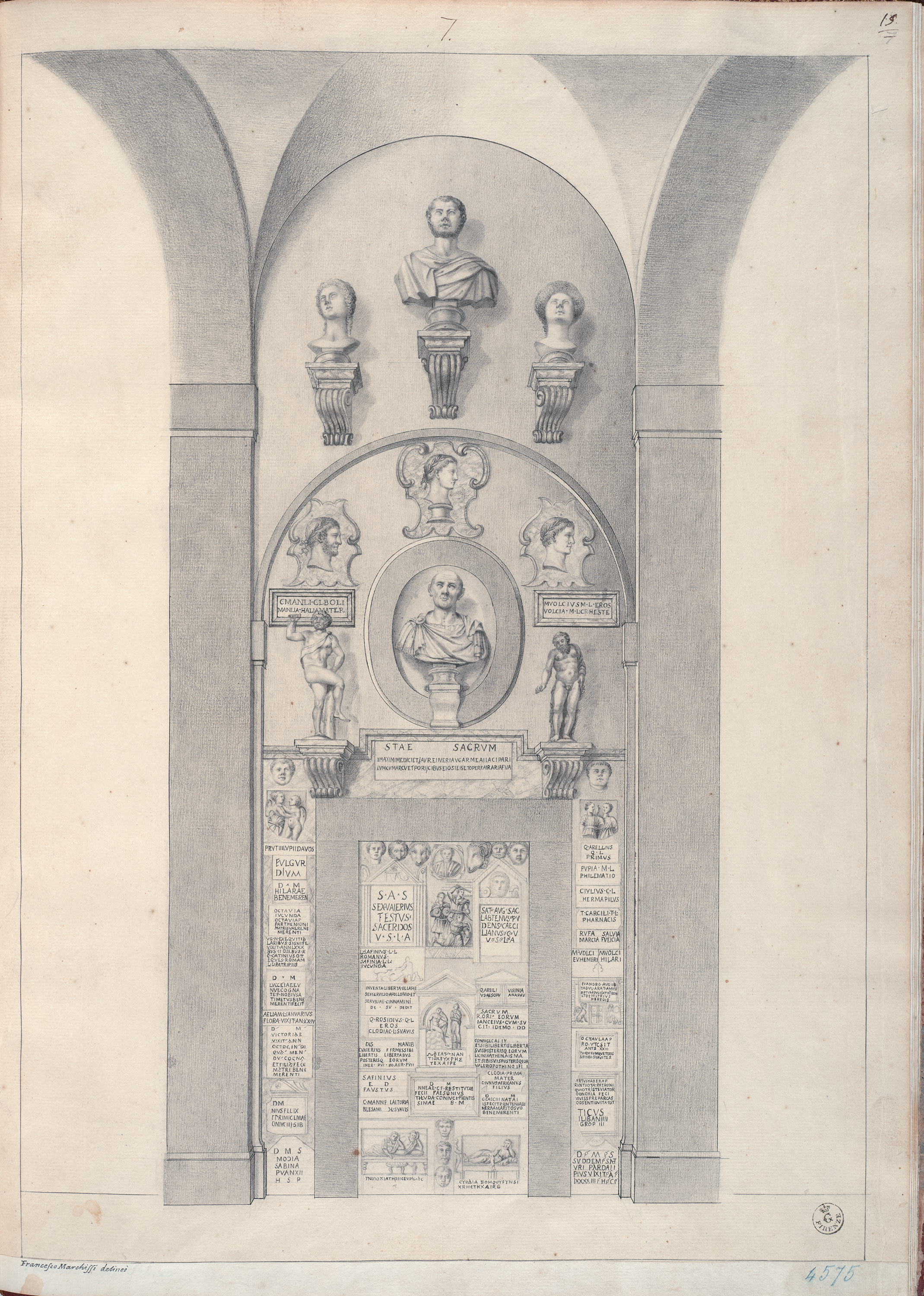 The sheet in the exhibition depicts, in the preparatory drafting stage, one of the walls of the Hall of Ancient Inscriptions (Ricetto) in the Uffizi, the first room that visitors would encounter upon entering the Gallery at the time, set up here according to the order decided at the beginning of the 18th century by Giovan Battista Foggini, in which the various elements - busts, inscriptions and reliefs - were to be arranged according to a scheme inspired by regularity and symmetry. A scheme that would be completely revised a few years later and replaced by an arrangement by classes of materials, according to the new scientific approach chosen by Luigi Lanzi. In both cases, the archaeological material was chosen to welcome visitors to the Galleries, with the most significant examples of epigraphs, statuettes and busts, such as the beautiful portrait of Domizia Longina, visible in this sheet at the top right.
