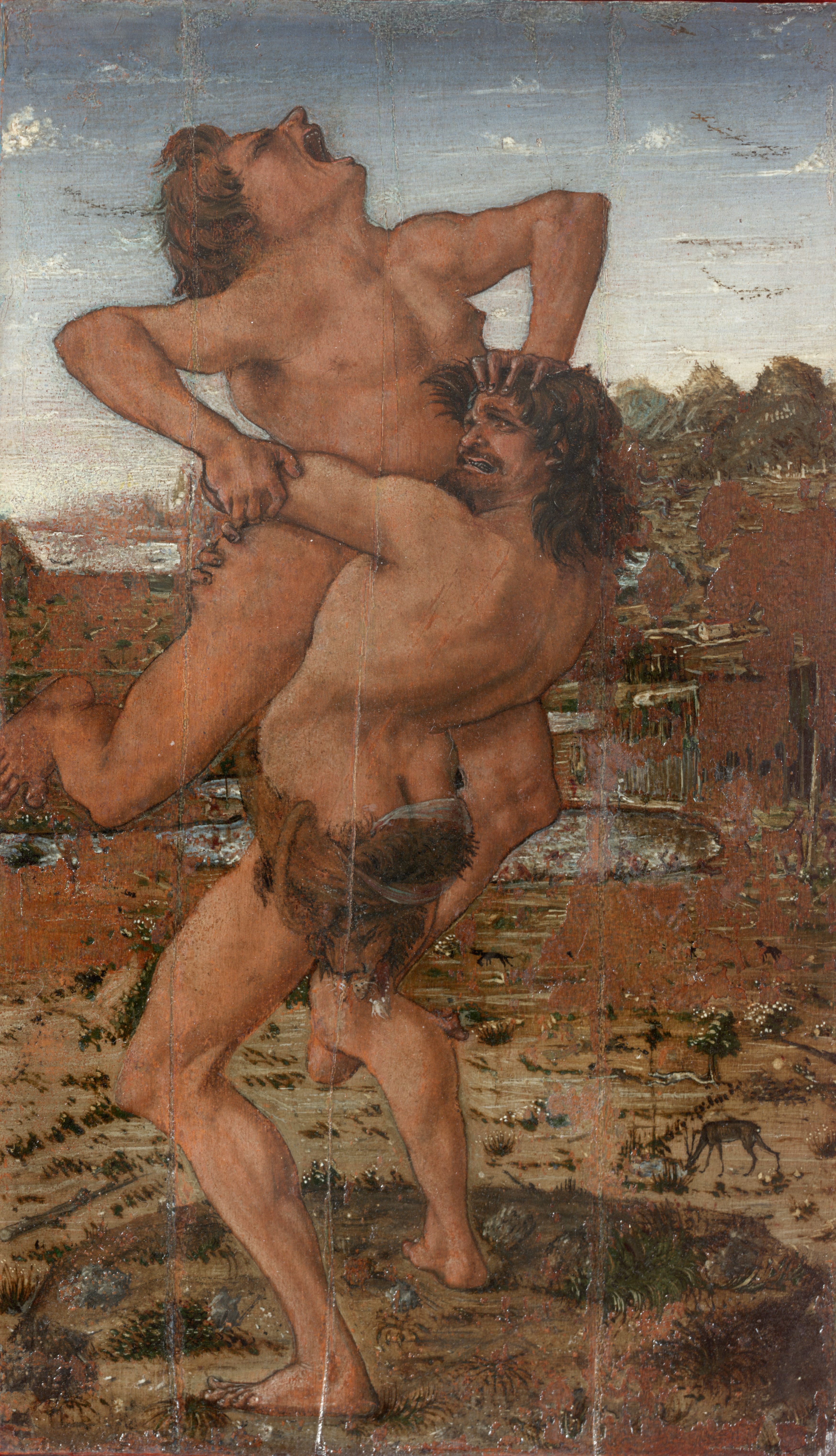 Greek mythology tells that Heracles, or Hercules, in one of his twelve labours defeated Antaeus, a giant of superhuman strength who slaughtered men. The power of Antaeus derived from his contact with the earth, since he was Gaea’s son, the goddess of the earth. For that reason, Hercules, to weaken the giant, lifted him up and killed him with the strength of his arms. The scene effectively recounts the moment before Hercules' victory, with Antaeus screaming as he tries in vain to free himself from the deadly embrace, and Hercules, with his gravity center shifted back to support his weight and his lion's fur pulled down over his hips, contracting all the muscles of his body and face in a final effort. These details prove the in-depth knowledge of human anatomy of the author, Antonio del Pollaiolo, achieved through study of reality and drawing practice.
