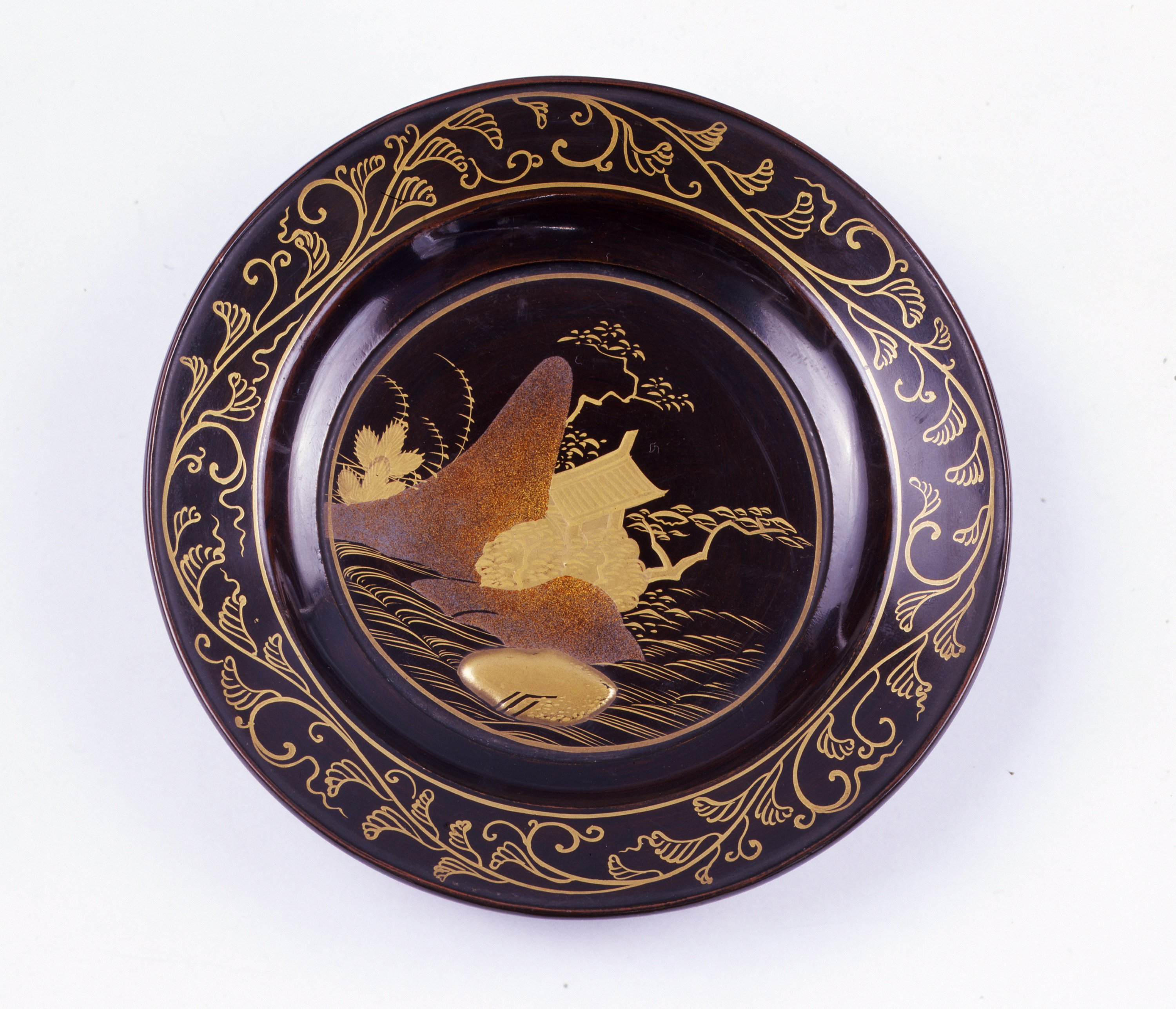 The techniques used to decorate this plate, known as hiramaki-e, or a variation of the maki-e technique. This latter involves an initial application of dark lacquer (usually black) onto the object to create a background for the decoration. The design is then painted in transparent lacquer and before this dries, it is covered in metal fragments to create a metallic design on a dark background. The technique used on this plate involved decoration with gold powder, which was then covered with a coat of clear lacquer.