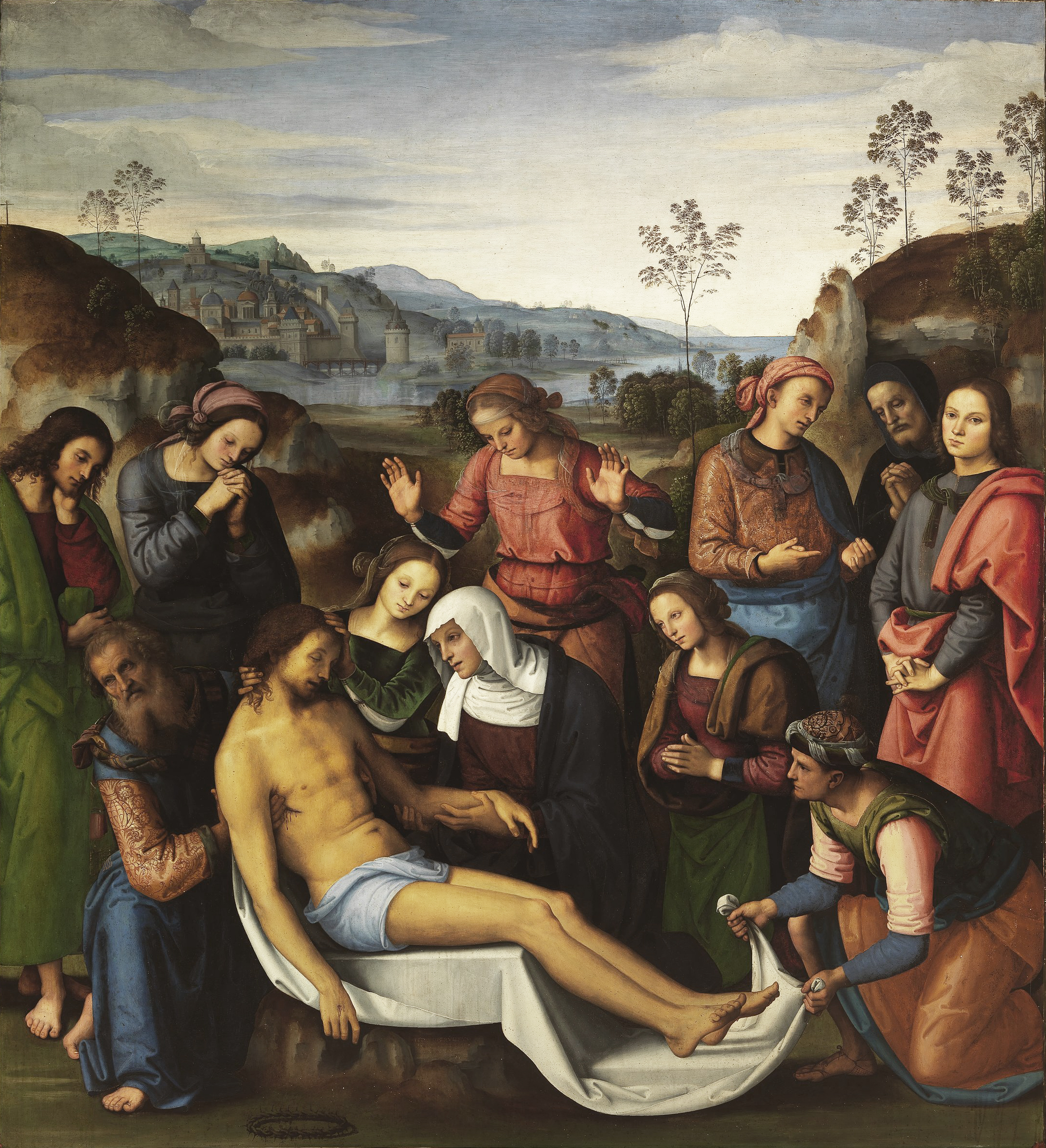 The body of Christ taken down from the cross is lying over a white shroud, supported by Nicodemus on the left and Joseph of Arimathea, who wears an unusual fabric hat decorated with flowers. The Virgin Mary, wearing a veil over her head and a wimple which covers her neck in the style of monastic dress, looks at her dead son along with the Three Marys and Mary Magdalen, who stands behind them dressed in red. The identities of the other characters are less certain, although the young apostle with the red cloak on the right can be identified as John the Evangelist. Although posed in different ways, each figure is party to the sorrow of the event, including the worshiper who would pause to pray before the image to enter a state of meditation. The inclusion of various refined fashion details in the clothes and hairstyles would not only have met with the customer's approval but also helped to engage the viewer’s attention. The melancholy of the composition is accentuated by the evening light and the emotive landscape of rolling hills.