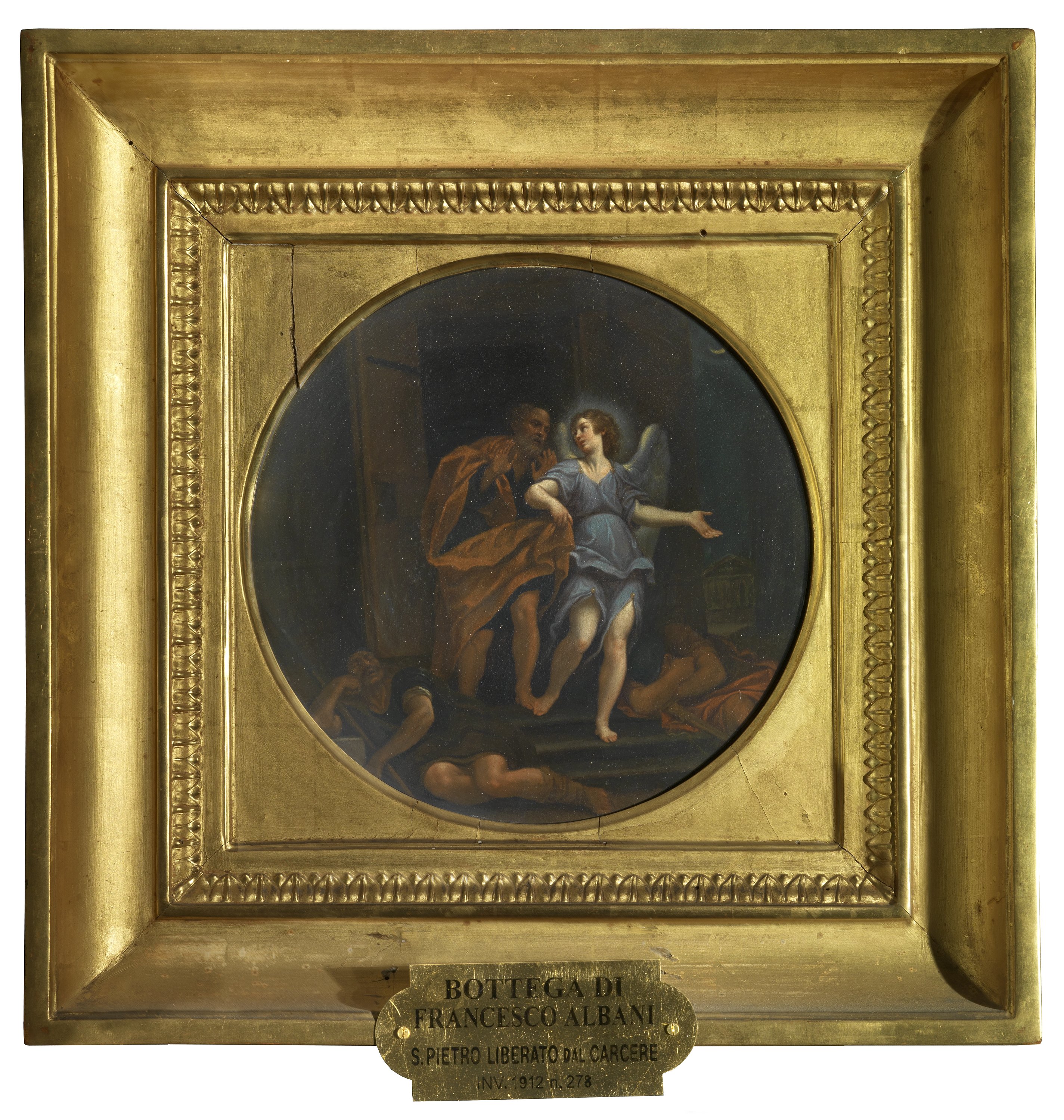 In the Acts of the Apostles (Acts 12:1-19) it is recounted that in the days immediately before Easter, King Herod decided to imprison Peter, the future first pope of Rome, in order to subject him to the judgement of the people on the day of the feast. The night before the trial, while Peter was praying, an angel sent by God came to save him. This is the moment captured on Francesco Albani's canvas: the angel blazing with divine light leads Peter out of prison, passing by the bodies of asleep soldiers. Behind them, on the right and on the left, the presence of two other lights: the artificial light of a torch hidden behind a small window and the natural, cold light of the crescent moon, which makes its way through the clouds and illuminates the old-fashioned architecture in the background of the scene. The composition is inspired by the Liberation of St. Peter frescoed by Raphael in the Room of Heliodorus (the second of the four rooms that were part of the Vatican apartment of Julius II), a subject that thoroughly impressed artists, even after the 16th century, precisely because of the use of diversified light sources, capable of dramatically lighting up the scene and emphasising the feelings of each character.