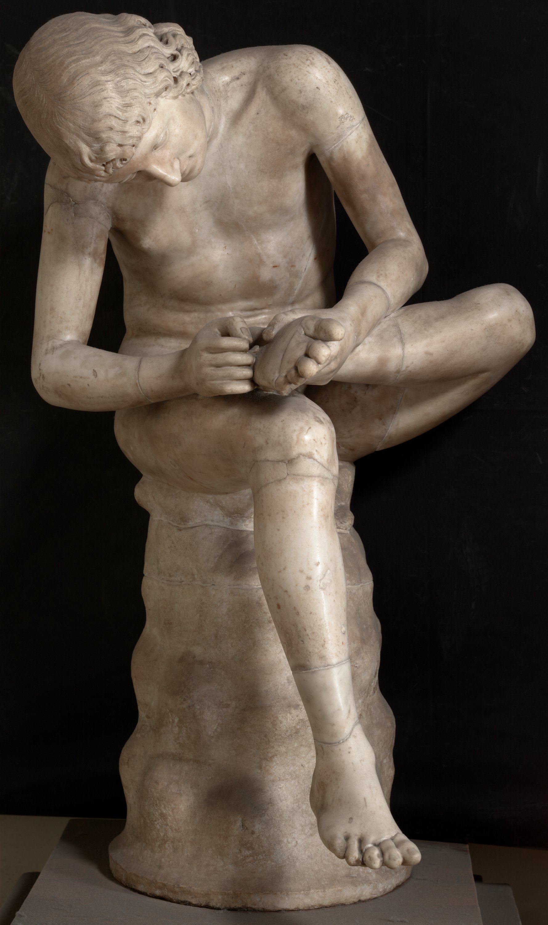 Our sculpture dates back to the 1st century BC. His gaze, is concentrated on his injured foot, his hair caresses his neck and forehead, and his delicately moulded body is that of a young man with tensed muscles, focused on the difficult task of not feeling pain.