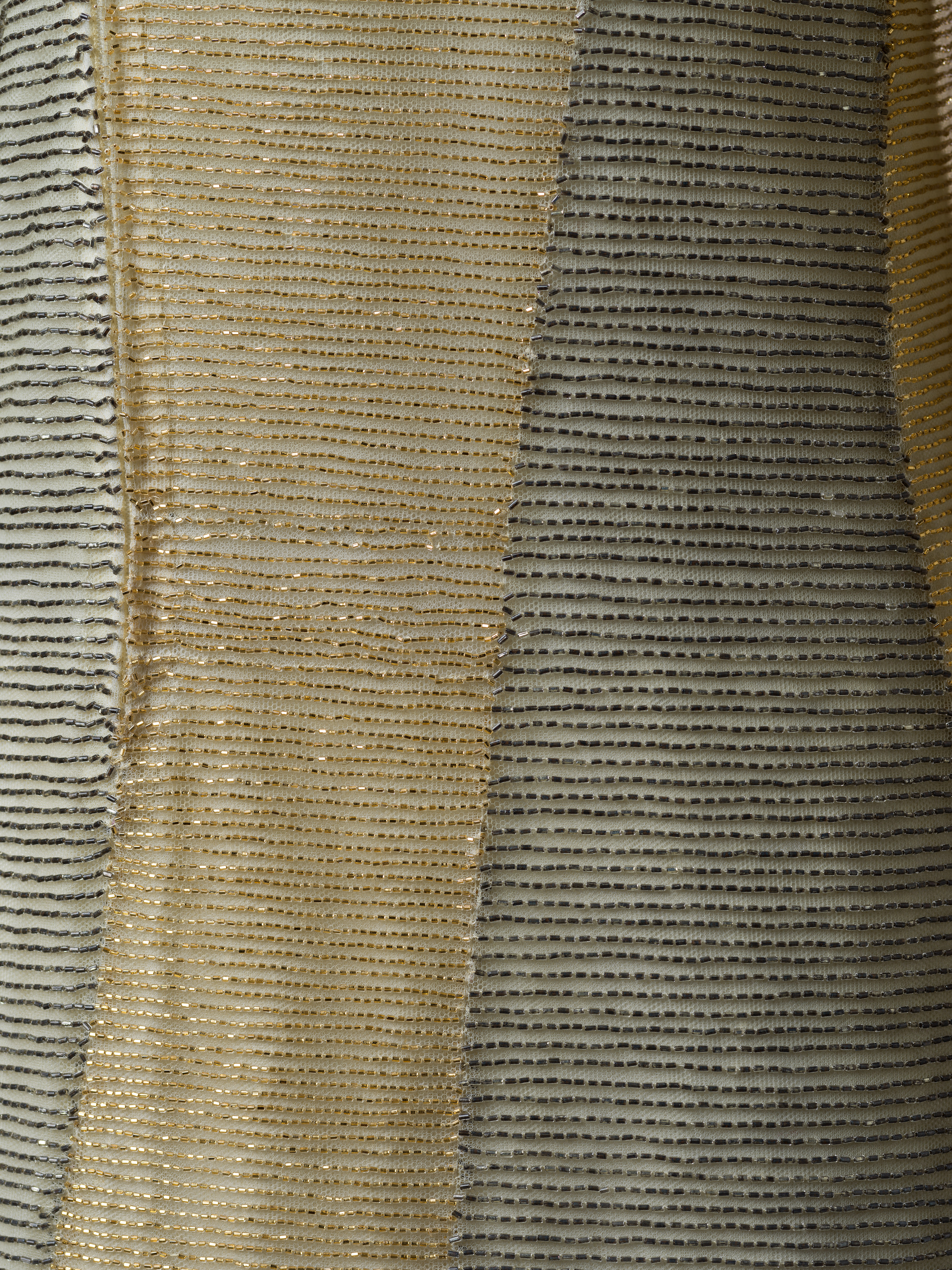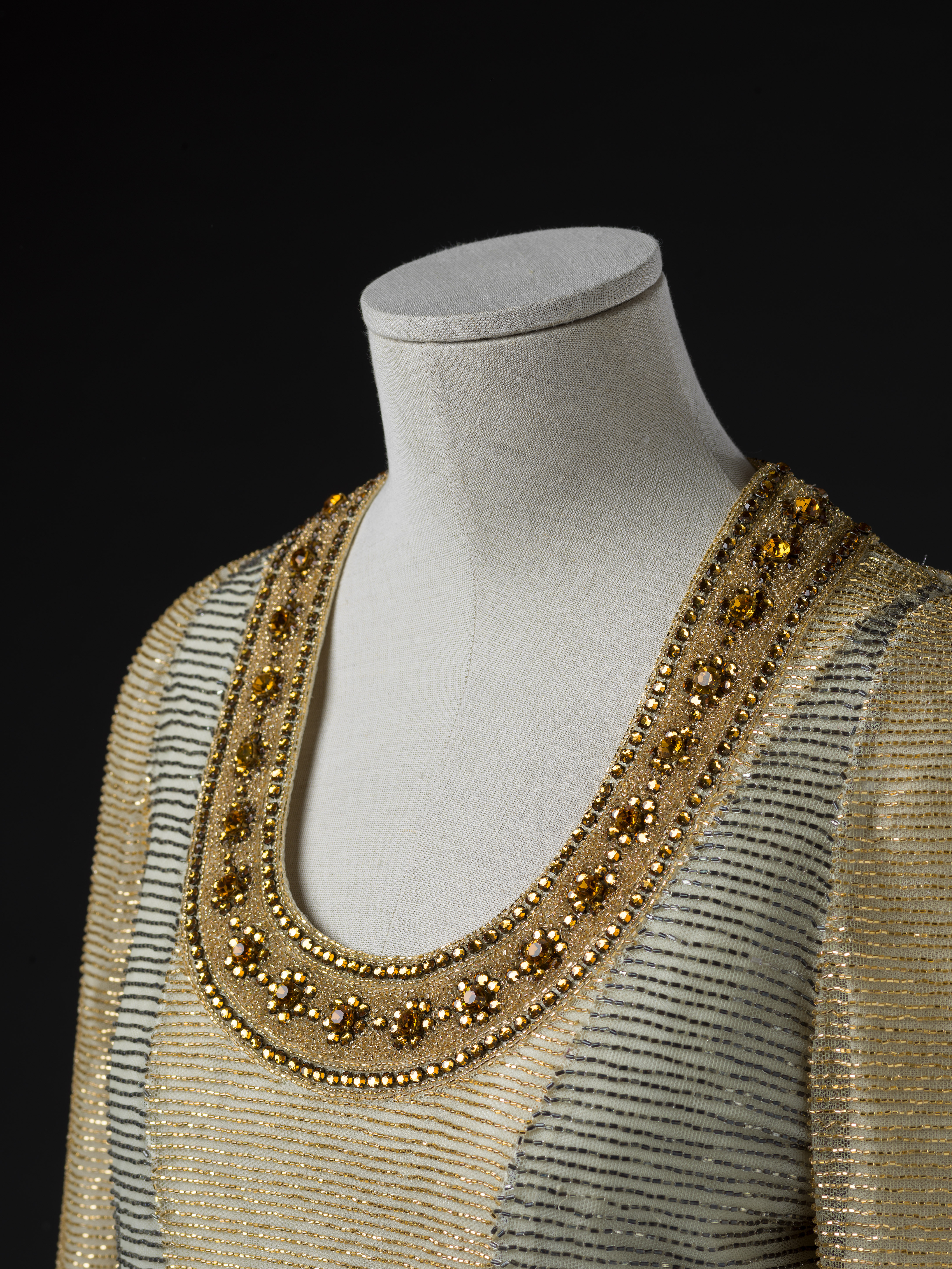 Long dress embroidered on tulle with silver and gold glass bugle beads in vertical waves and a hem adorned with topaz-coloured rhinestones.
