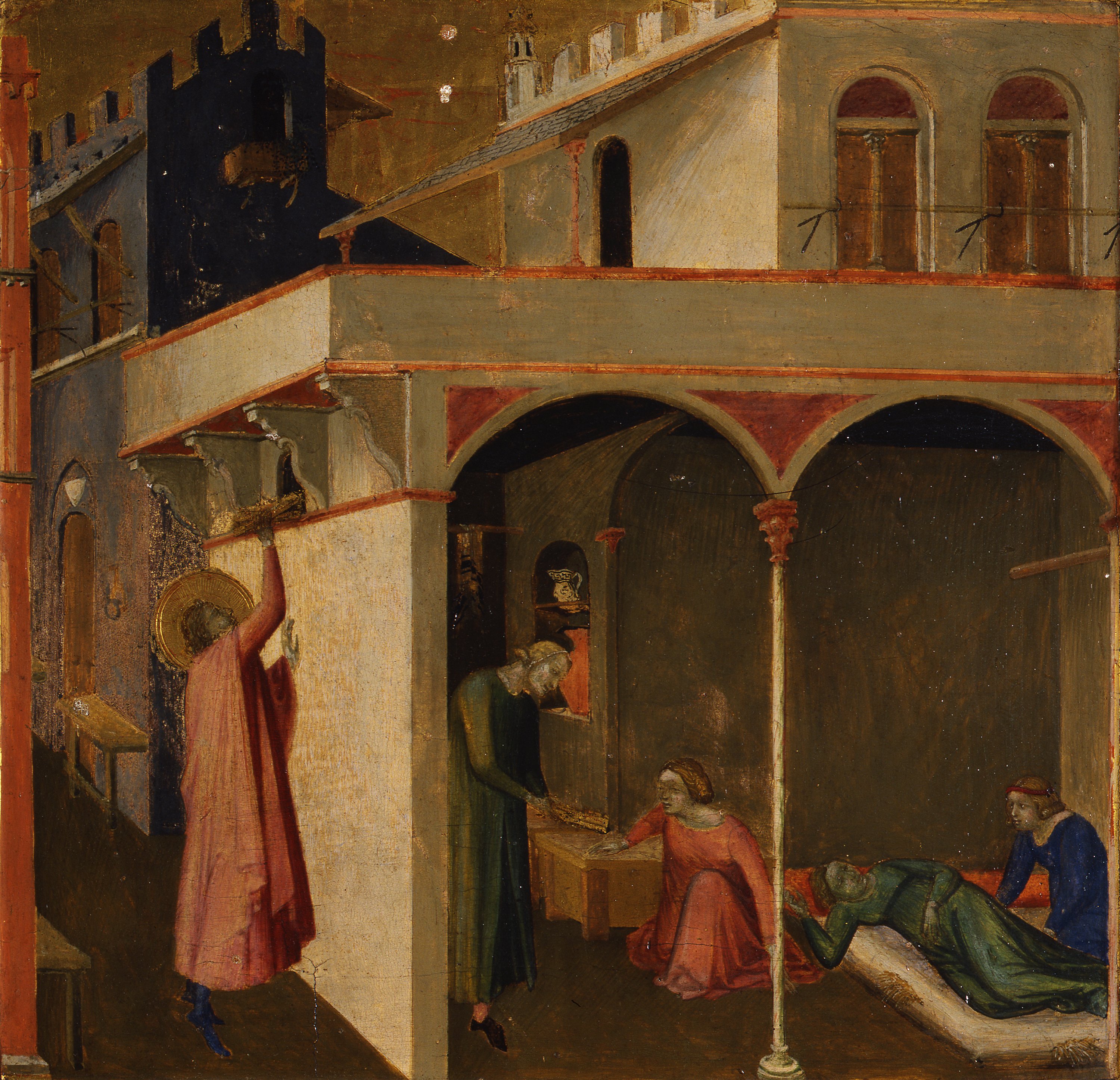The panel is the first part of a cycle featuring four stories of the legend of St Nicholas (see also inv. 1890 no. 8349 ), the overall structure of which still remains a source of mystery today. The presence of hinge-like elements along one of the two sides of both panels suggests that they were the side elements of a reredos probably featuring the figure of the saint in the centre.
