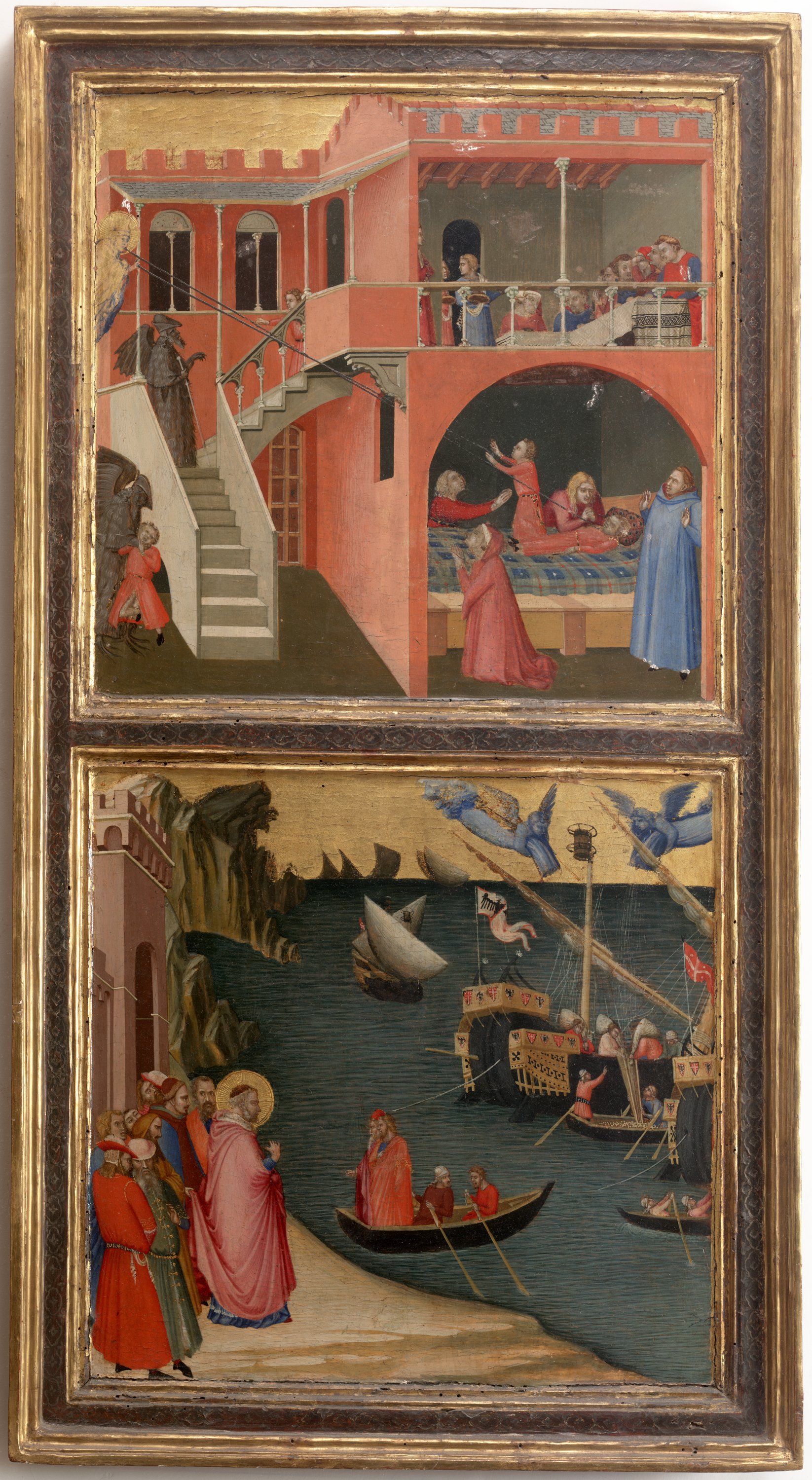 The two episodes portrayed are taken from the life of St Nicholas, bishop of Myra (270-343), narrated in Jacobus de Varagine’s Golden Legend (13th century). In the painting, the story reads from bottom to top.