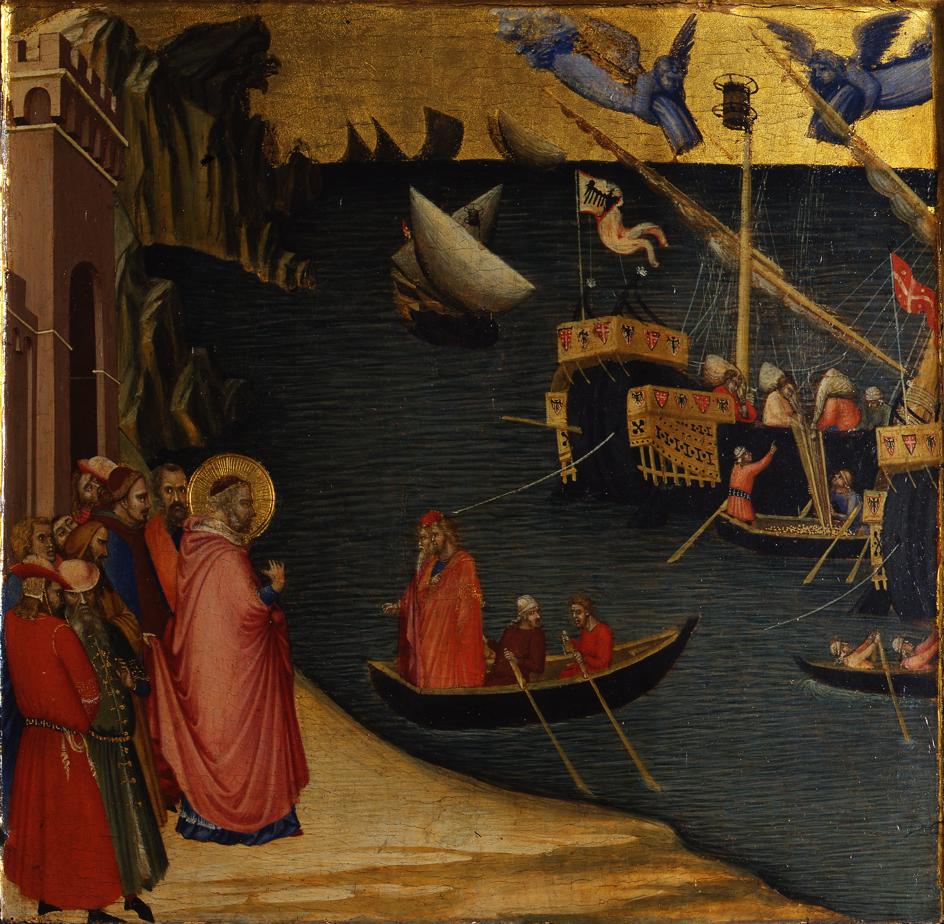 In the first story, the bishop Nicholas is going to the port to ask the sailors of the ships carrying grain to Alexandria in Egypt to give some to the city of Myra, which had been struck by famine. The sailors follow Nicholas’ order and the ships are miraculously replenished with grain, so that when the sailors reach their destination, there are no shortages in their load.