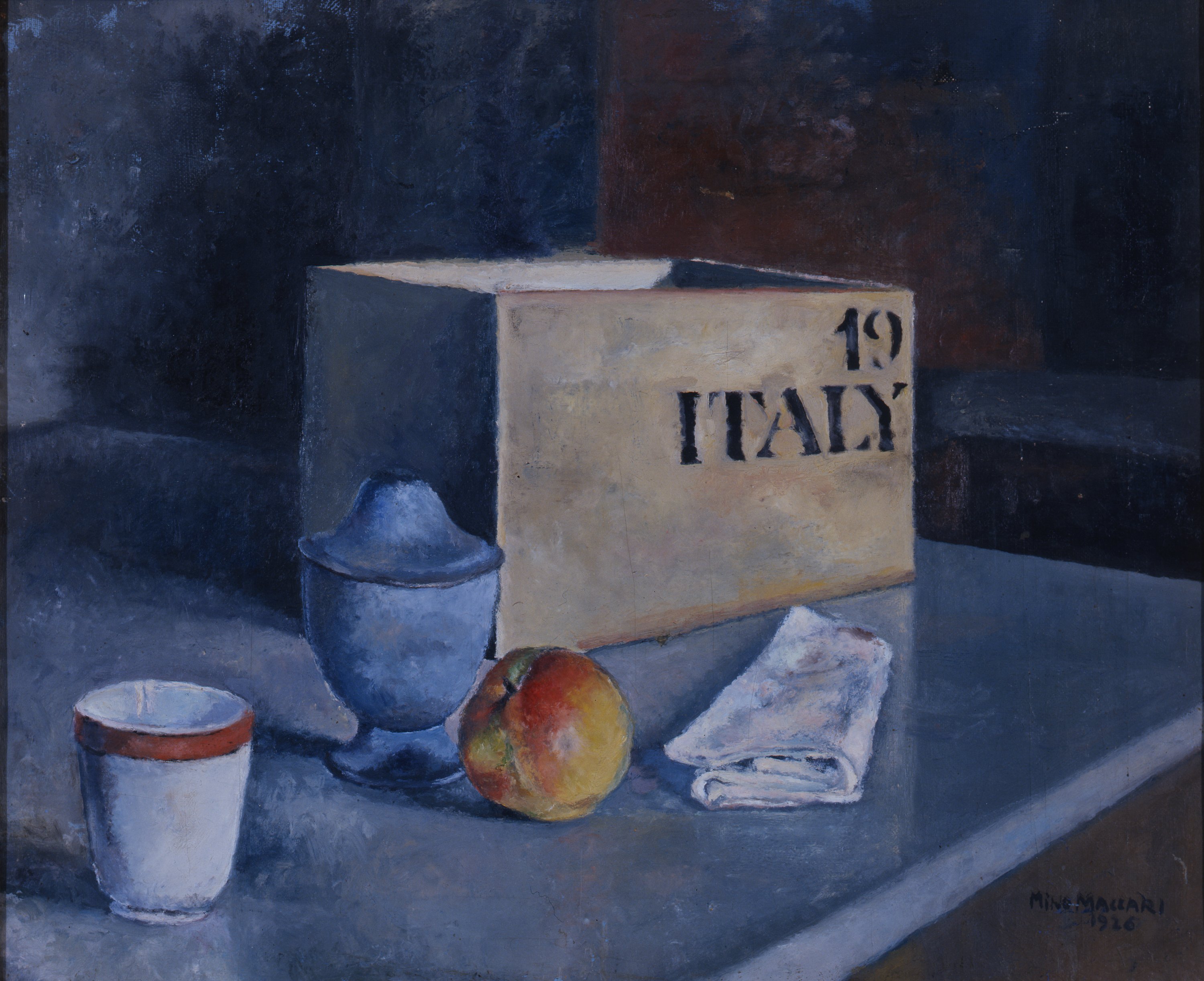 The canvas, dated 1926, documents a temporary rapprochement between Mino Maccari and his friend Ardengo Soffici and the research on form that characterised the early post-war period following the "intemperances" of the Futurist season. The painting almost seems a tribute to Soffici’s “Still Life with Apples and a Glass of Wine” and his “Still Life with Pearss and a Glass of Wine”, the "ovalini" (so called because of their shape), dating back respectively to 1919 and 1920. In those works, Soffici returns to meditate on Cézanne no longer as the father of the avant-garde but as a model for a type of realism anchored in nature, in a line of tradition that spanned from the Macchiaioli to as far back as Masaccio. It was a vision that combined the pursuit of the true and the simple with an open disposition towards the common man and the masses, who often remained alien to the elitist poetics that had marked the turn of the century. This new sensitivity also marked the birth of the magazine "Il Selvaggio" in 1924, of which Maccari was the main animator until 1943. His intense production of drawings and engravings for the publication were often satirical, perfectly combining image and text. The similarity of the canvas to Soffici's style was framed by the events of 1926, when the editorial staff of "Il Selvaggio" were moved to Florence, and Maccari gave the magazine a "strapaesana" or ultra-rural makeover, contemplating, under the aegis of his friend, the exaltation of the traditions and customs of the Italian rural province. However, the artist’s desire to leave his own mark proved unwavering and he breaks the silent, precious vision of the foreground by adding the printed wording "19 / ITALY" a reference - probably with the intent to mock - to the Futurist pasts (now disowned) of many of the standard-bearers of twentieth-century classicism.