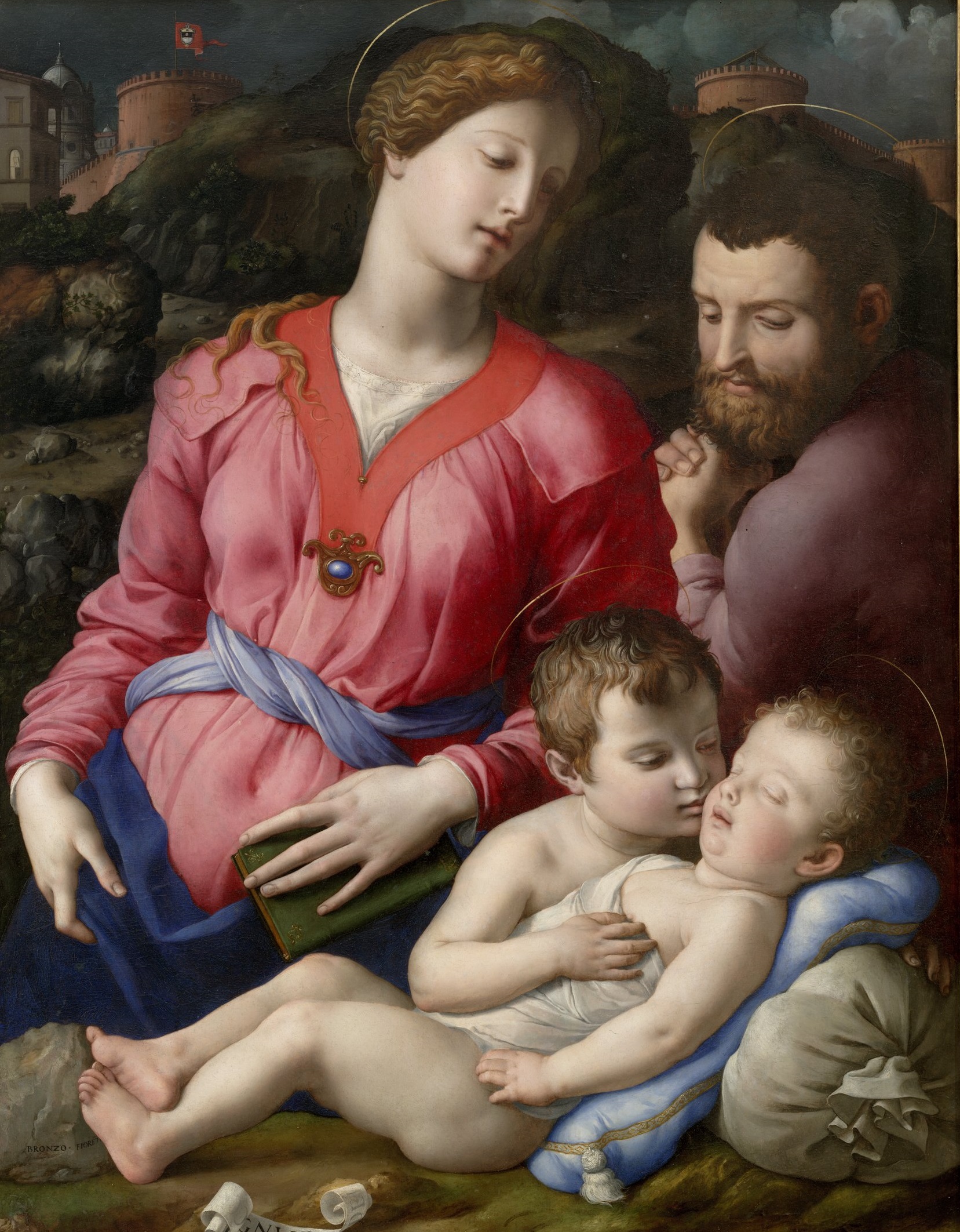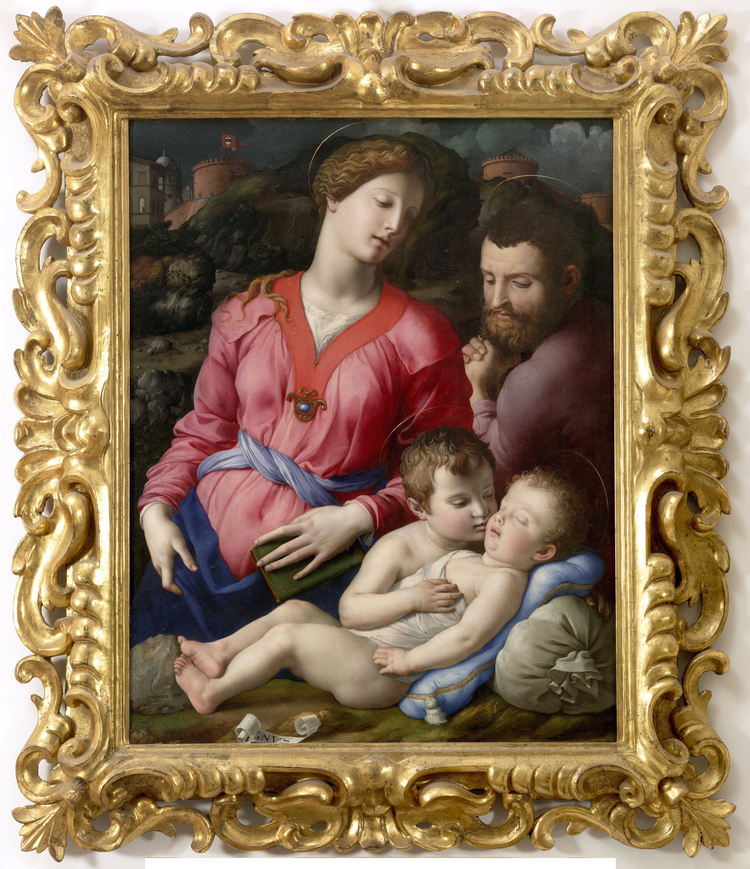In a suspended atmosphere, as if outside of time, Mary and Joseph keep watch over the sleeping Jesus, lying on a pillow to soften the hardness of the travel sack and cuddled by St. John who gently reaches out to touch his cheek. The little boy's gesture is not restricted to that family moment, but also becomes a premonition of the destiny of martyrdom that awaits both of them, John at the hands of Herod and Jesus on the cross. This is why the cloth that wraps the Child's body is a figure of the shroud, and the stone he points his feet against is a symbol of his tomb. The iconography of the scene intertwines the theme of the Holy Family and that of the Flight into Egypt, which medieval and Renaissance sources, with the intention of enriching the bare Gospel account, identify as one of the very first occasions Jesus and Saint John met. Behind them, the landscape of rocks slowly slopes down, bordering the view of a city with its walls and towers, domes and palaces. On the left keep there is a banner with the black and silver split coat of arms with a crossed ball in the upper part, the coat of arms of Bartolomeo Panciatichi, descendant of a family of ancient tradition, merchant, scholar and very faithful official of Cosimo de' Medici. Bartolomeo was one of Bronzino's most passionate patrons who, according to Vasari, painted at least five paintings for him which have now all been identified: in addition to this one, there are portraits of in the collections of the Uffizi Galleries (Inv. 1890, no. 741) and his wife Lucrezia (Inv. 1890 n. 736), the Holy Family now in Vienna (Inv. GG_183, Kunsthistorisches Museum), the crucified Christ now at the Musée des Beaux-Arts in Nice (Inv. N.Mba 196)