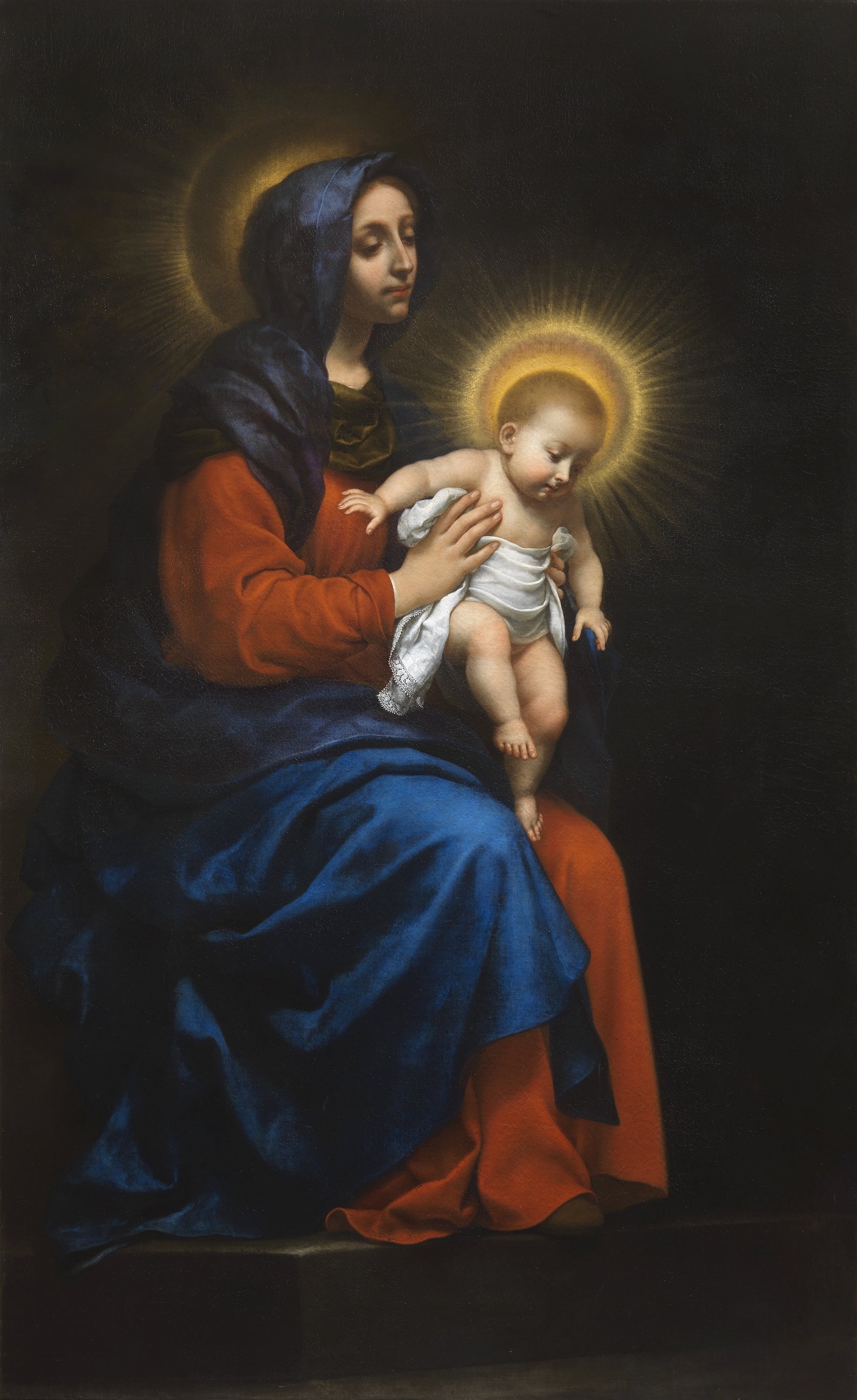 The composition, of which today we only see the Virgin with the standing child, is actually part of a larger horizontal canvas, depicting the Adoration of the Magi. This was verified during the restoration carried out in 2015 on the occasion of the Carlo Dolci exhibition thanks to X-rays that revealed the presence of a male figure, identifiable as the wise man Melchior, kneeling on the right and in a direct line with the gaze of Mary and Jesus. This explains the diagonal placement of mother and son, a feature of a consolidated 17th-century iconographic model representing the arrival of the Wise Men at the stable and used by Dolci more than once, with variations on the format (London, National Gallery; Stamford, Burghley House Collection, Glasgow Kelvingrove Art Gallery). As in the other versions, the Palatine Gallery painting should have had a different background but was covered with a uniform brown layer in order to isolate the two main figures, like a sort of large “holy card”.