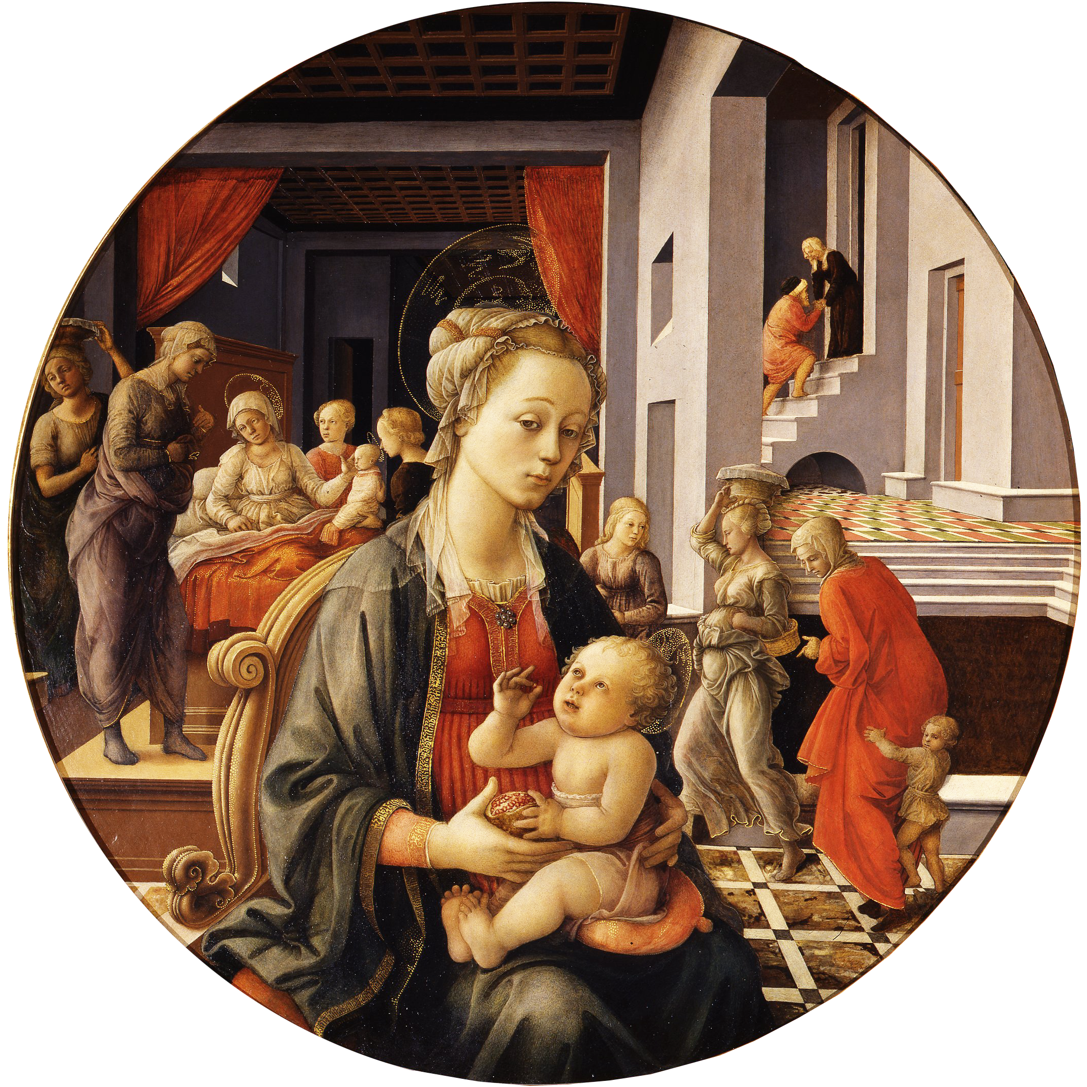 This painting, one of the most original works on a holy theme from the early Renaissance, shows the Virgin Mary in the foreground. The Virgin is seated on the throne with the Child on her knees, in the act of removing seeds from a pomegranate that she holds out to him, a symbol of fertility and a premonition of the Passion. Behind the traditional Virgin and Child group, inside a palace are depictions of two episodes of the life of St Anne, Mary’s mother. On the right side, Anne’s meeting with her husband, Joachim, is depicted on a staircase. On the left side, the birth of the Virgin is shown, with Anne in a bed, surrounded by women to look after her and the newborn, as well as bring gifts. This is a truthful portrayal of daily life for women in the wealthier classes of the 15th century. The different sizes of the figures (with Joachim and Mary being the smallest in the episode showing their meeting, middle-sized for the persons present at the birth of Mary and largest in the depiction of Mary and the Child in the foreground) measure as well as the spatial depth, the temporal distance between the three moments. Filippo Lippi is able to harmonise the single parts of the story, narrated with extraordinary synthesis and unified by the architectural structure with its Renaissance flavour. There is a tendency to place this piece in relation to some documents from 1452-1453, where Filippo Lippi is appointed to paint a tondo work for Leonardo Bartolini Salimbeni (1404-1479), likely destined to his residence. Indeed, the circular shape was often used for holy paintings to be hung in the home during the 15th century, in addition to the fact that the subjects depicted are quite fit for a family environment. On the back of the painting is an outline of an emblem that shows a gryphon, which had not yet been identified.