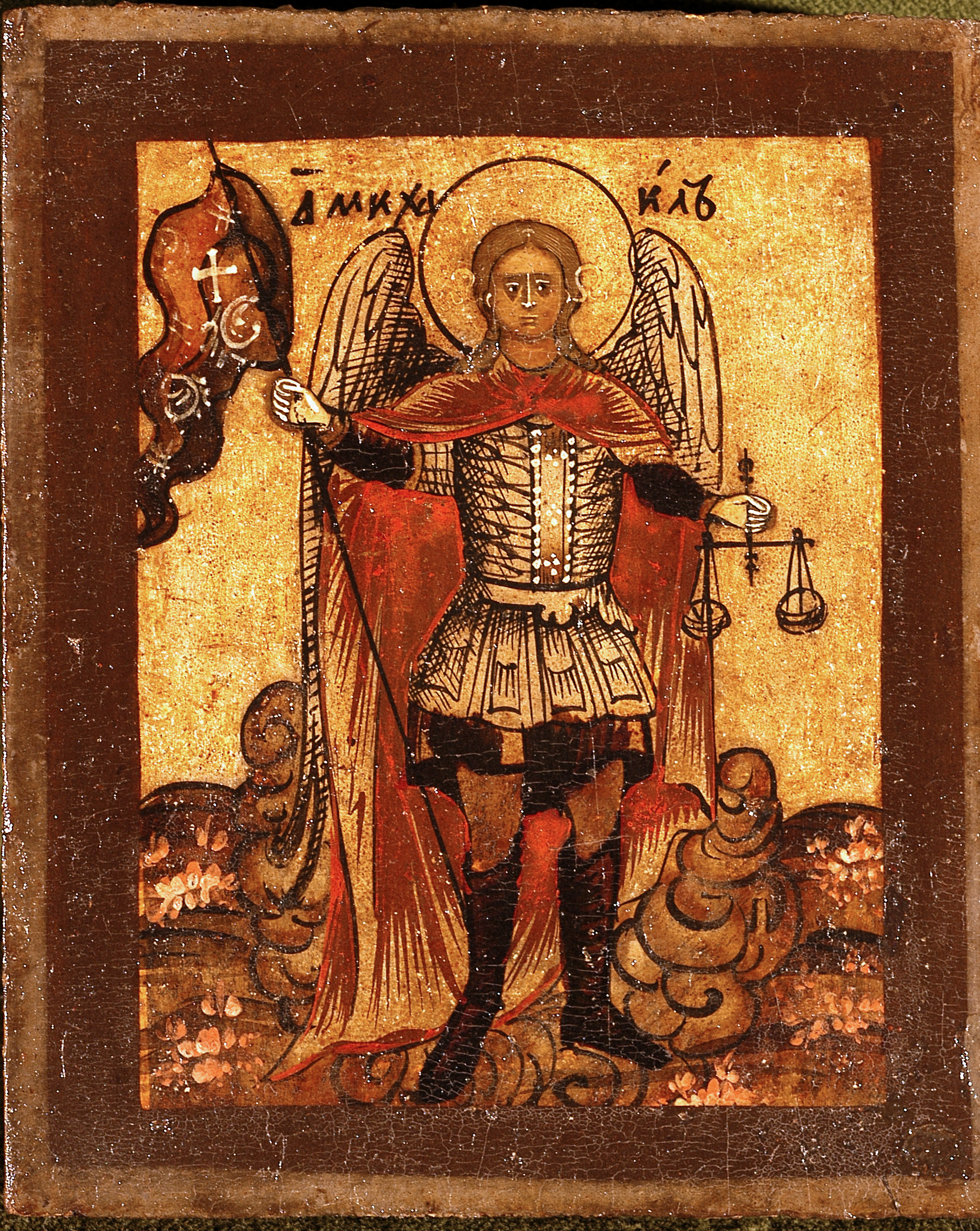 This icon depicts St. Michael the Archangel, canonically represented in warrior's clothing wearing a red mantel embellished with gold highlights over his shoulders. In his right hand he holds a red flag with a white cross, while in his left he holds scales, an instrument for weighing souls. According to the story in Revelation (Rev. 12: 7-8), archangel Michael, commander of the heavenly legions, fights against the rebellious angels and defeats Satan. This is why he is depicted in warrior clothing and almost always with a spear or sword in his hand. The banner is quite unusual, unlike that of the scales, which refer to the tradition in which the archangel would be the defender of the just during the Last Judgement, tasked with accompanying and weighing the souls of the dead before God.